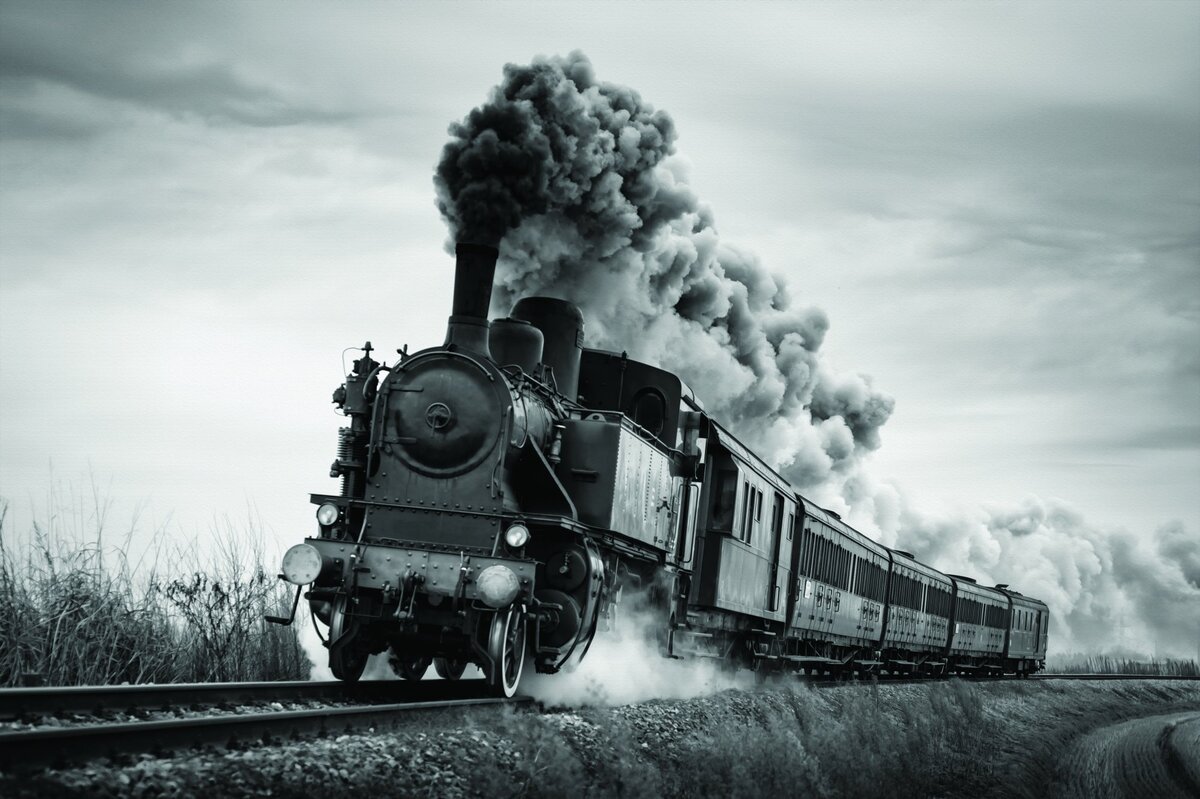 Fototapete: Schwarz-weißes Foto einer fahrenden Dampflokomotive