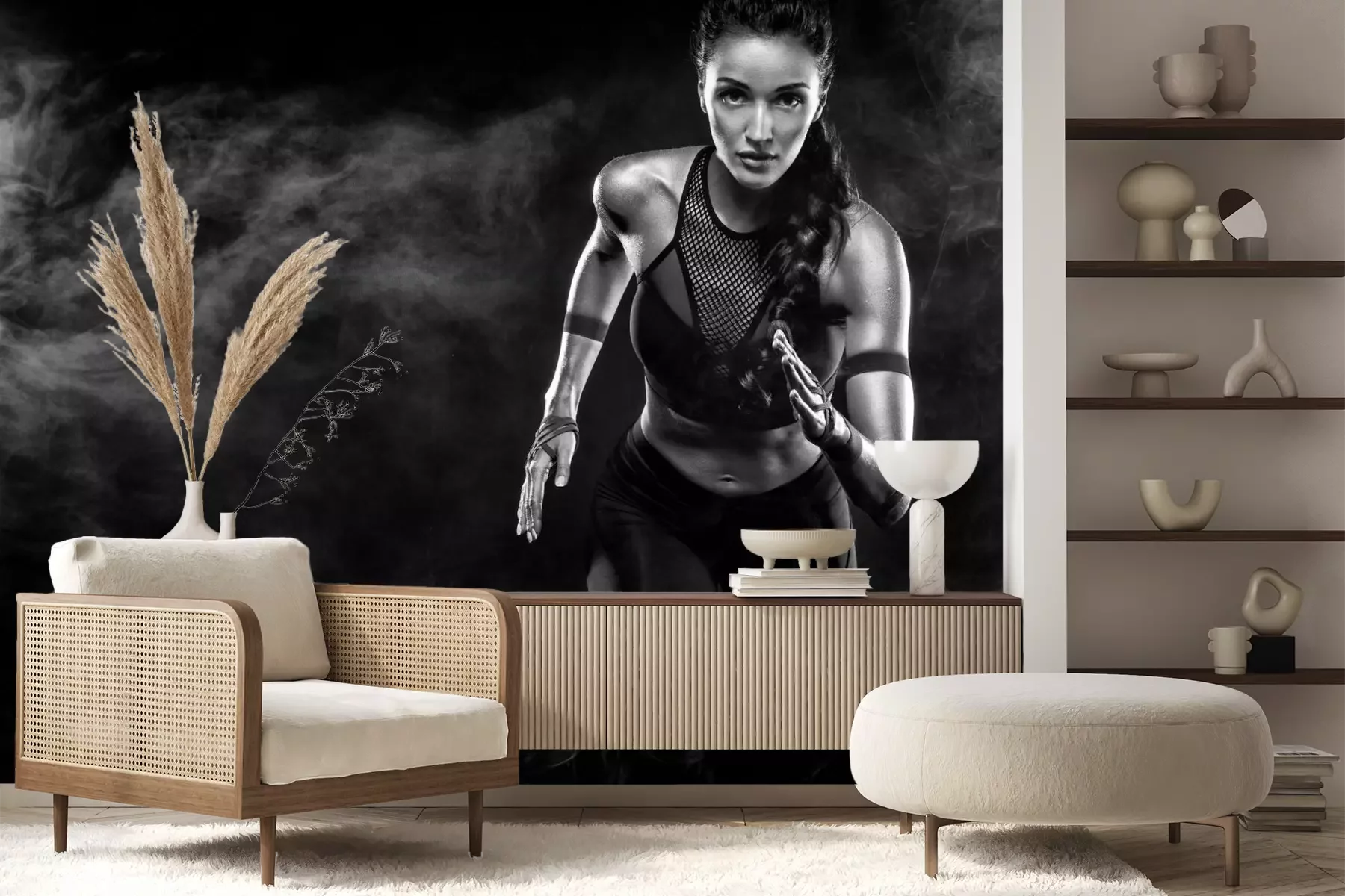 Das Material Premium+ besteht aus einer strukturierten Vinyl-Oberschicht und einem Trägermaterial (Vlies) mit einer Grammatur von 255 g/m², das kleine Unebenheiten der Wand zuverlässig kaschiert. Die feine Sandstruktur verleiht der Oberfläche eine luxuriöse Haptik, während das halbmatte Finish die Tiefe der Farben betont. Das Material ist dampfdurchlässig – so kann diese Fototapete auch in Küchen und Badezimmern eingesetzt werden. Die maximale Breite einer Tapetenbahn beträgt 100 cm. Bei größeren Abmessungen besteht die Fototapete aus mehreren gleich großen Bahnen. Der Kleber wird direkt auf die Wand aufgetragen, und die Fototapete wird auf Stoß angebracht, was für einen ästhetischen Effekt ohne sichtbare Fugen sorgt. Die Oberfläche ist pflegeleicht und kann bei Bedarf sanft mit einem feuchten Tuch abgewischt werden.
