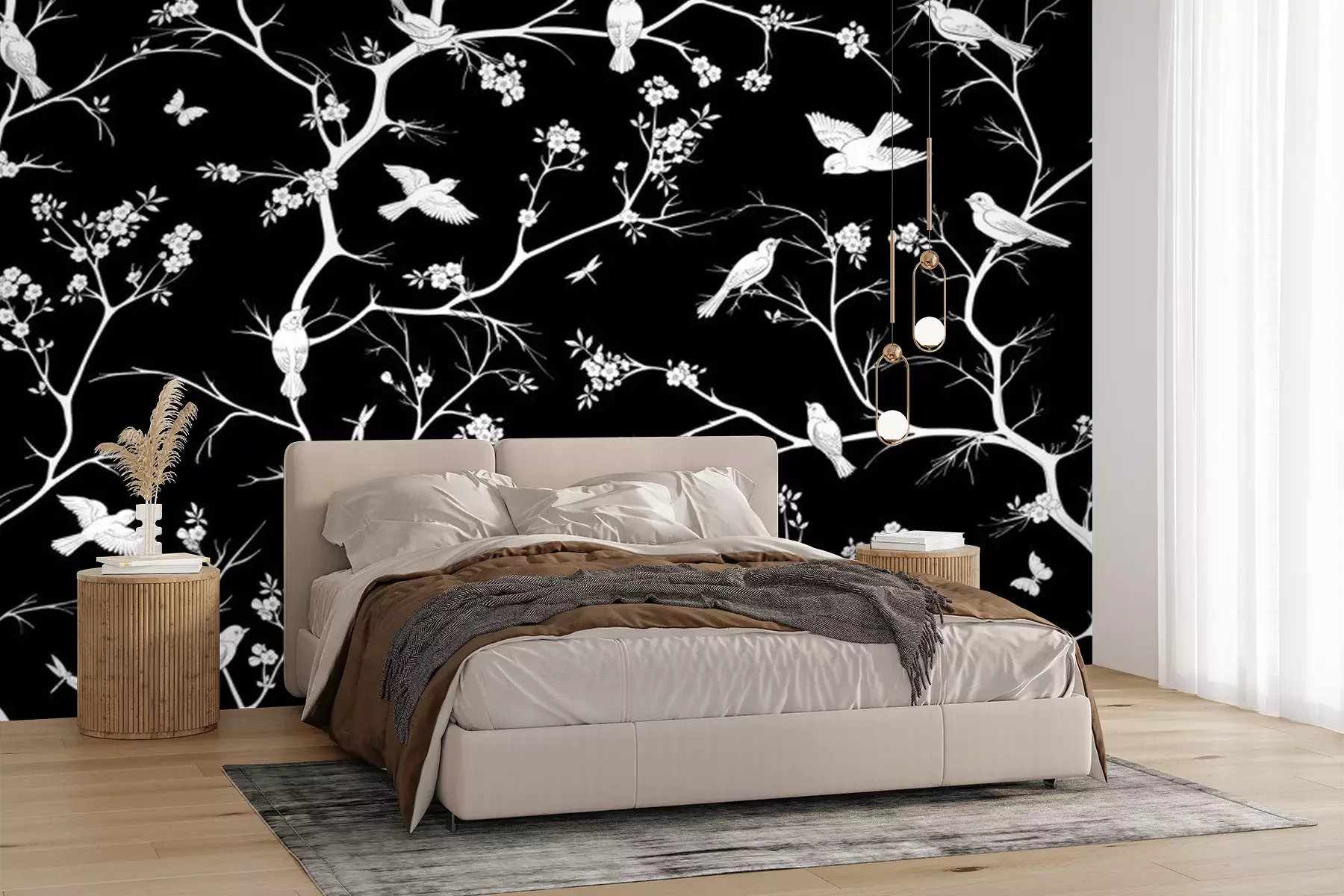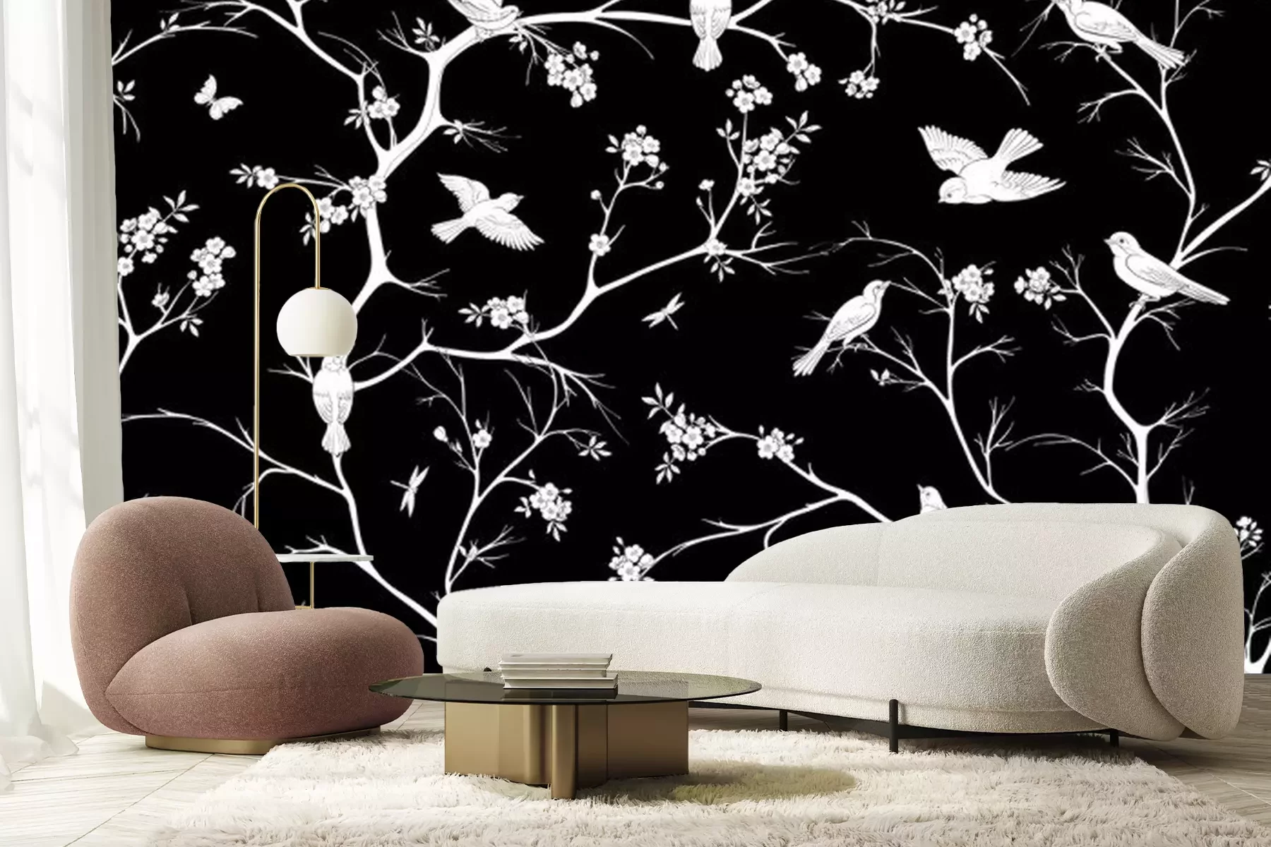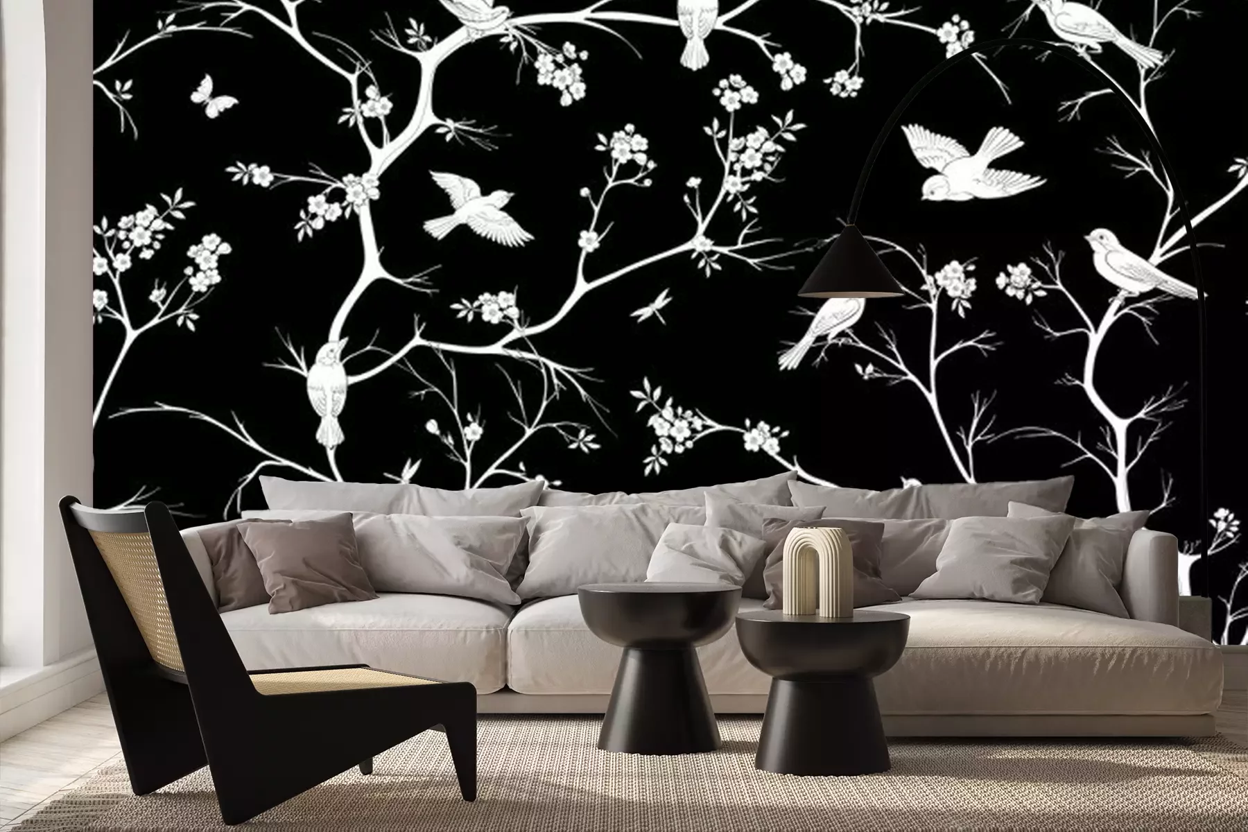 Fototapete Schwarzes Chinoiserie-Motiv mit Vögeln und Baum