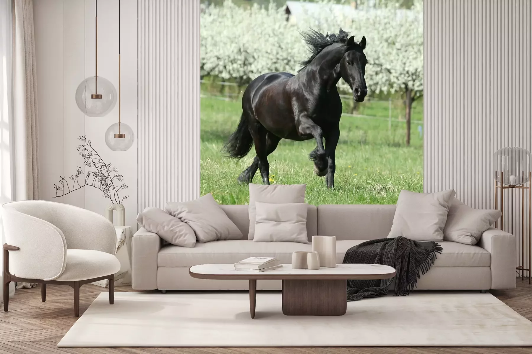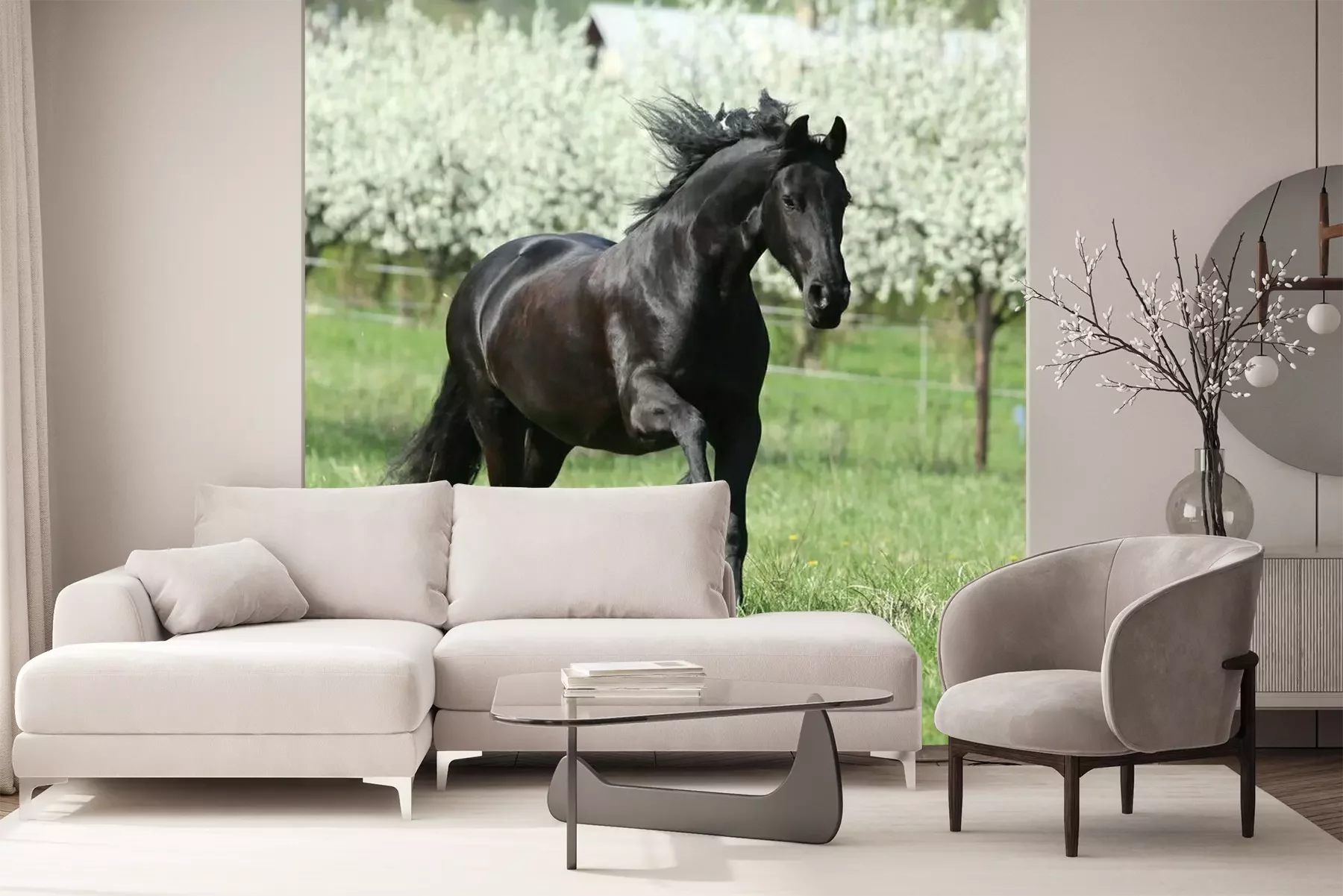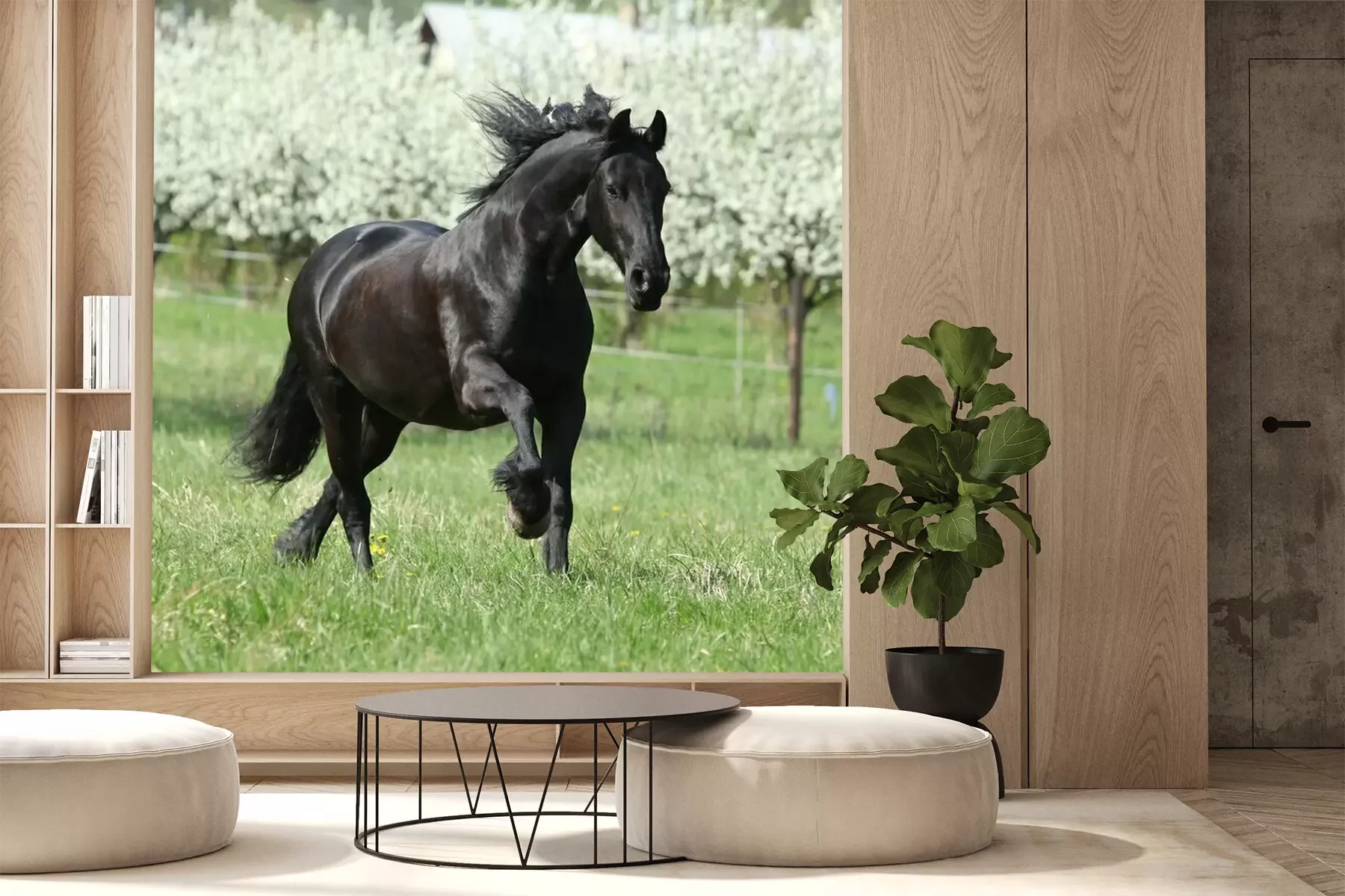 Fototapete Schwarzes pferd im hintergrund der bäume