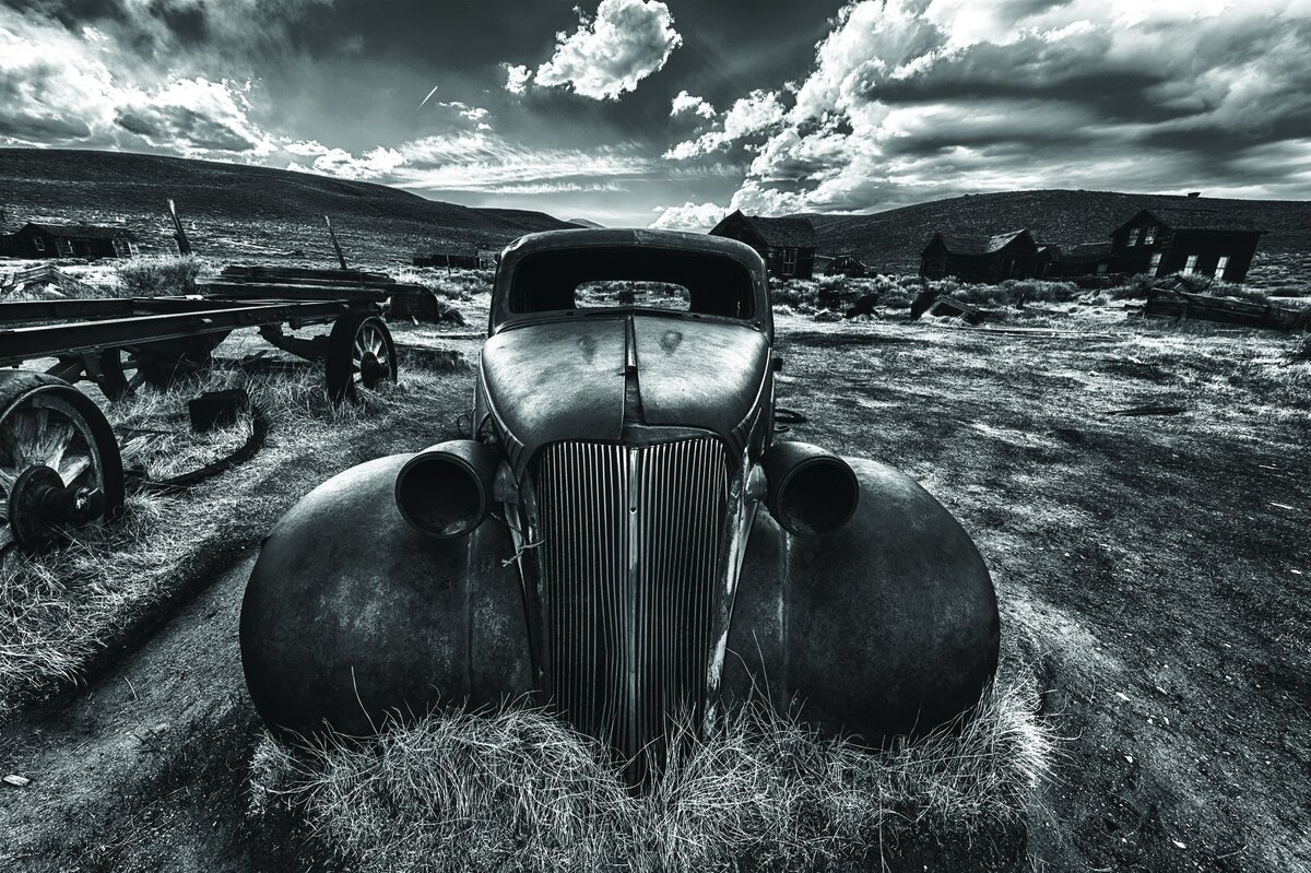 Fototapete: Schwarzweiß-Foto eines Autowracks