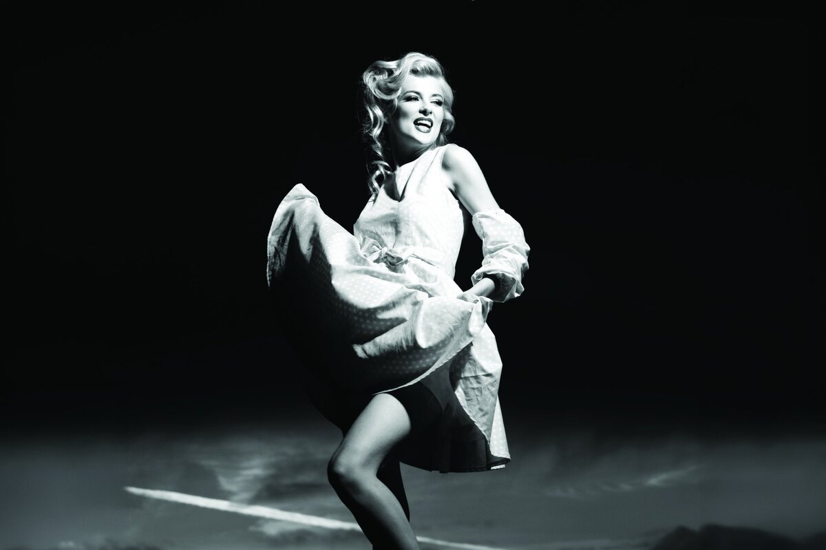 Fototapete: Schwarzweißfoto einer Frau in einem Kleid im Monroe-Stil