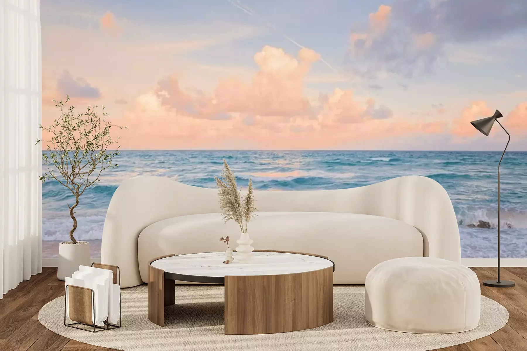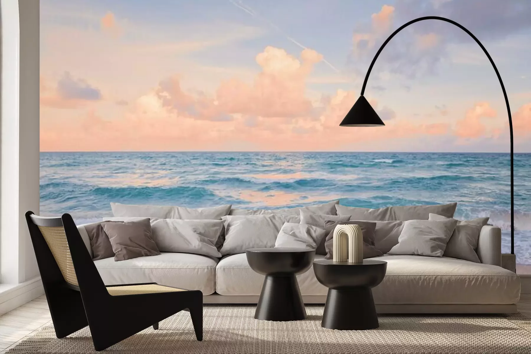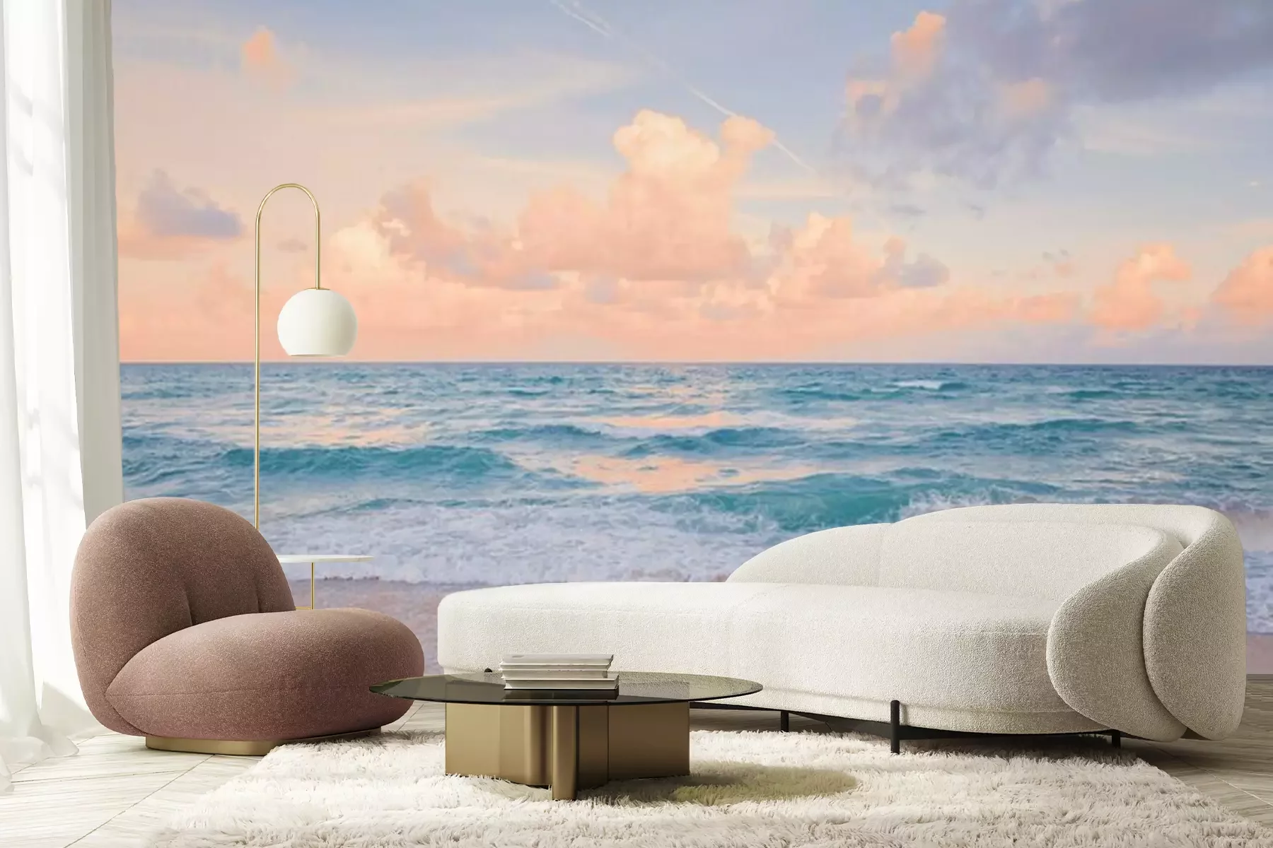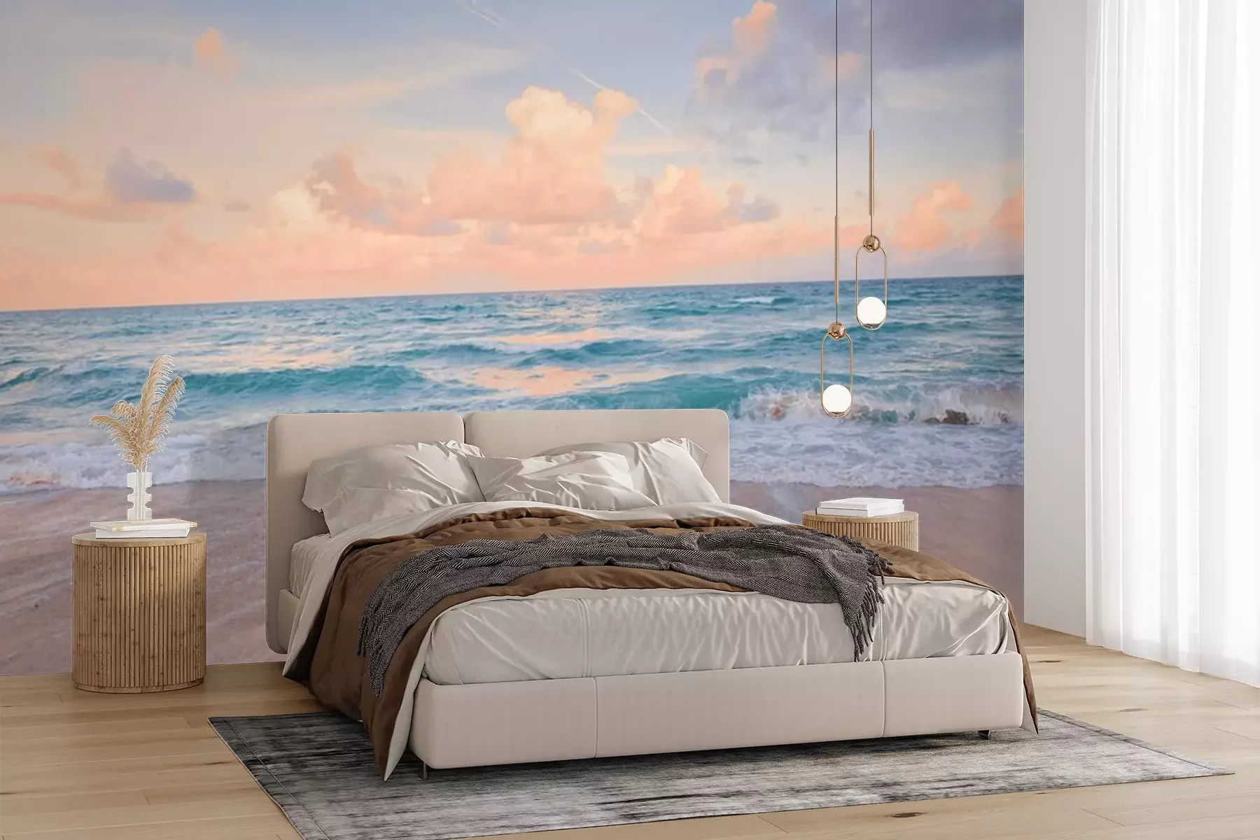 Fototapete Sea ocean beach sunset sunrise landscape outdoor. Water wave with white foam. Beautiful sunset airy red sky with clouds. Natural aquatic blue pink turquoise aquamarine colorful background.