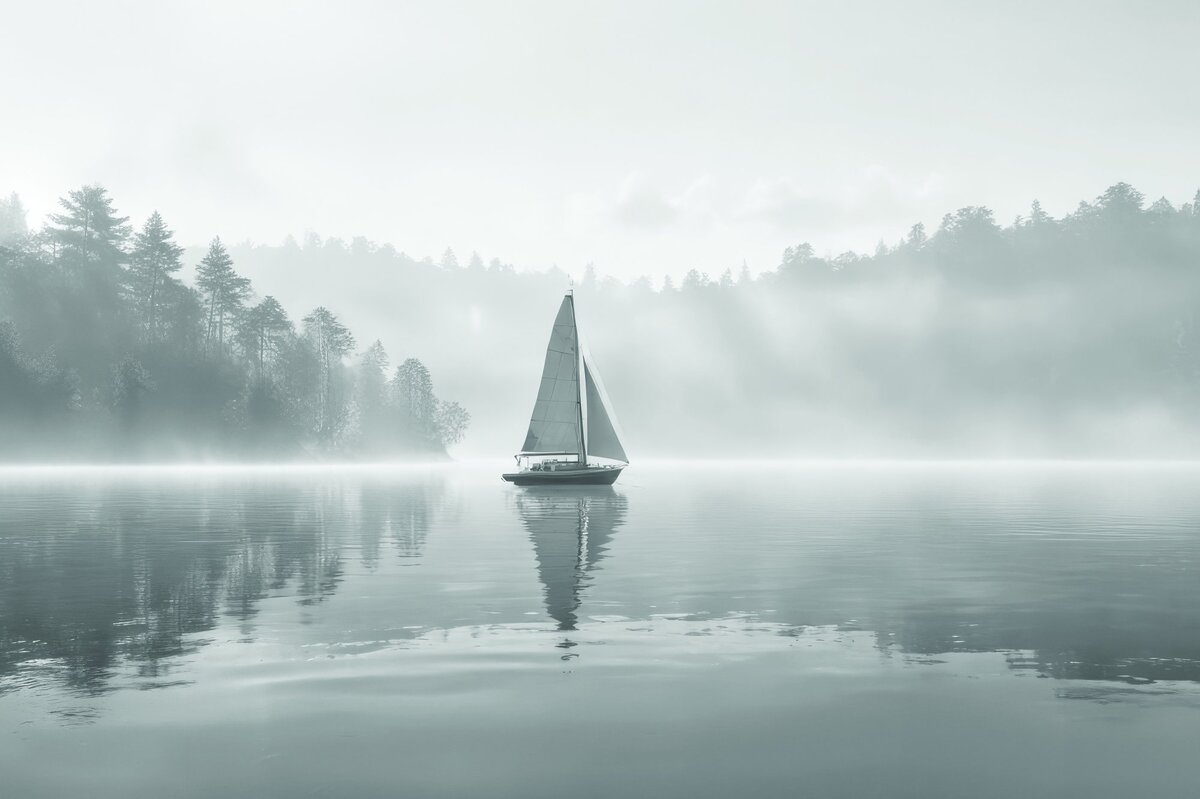 Segelboot vor dem hintergrund eines nebligen grauen waldes