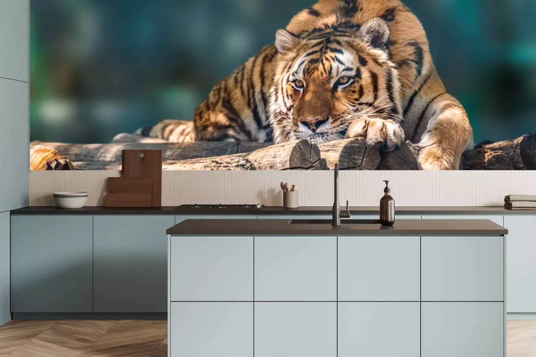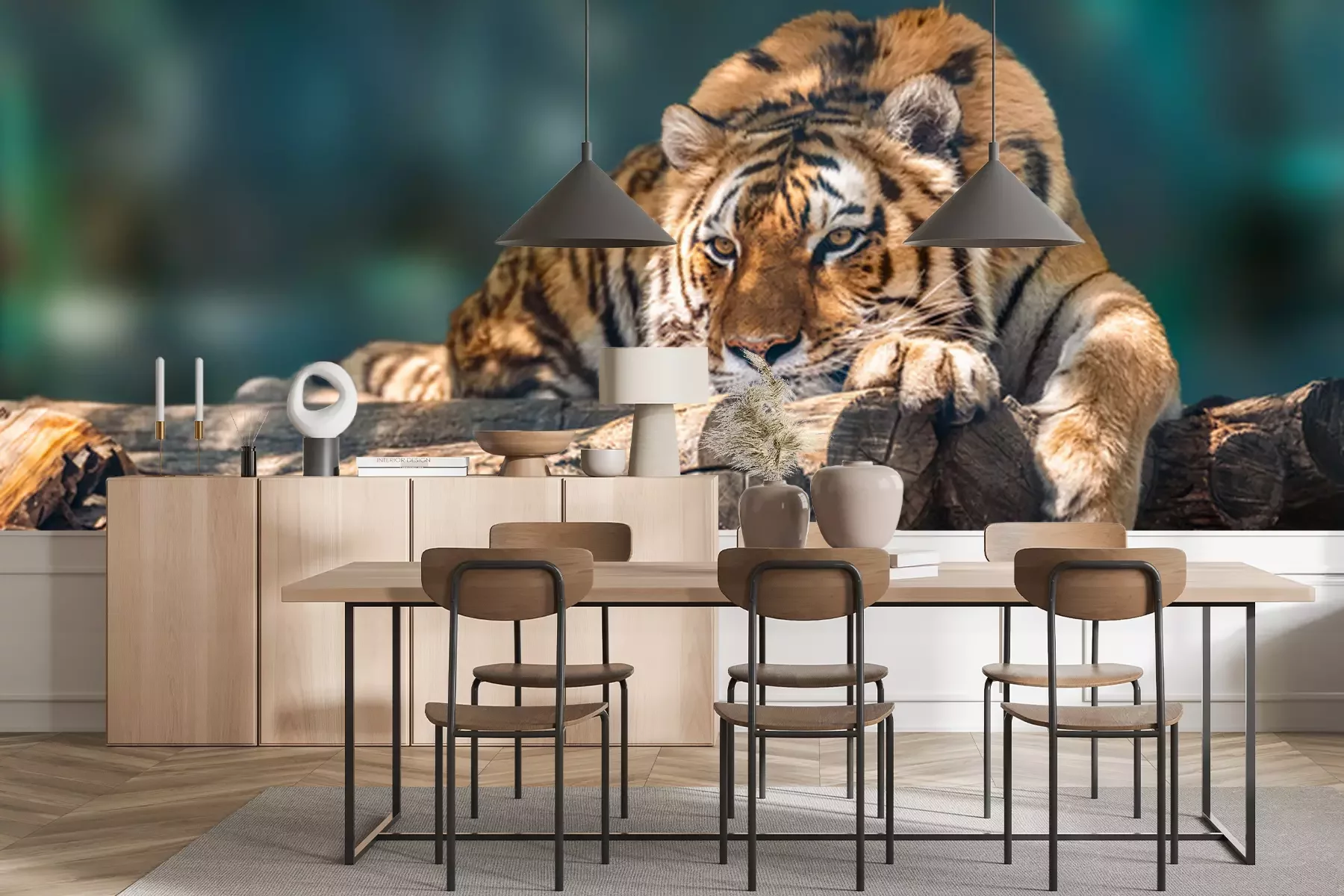 Fototapete Sibirischer Tiger mit schwarzen Streifen auf Holz liegend