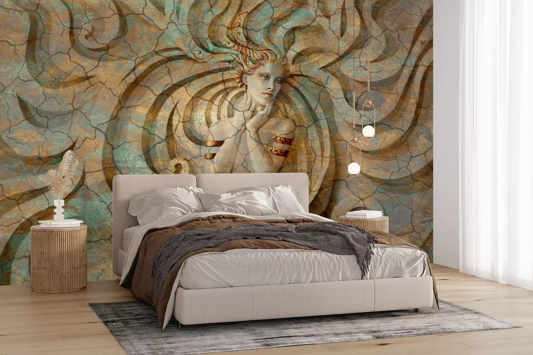 Das Material Premium+ besteht aus einer strukturierten Vinyl-Oberschicht und einem Trägermaterial (Vlies) mit einer Grammatur von 255 g/m², das kleine Unebenheiten der Wand zuverlässig kaschiert. Die feine Sandstruktur verleiht der Oberfläche eine luxuriöse Haptik, während das halbmatte Finish die Tiefe der Farben betont. Das Material ist dampfdurchlässig – so kann diese Fototapete auch in Küchen und Badezimmern eingesetzt werden. Die maximale Breite einer Tapetenbahn beträgt 100 cm. Bei größeren Abmessungen besteht die Fototapete aus mehreren gleich großen Bahnen. Der Kleber wird direkt auf die Wand aufgetragen, und die Fototapete wird auf Stoß angebracht, was für einen ästhetischen Effekt ohne sichtbare Fugen sorgt. Die Oberfläche ist pflegeleicht und kann bei Bedarf sanft mit einem feuchten Tuch abgewischt werden.