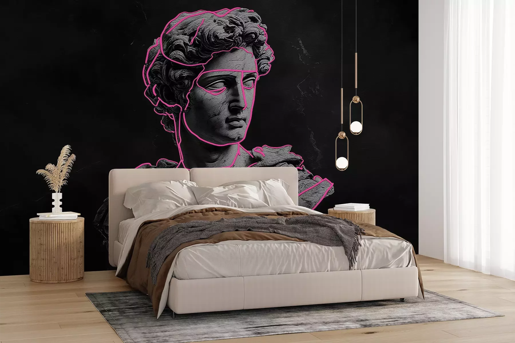 Das Material Premium+ besteht aus einer strukturierten Vinyl-Oberschicht und einem Trägermaterial (Vlies) mit einer Grammatur von 255 g/m², das kleine Unebenheiten der Wand zuverlässig kaschiert. Die feine Sandstruktur verleiht der Oberfläche eine luxuriöse Haptik, während das halbmatte Finish die Tiefe der Farben betont. Das Material ist dampfdurchlässig – so kann diese Fototapete auch in Küchen und Badezimmern eingesetzt werden. Die maximale Breite einer Tapetenbahn beträgt 100 cm. Bei größeren Abmessungen besteht die Fototapete aus mehreren gleich großen Bahnen. Der Kleber wird direkt auf die Wand aufgetragen, und die Fototapete wird auf Stoß angebracht, was für einen ästhetischen Effekt ohne sichtbare Fugen sorgt. Die Oberfläche ist pflegeleicht und kann bei Bedarf sanft mit einem feuchten Tuch abgewischt werden.