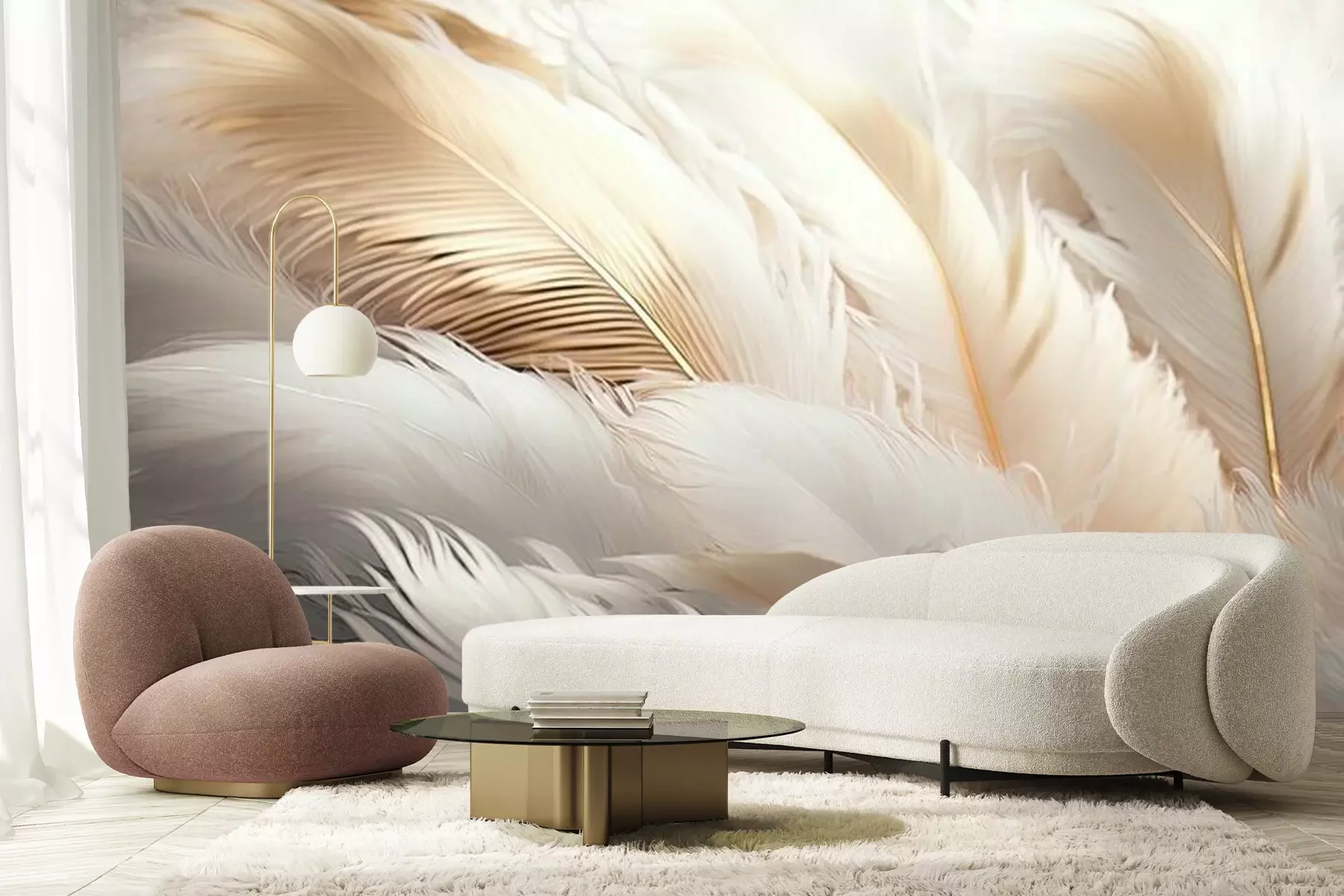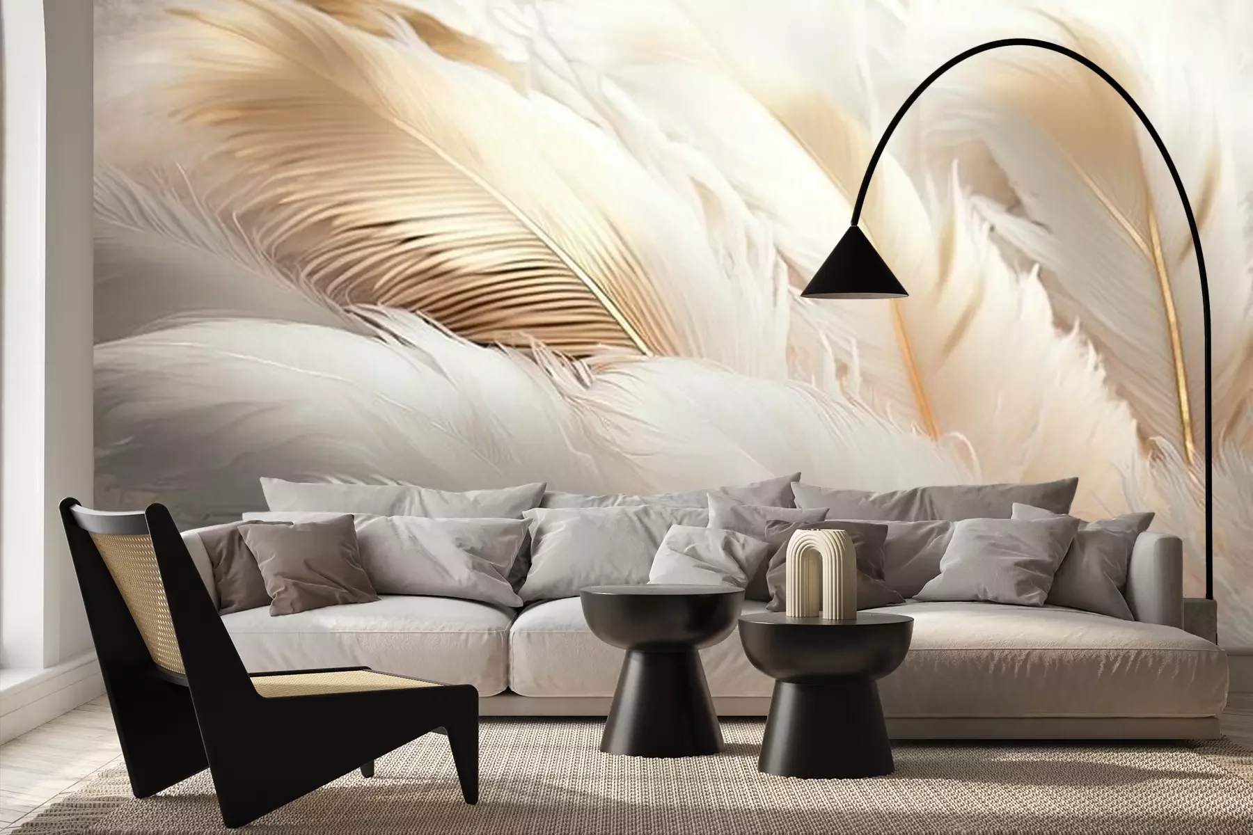 Abstrakte schwarze und goldene 3D-FedernManchmal braucht es keine großen Veränderungen, um das Aussehen eines Raumes aufzufrischen. Wenn du nach etwas suchst, das alle Blicke auf sich zieht, wähle unsere Fototapete. Federn in sanften Farbtönen sind ein elegantes, dekoratives Motiv, das zu vielen Einrichtungsstilen passt. Am besten kommt es an einer einzelnen Wand zur Geltung, insbesondere in Räumen, die in Weiß oder zarten Beigetönen gehalten sind. Diese Fototapete mit Federn ist eine großartige Lösung für moderne Innenräume. Sie wirkt angenehm und passt perfekt zu einem romantisch eingerichteten Schlafzimmer. Die flauschigen Federchen, die mit Weichheit und Leichtigkeit assoziiert werden, bilden den idealen Hintergrund für das Bett und verleihen dem Raum eine entspannte Atmosphäre. Entscheide dich für eine dezente Fototapete – Federchen mit dekorativem Flair verleihen der Wand eine sanfte Note und helfen dabei, eine gemütliche und stimmungsvolle Umgebung zum Entspannen zu gestalten. Du kannst auch dein Wohnzimmer im Boho-Stil verwandeln – setze einfach auf unsere Fototapete. Federchen in Weiß und Beige verleihen dem Raum Charakter und sorgen für eine harmonische Gesamtwirkung. Das Muster fügt sich perfekt in eine natürliche Farbpalette mit Holzmöbeln, erdigen Tönen, Naturtextilien wie Rattan ein. Unsere Fototapete besticht durch einen gestochen scharfen Druck, der die Struktur der Federn perfekt wiedergibt. Die Dekoration ist lichtecht und behält über lange Zeit ihre ursprüngliche Optik, ohne an Qualität zu verlieren. Dank der hohen Materialbeständigkeit bleibt die Oberfläche der Fototapete vor möglichen Schäden geschützt. Wenn du elegante Akzente magst, steht einer stilvollen Aufwertung deines Zuhauses nichts im Wege. Alles, was du brauchst, ist eine dekorative Fototapete. Federn 3D schmücken die Wände eines glamourösen Wohnzimmers und verleihen ihm gleichzeitig mehr Tiefe. Ein Hauch von Dramatik entsteht durch Grautöne und markantes Schwarz – Möbel in diesen Farben kommen vor den zarten Federn besonders gut zur Geltung. Diese Raumgestaltung macht sich auch gut im Home-Office, wähle also unsere Fototapete. Federn in hellen Farben sind ein Motiv, das einem modernen Arbeitszimmer eine elegante Note verleiht. Das ausdrucksstarke Muster eignet sich auch für Schönheitssalons, Friseursalons und andere Geschäftsräume. Diese Fototapete lässt sich an verschiedene Raumgrößen anpassen, da wir sie nach Maß drucken. Die Montage ist denkbar einfach – das verwendete Material haftet optimal an der Wand und ermöglicht eine schnelle, blasenfreie Anbringung.