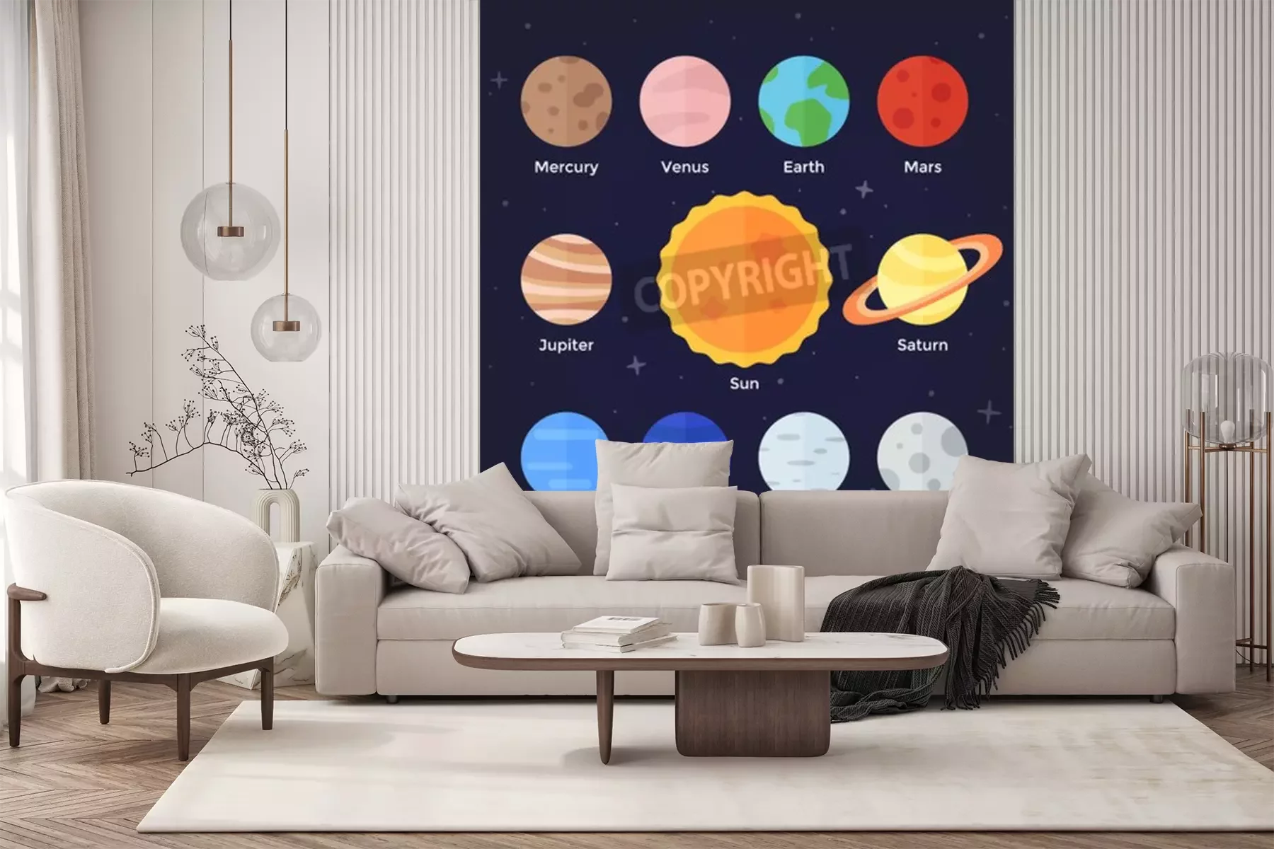 Fototapete Sonne im Zentrum, Mond und Planeten