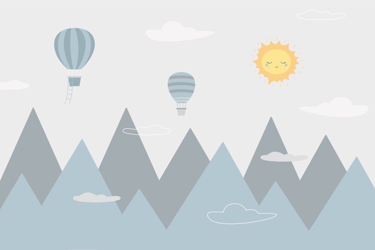 Fototapete: Sonne und Luftballons über einer Berglandschaft