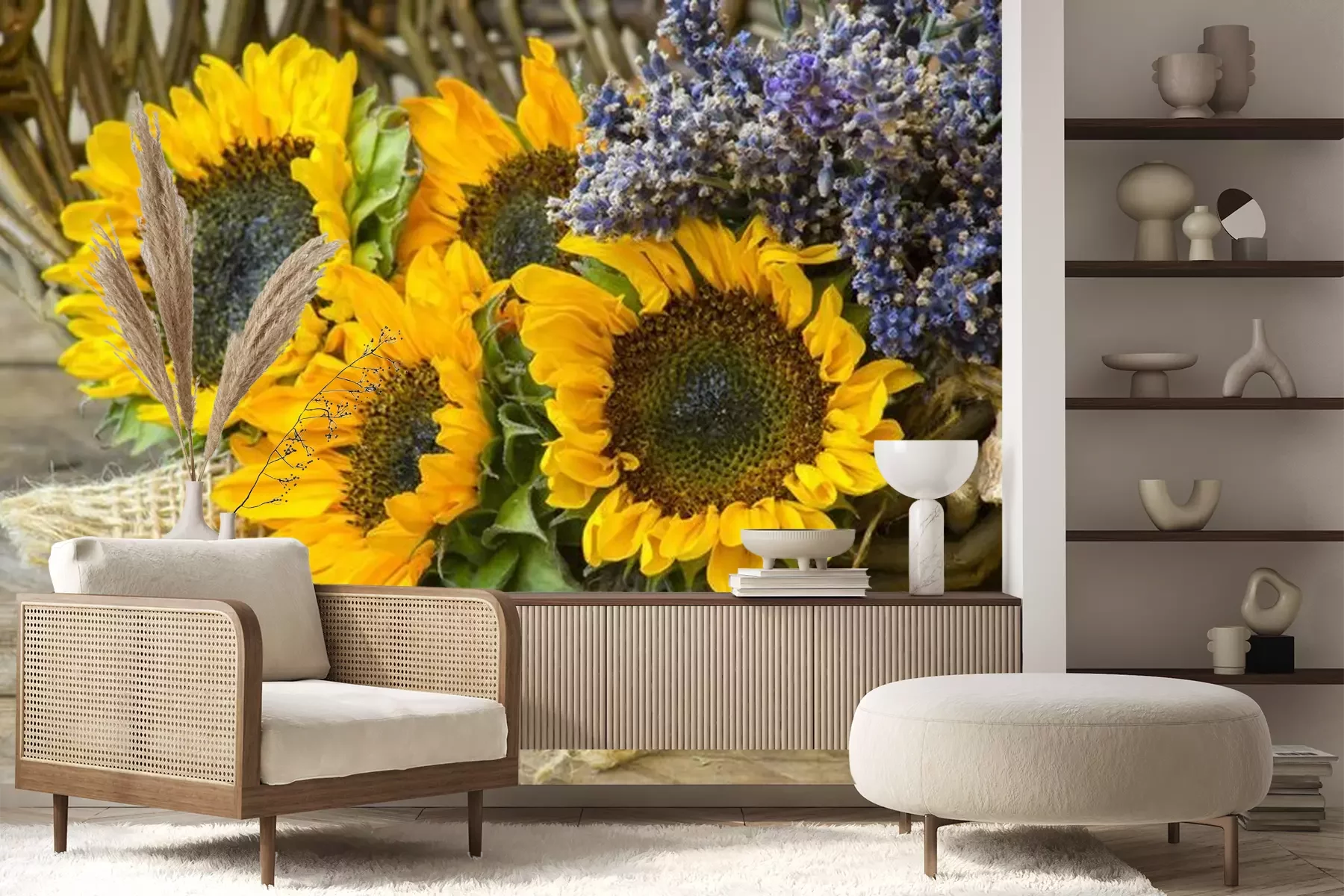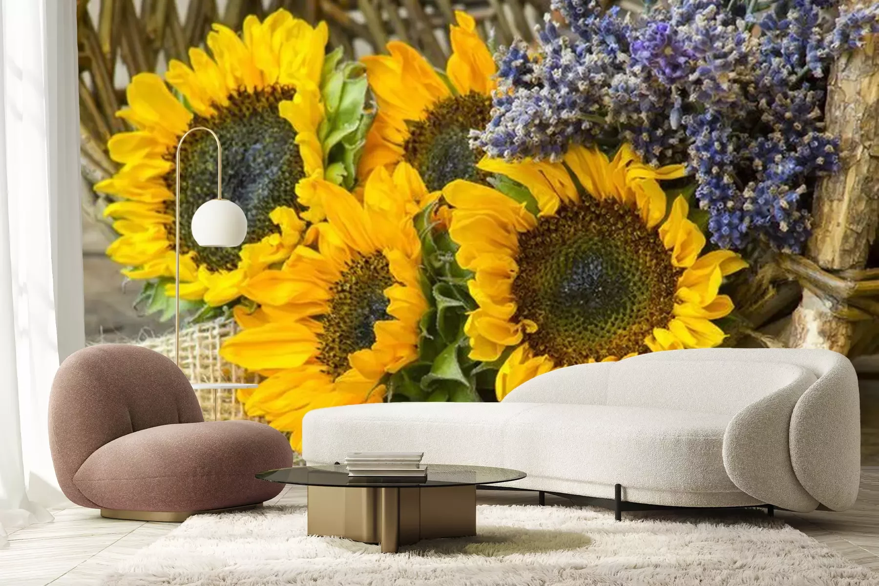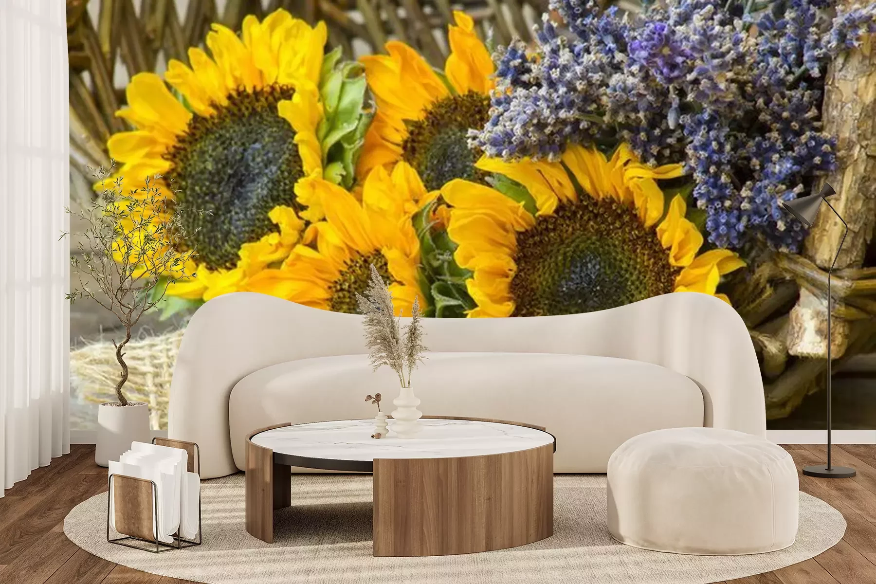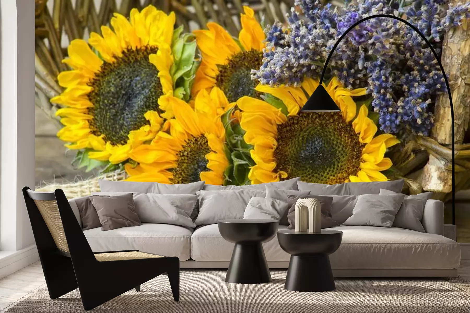 Fototapete Sonnenblumen und Lavendel in Komposition