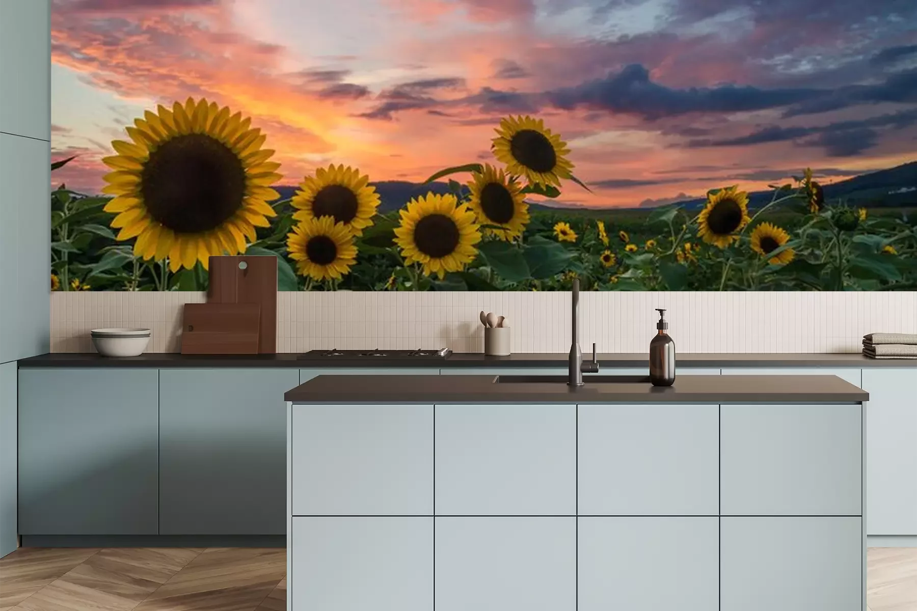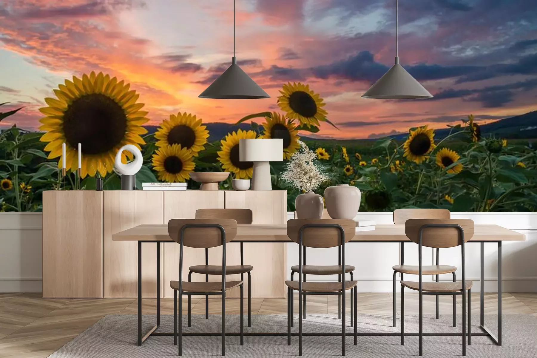 Fototapete Sonnenblumenfeld und Sonnenuntergang