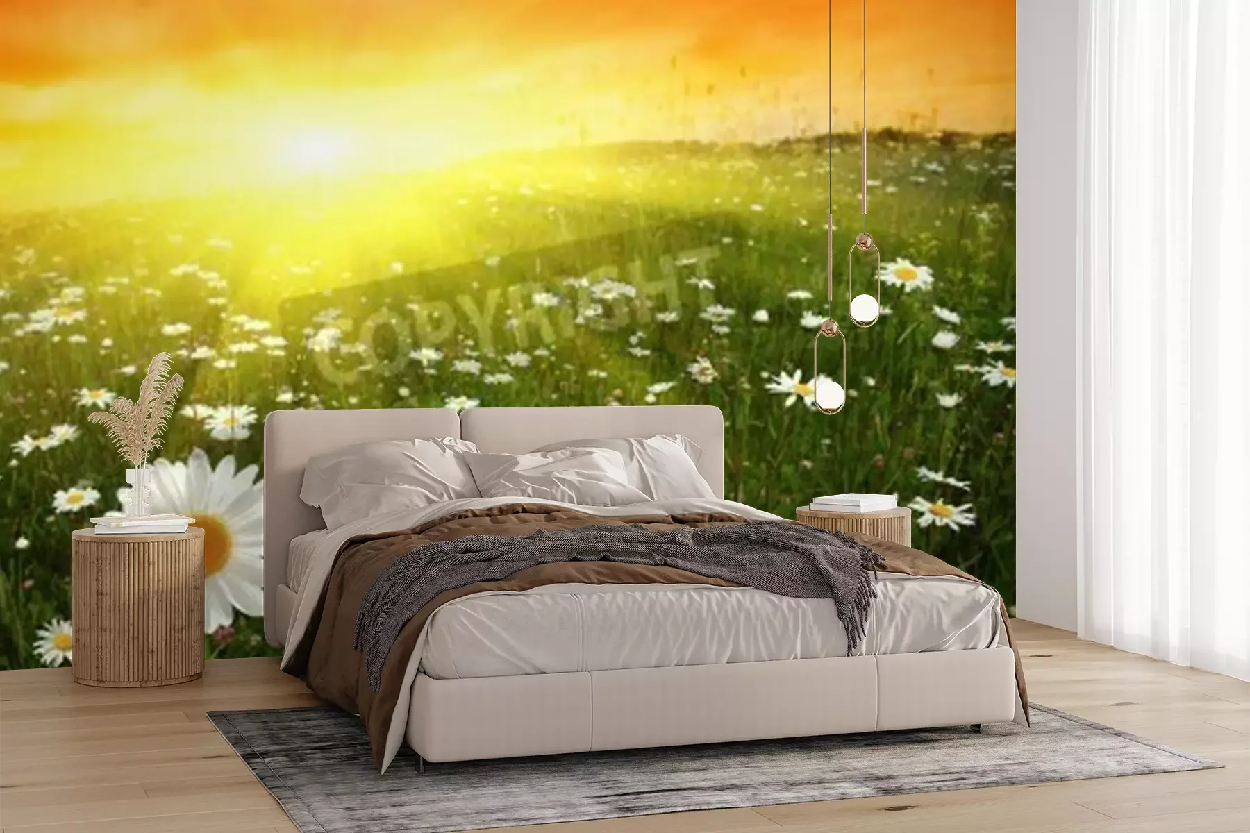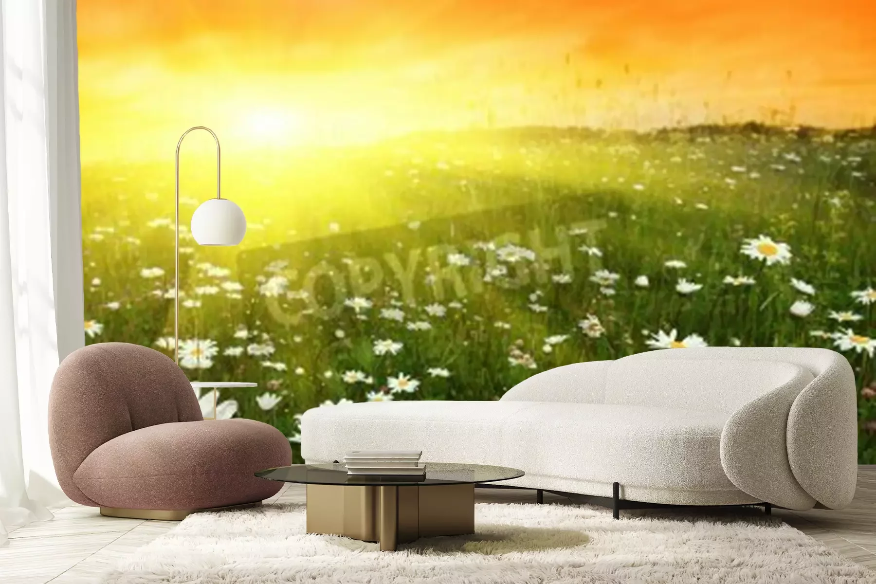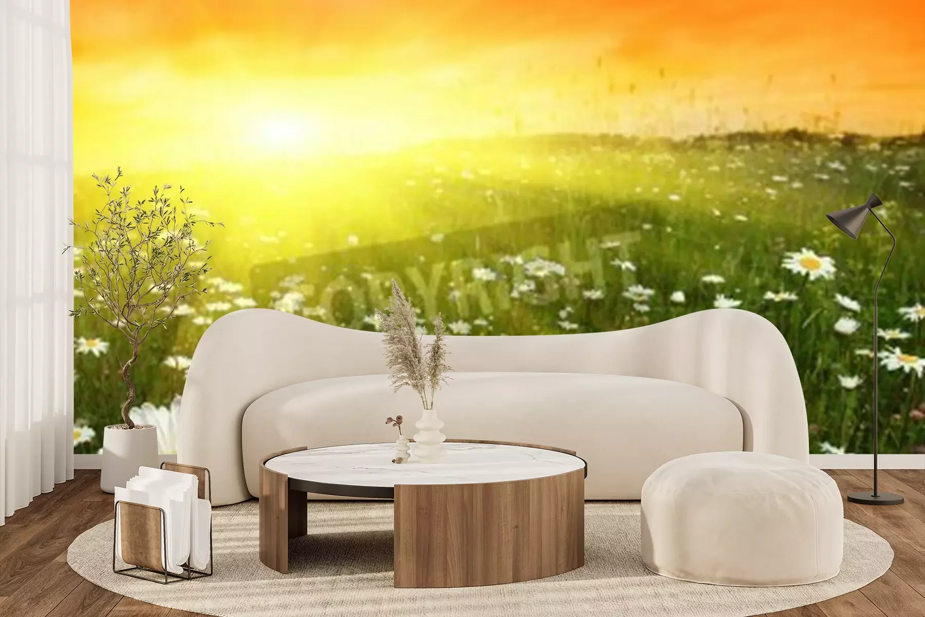 Fototapete Sonnenuntergang über Gänseblümchenfeld
