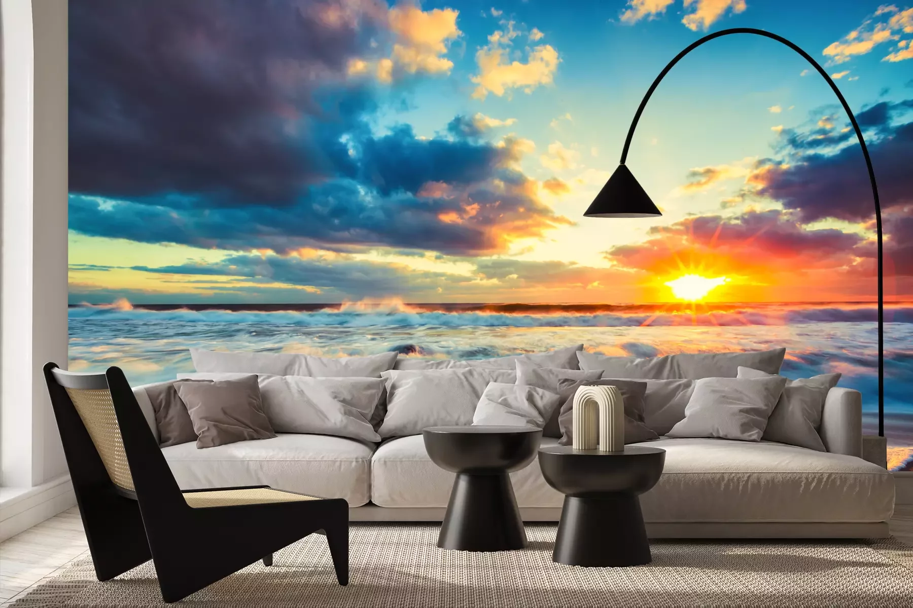 Fototapete Sonnenuntergang über schäumenden Wellen