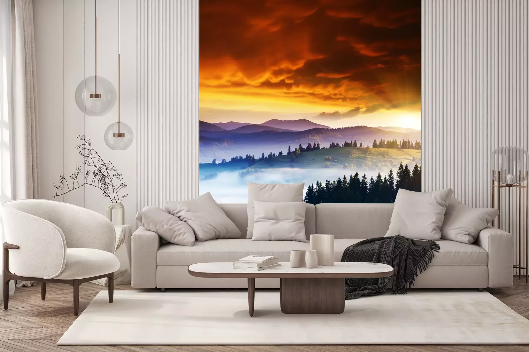 Das Material Premium+ besteht aus einer strukturierten Vinyl-Oberschicht und einem Trägermaterial (Vlies) mit einer Grammatur von 255 g/m², das kleine Unebenheiten der Wand zuverlässig kaschiert. Die feine Sandstruktur verleiht der Oberfläche eine luxuriöse Haptik, während das halbmatte Finish die Tiefe der Farben betont. Das Material ist dampfdurchlässig – so kann diese Fototapete auch in Küchen und Badezimmern eingesetzt werden. Die maximale Breite einer Tapetenbahn beträgt 100 cm. Bei größeren Abmessungen besteht die Fototapete aus mehreren gleich großen Bahnen. Der Kleber wird direkt auf die Wand aufgetragen, und die Fototapete wird auf Stoß angebracht, was für einen ästhetischen Effekt ohne sichtbare Fugen sorgt. Die Oberfläche ist pflegeleicht und kann bei Bedarf sanft mit einem feuchten Tuch abgewischt werden.