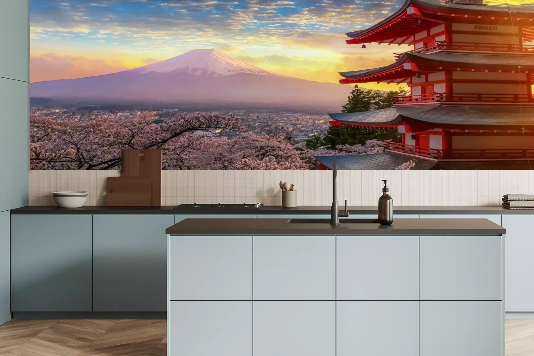 Kirschblüten mit japanischem Haus und BergenProblemlose Lieferung durch vertrauenswürdige Spediteure