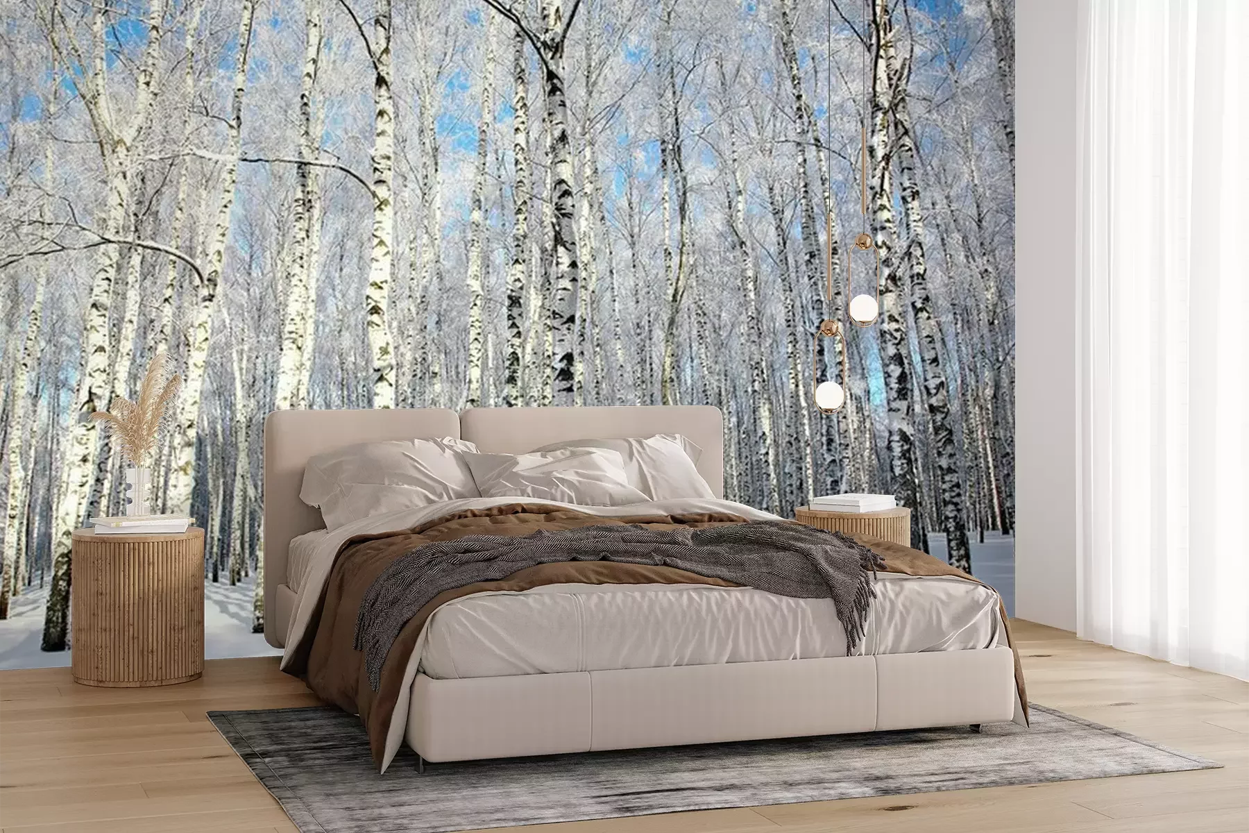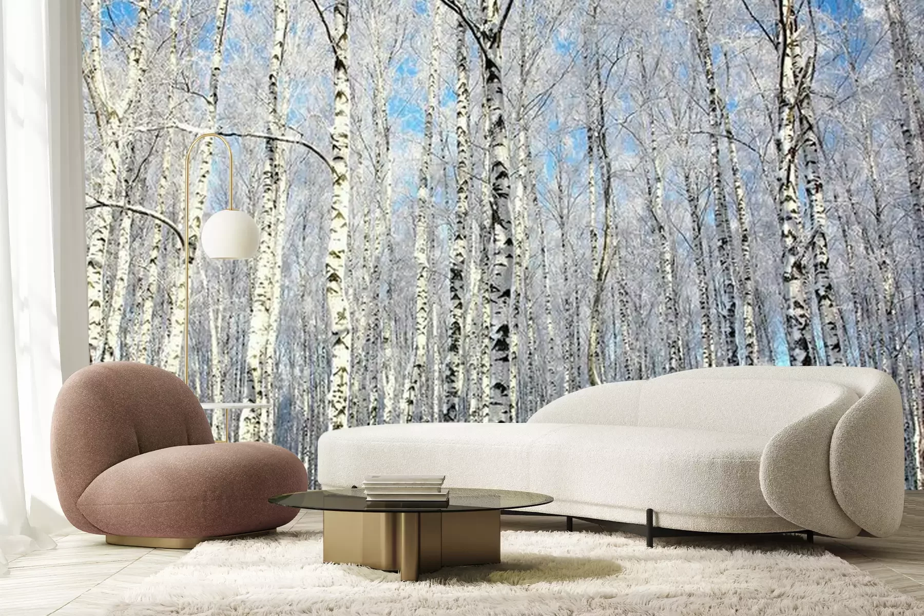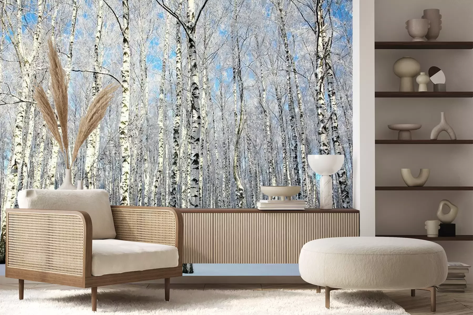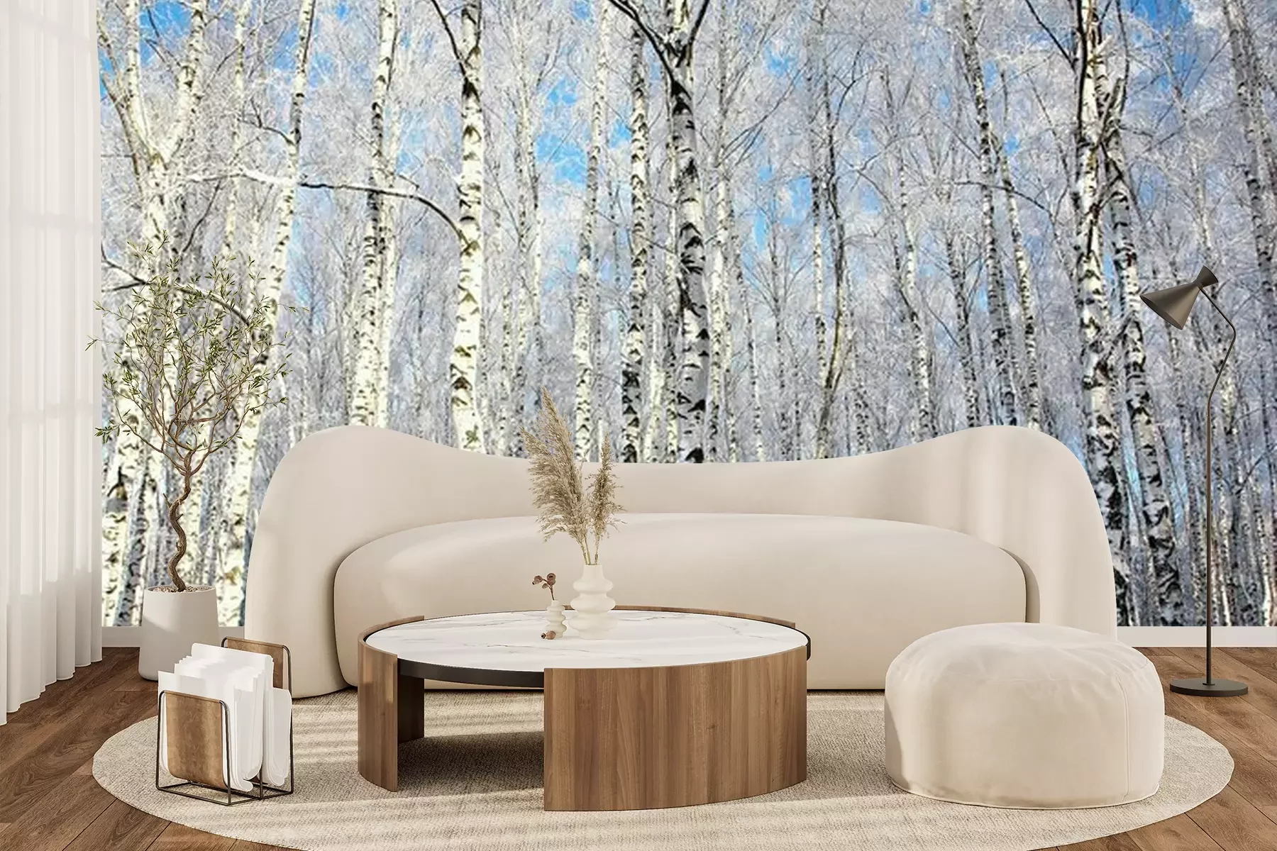 Schnee im Wald voller BirkenProblemlose Lieferung durch vertrauenswürdige Spediteure