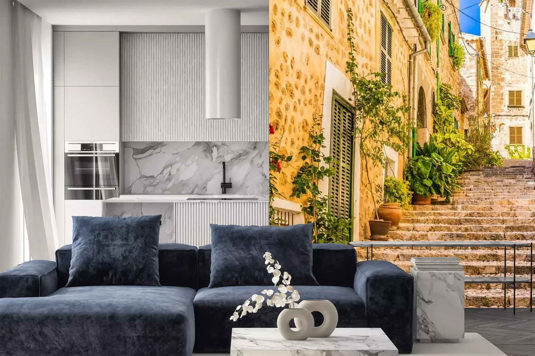 Das Material Premium+ besteht aus einer strukturierten Vinyl-Oberschicht und einem Trägermaterial (Vlies) mit einer Grammatur von 255 g/m², das kleine Unebenheiten der Wand zuverlässig kaschiert. Die feine Sandstruktur verleiht der Oberfläche eine luxuriöse Haptik, während das halbmatte Finish die Tiefe der Farben betont. Das Material ist dampfdurchlässig – so kann diese Fototapete auch in Küchen und Badezimmern eingesetzt werden. Die maximale Breite einer Tapetenbahn beträgt 100 cm. Bei größeren Abmessungen besteht die Fototapete aus mehreren gleich großen Bahnen. Der Kleber wird direkt auf die Wand aufgetragen, und die Fototapete wird auf Stoß angebracht, was für einen ästhetischen Effekt ohne sichtbare Fugen sorgt. Die Oberfläche ist pflegeleicht und kann bei Bedarf sanft mit einem feuchten Tuch abgewischt werden.
