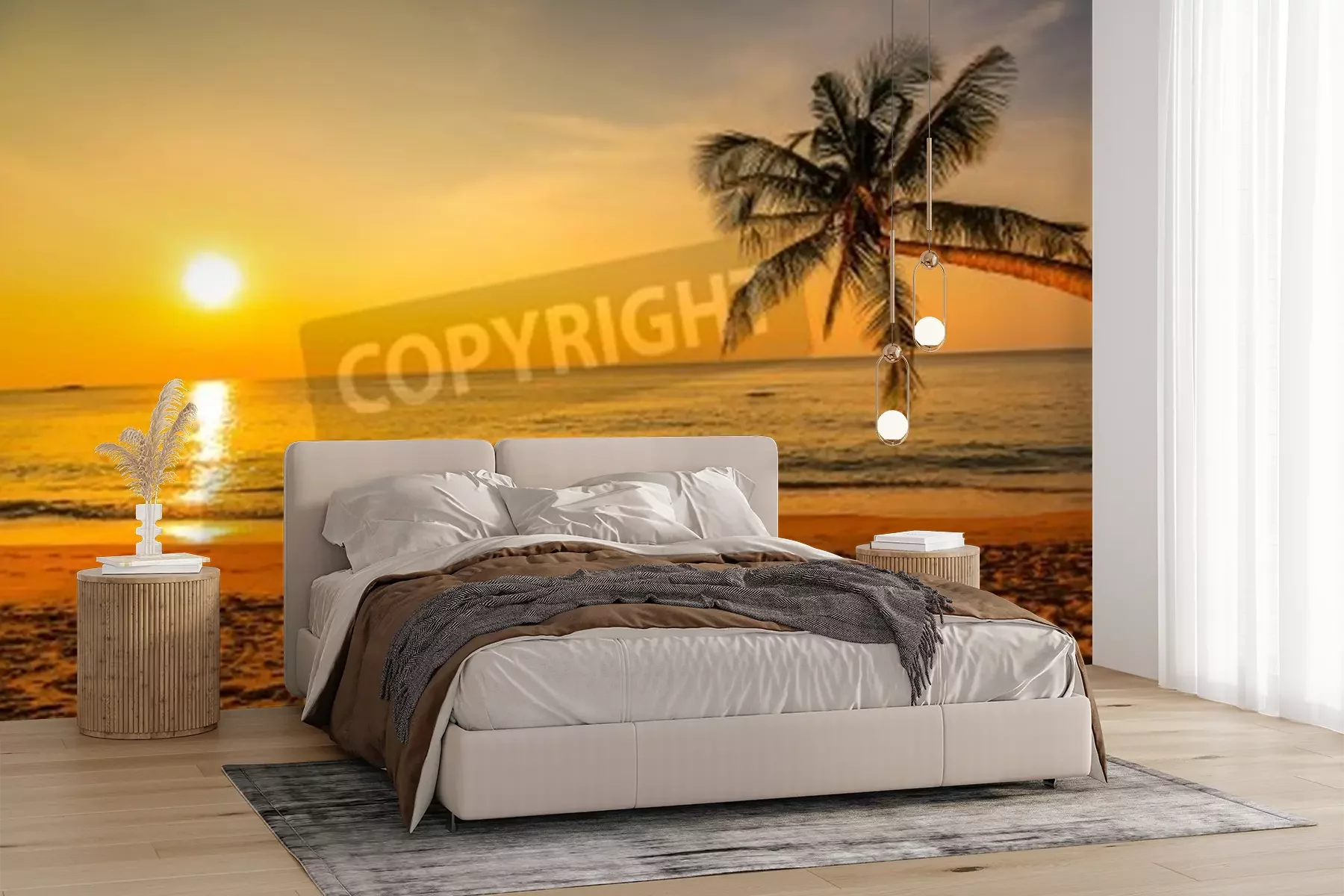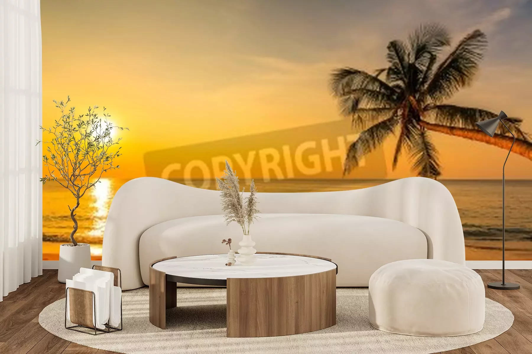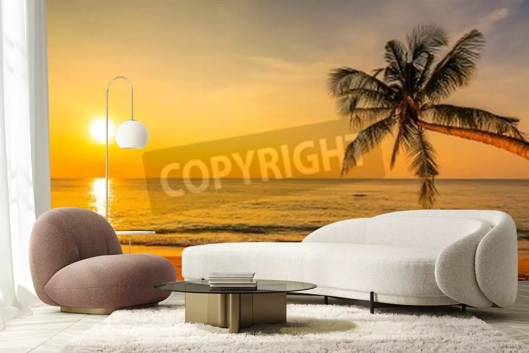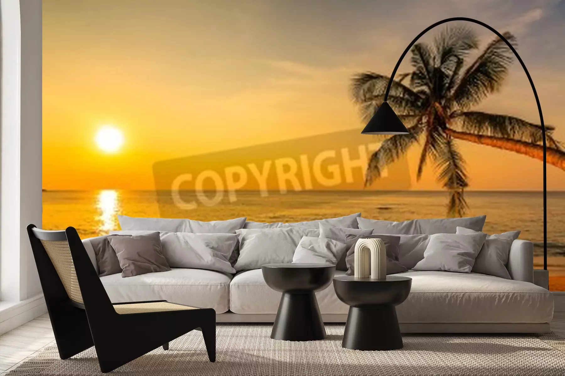 Fototapete Strand Palmen und untergehende Sonne