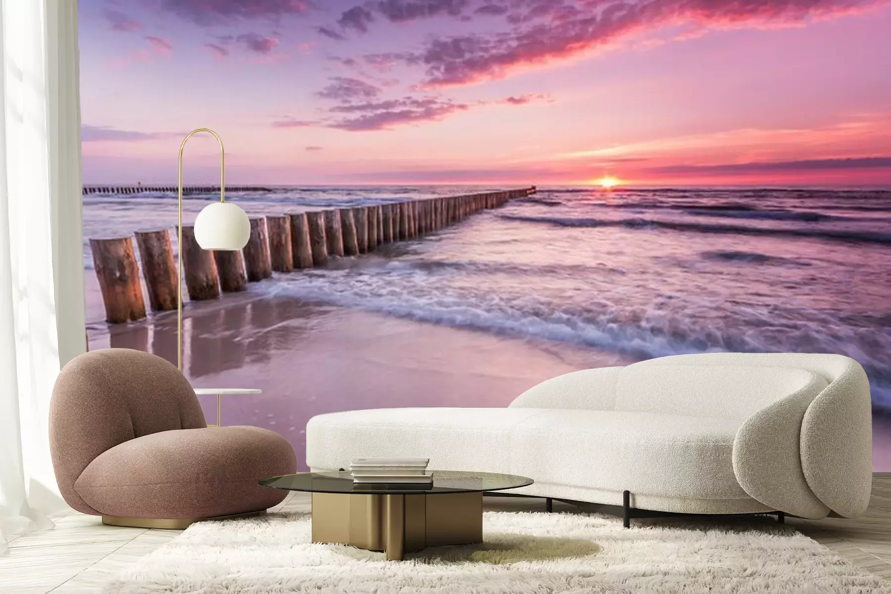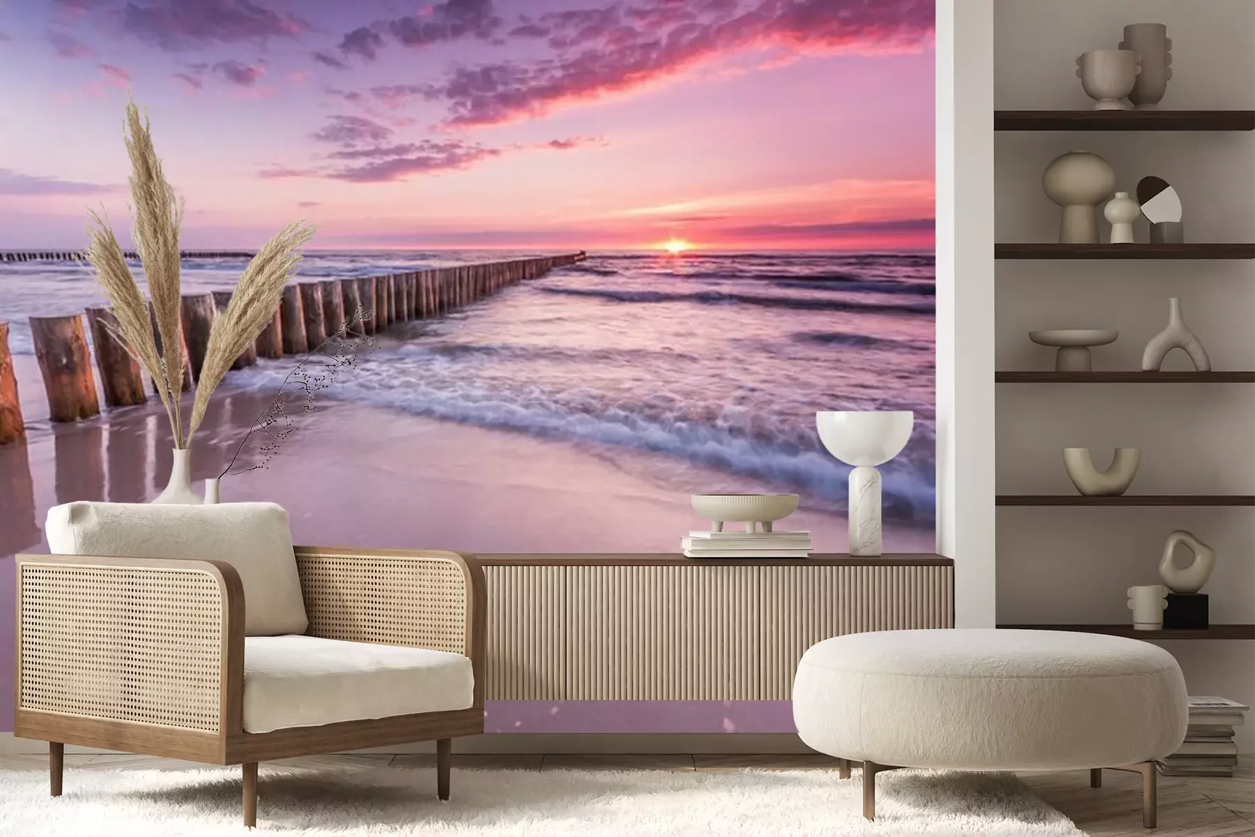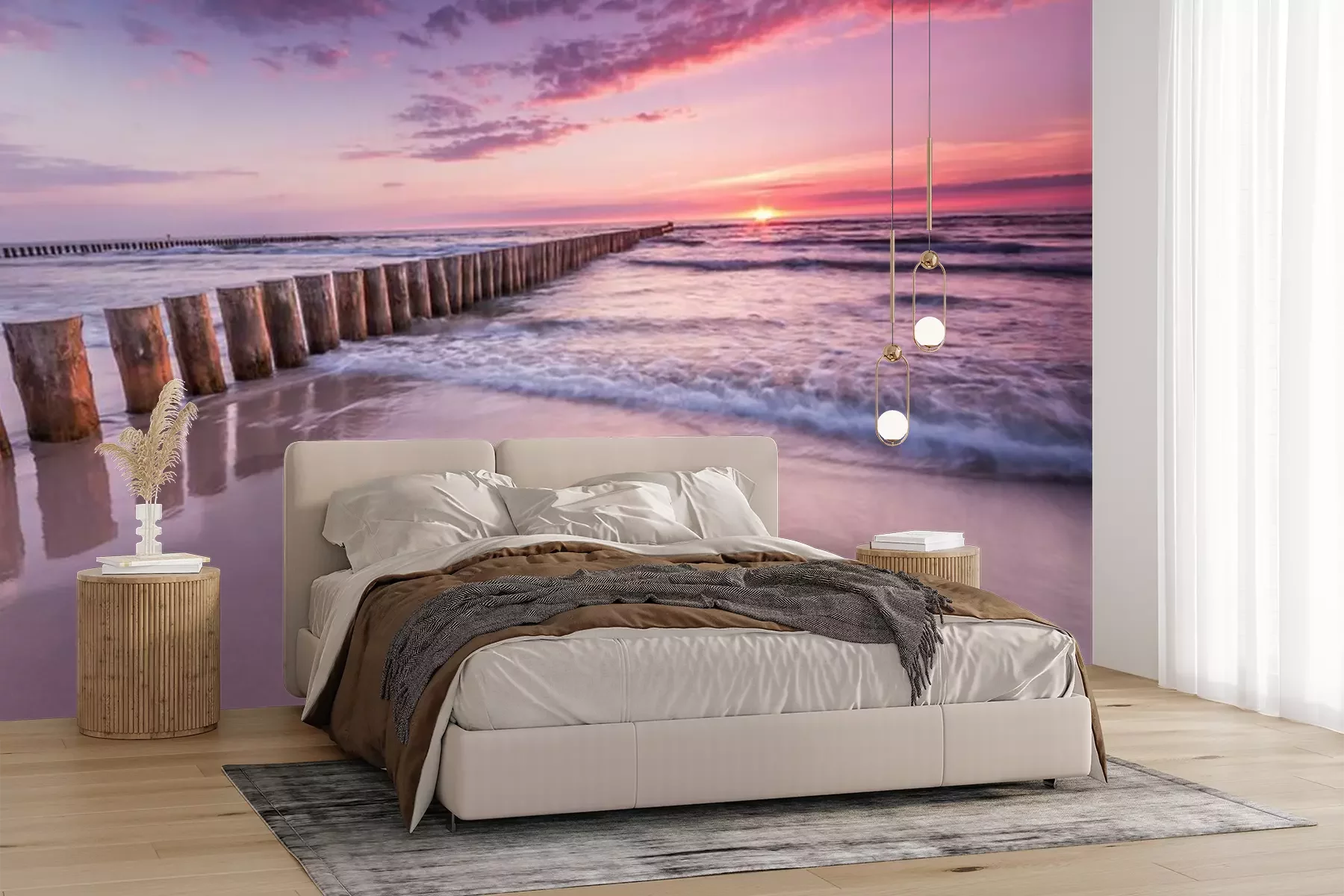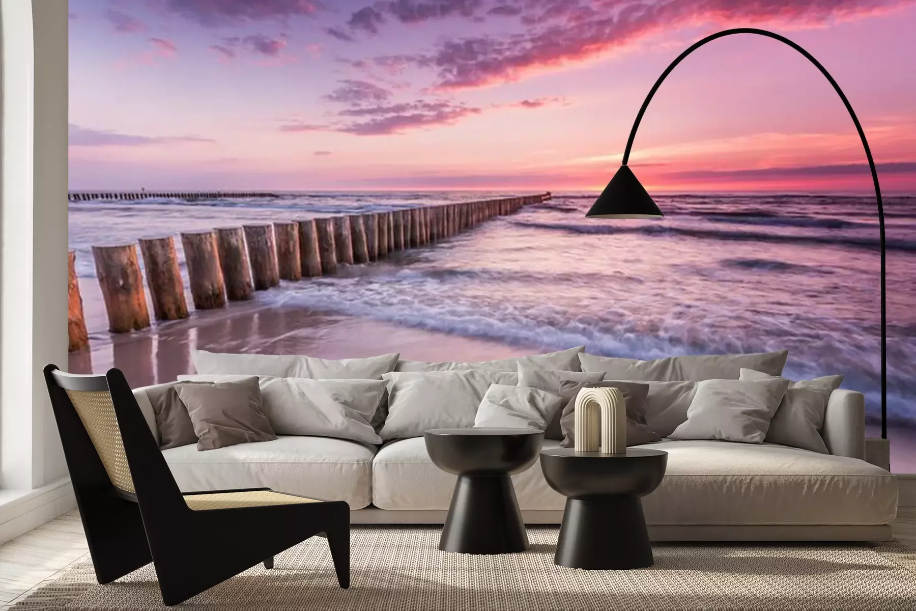 Fototapete Strand Wellenbrecher und violetter Himmel