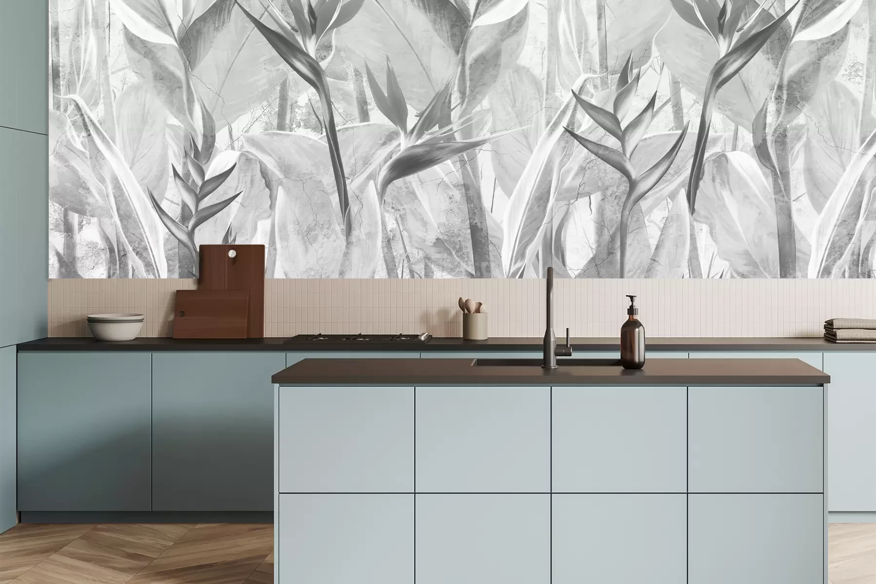 Das Material Premium+ besteht aus einer strukturierten Vinyl-Oberschicht und einem Trägermaterial (Vlies) mit einer Grammatur von 255 g/m², das kleine Unebenheiten der Wand zuverlässig kaschiert. Die feine Sandstruktur verleiht der Oberfläche eine luxuriöse Haptik, während das halbmatte Finish die Tiefe der Farben betont. Das Material ist dampfdurchlässig – so kann diese Fototapete auch in Küchen und Badezimmern eingesetzt werden. Die maximale Breite einer Tapetenbahn beträgt 100 cm. Bei größeren Abmessungen besteht die Fototapete aus mehreren gleich großen Bahnen. Der Kleber wird direkt auf die Wand aufgetragen, und die Fototapete wird auf Stoß angebracht, was für einen ästhetischen Effekt ohne sichtbare Fugen sorgt. Die Oberfläche ist pflegeleicht und kann bei Bedarf sanft mit einem feuchten Tuch abgewischt werden.
