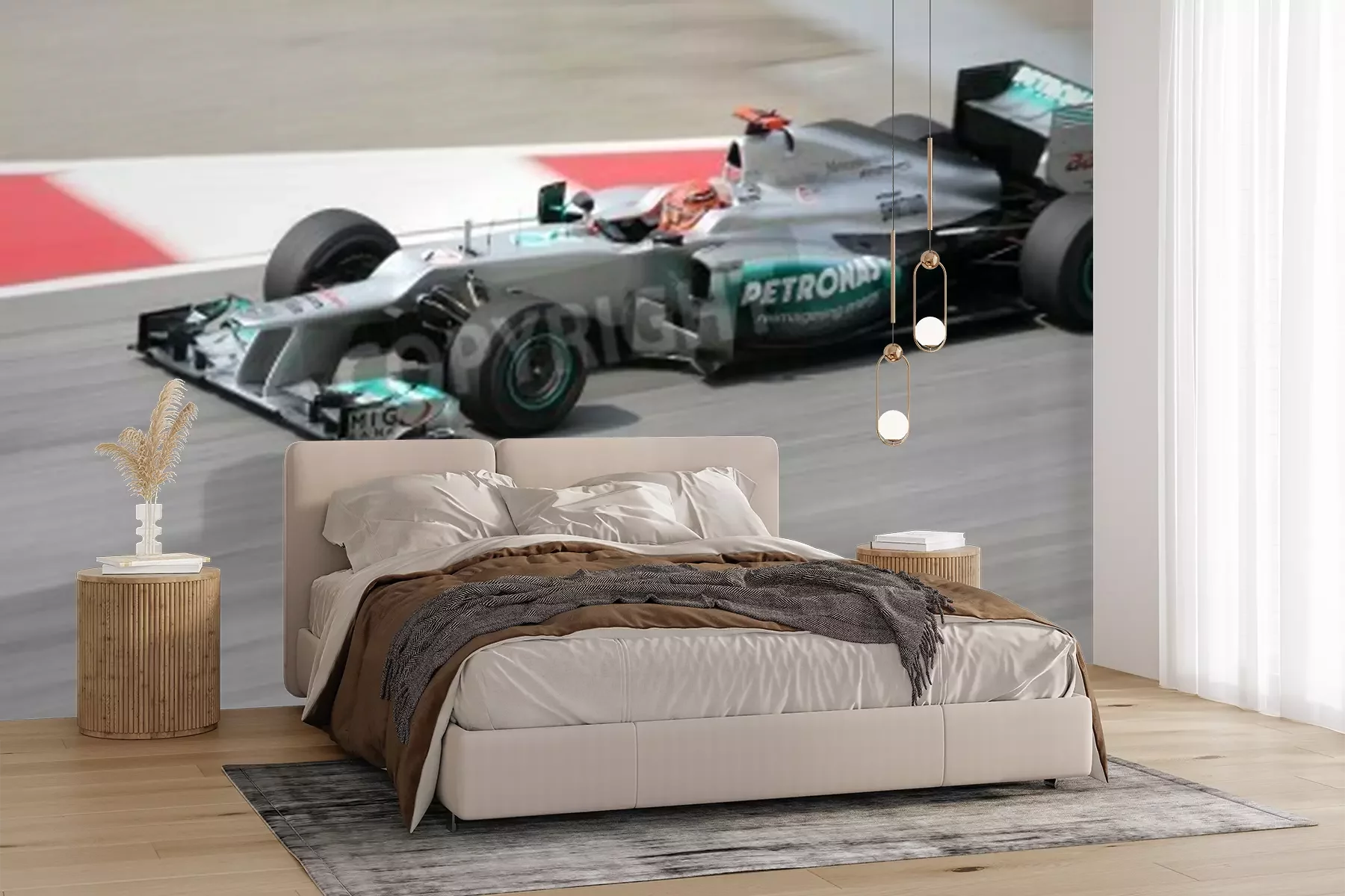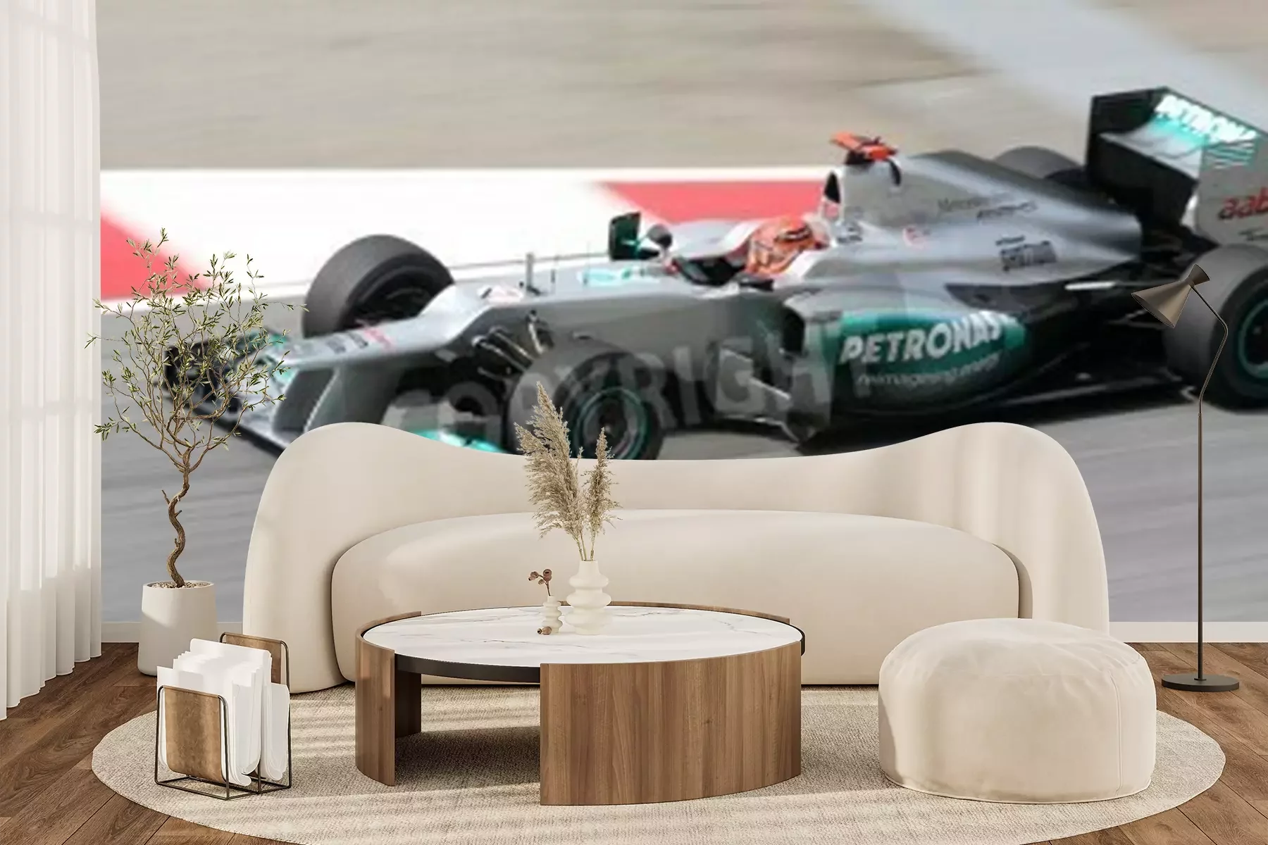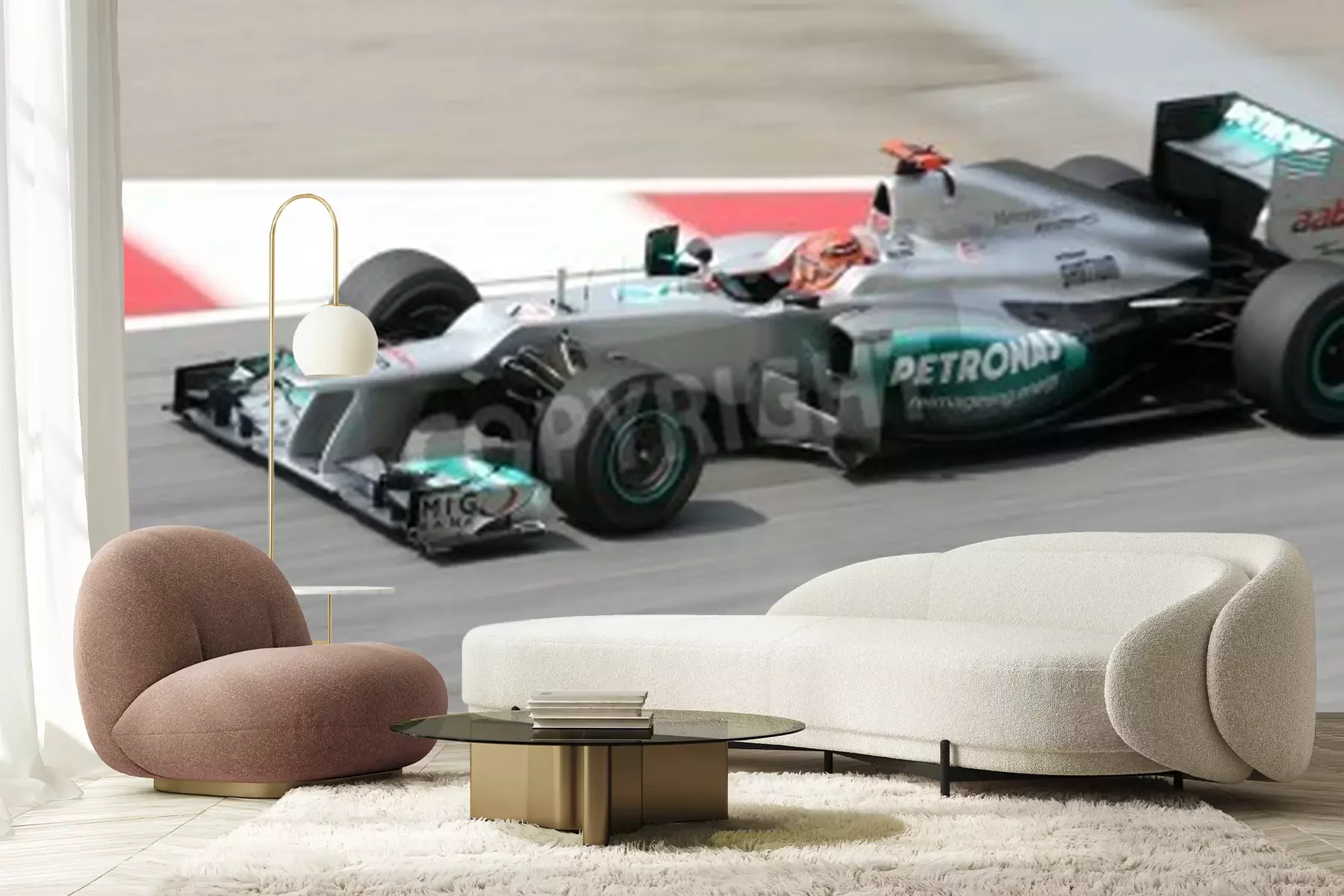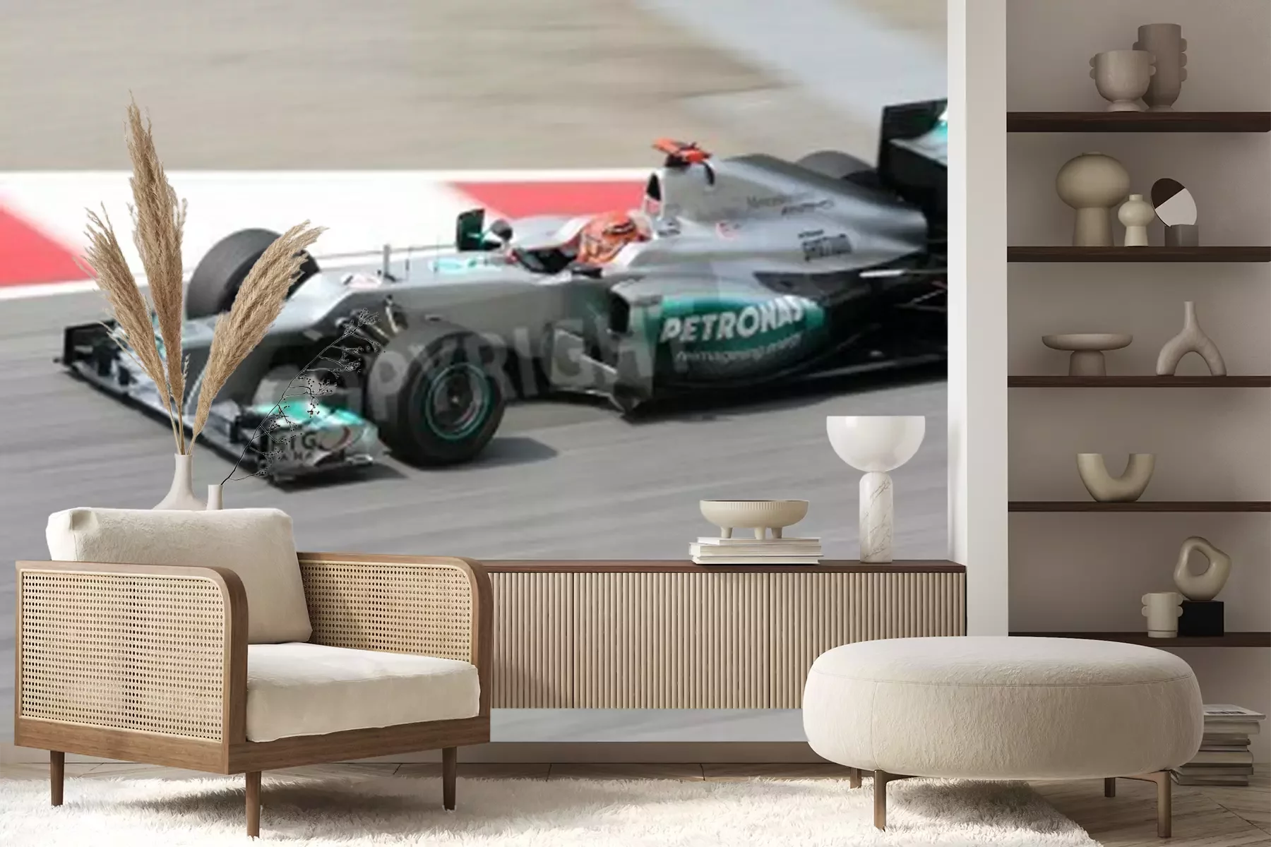 Fototapete Stromlinienförmiger grauer Bolid der Formel 1
