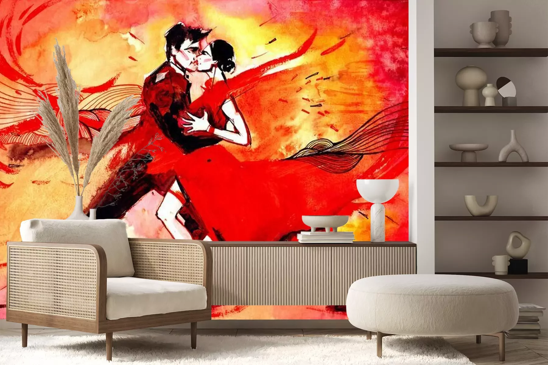 Das Material Premium+ besteht aus einer strukturierten Vinyl-Oberschicht und einem Trägermaterial (Vlies) mit einer Grammatur von 255 g/m², das kleine Unebenheiten der Wand zuverlässig kaschiert. Die feine Sandstruktur verleiht der Oberfläche eine luxuriöse Haptik, während das halbmatte Finish die Tiefe der Farben betont. Das Material ist dampfdurchlässig – so kann diese Fototapete auch in Küchen und Badezimmern eingesetzt werden. Die maximale Breite einer Tapetenbahn beträgt 100 cm. Bei größeren Abmessungen besteht die Fototapete aus mehreren gleich großen Bahnen. Der Kleber wird direkt auf die Wand aufgetragen, und die Fototapete wird auf Stoß angebracht, was für einen ästhetischen Effekt ohne sichtbare Fugen sorgt. Die Oberfläche ist pflegeleicht und kann bei Bedarf sanft mit einem feuchten Tuch abgewischt werden.