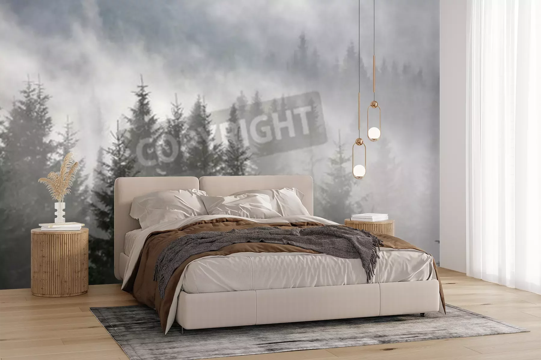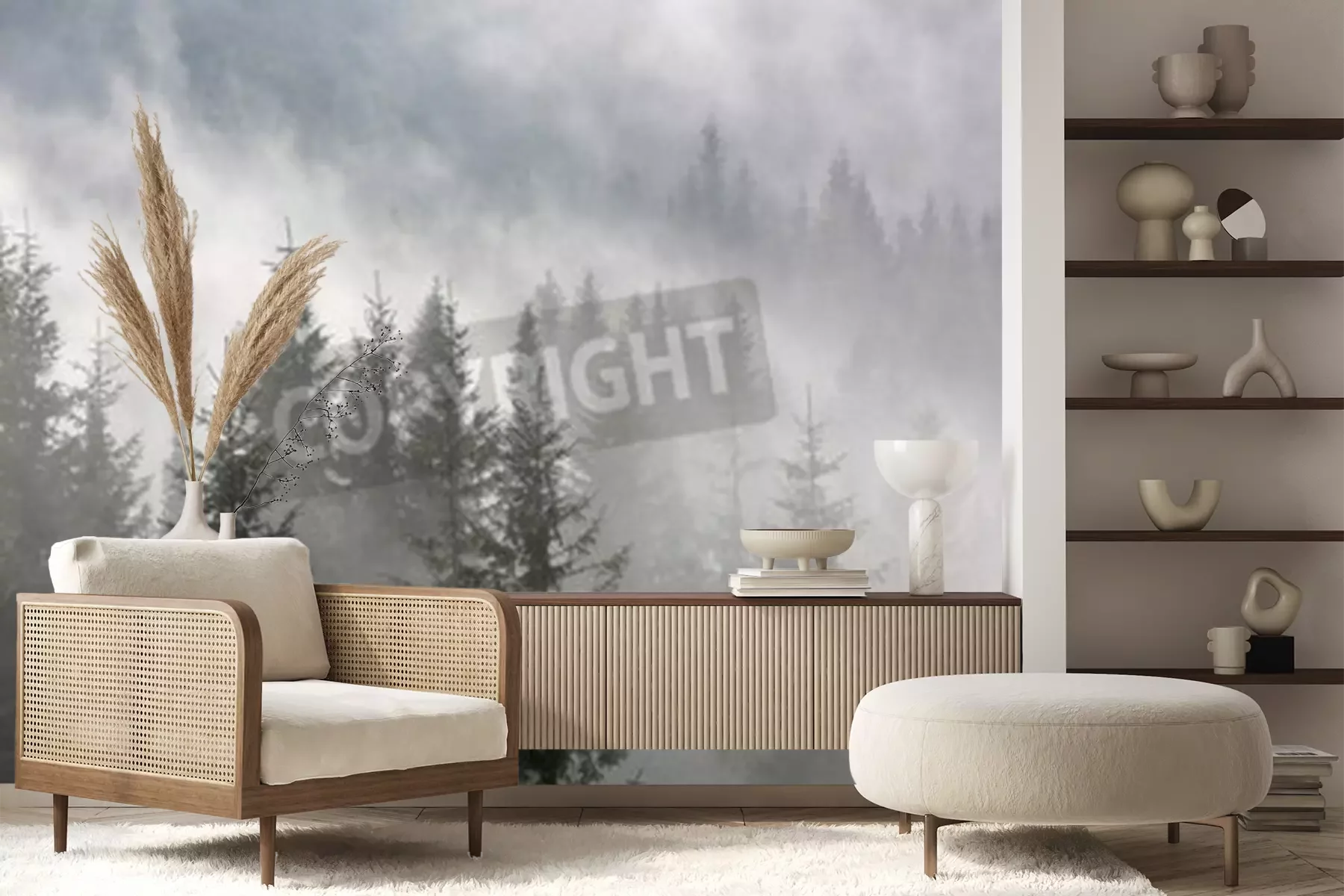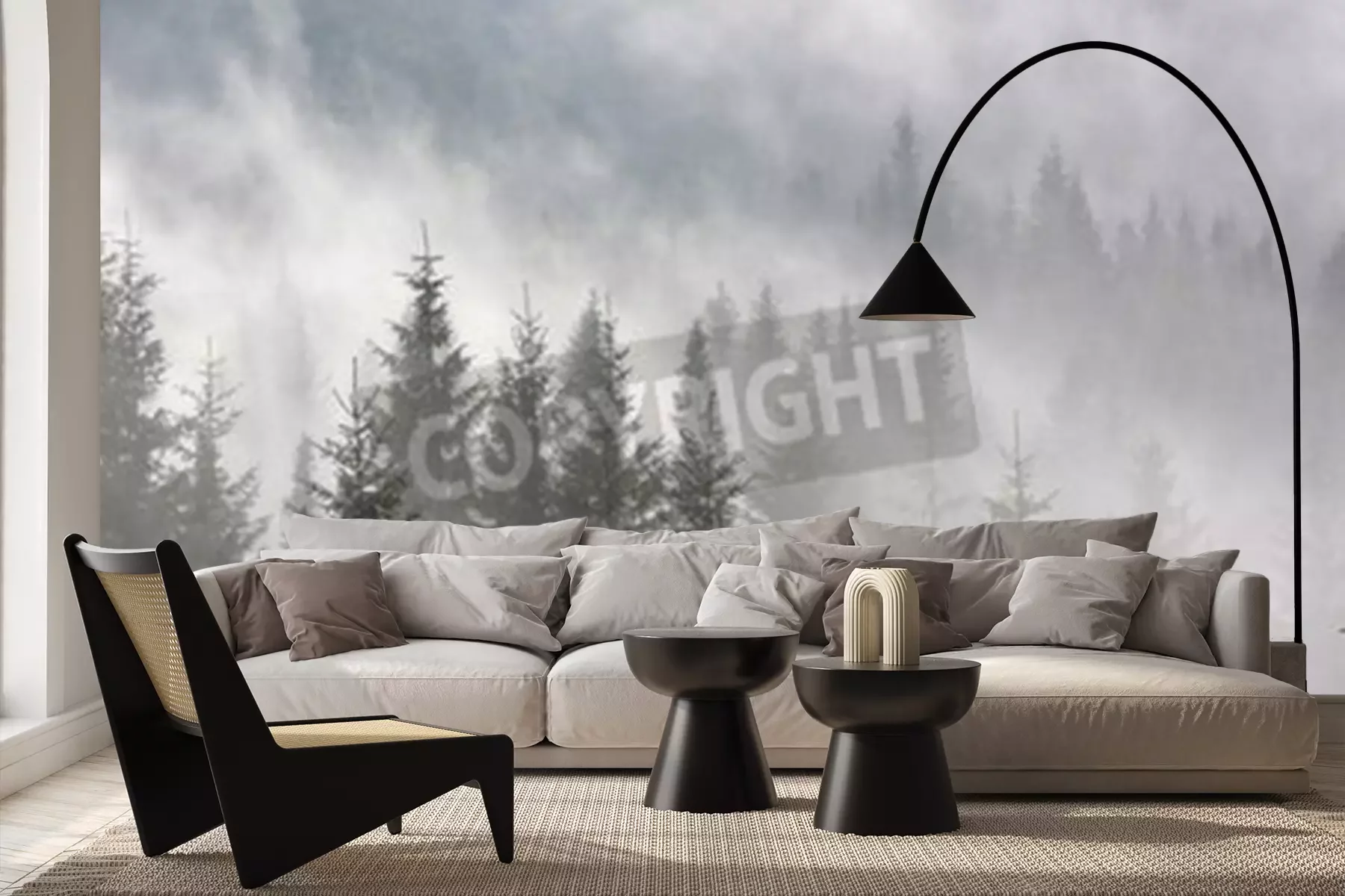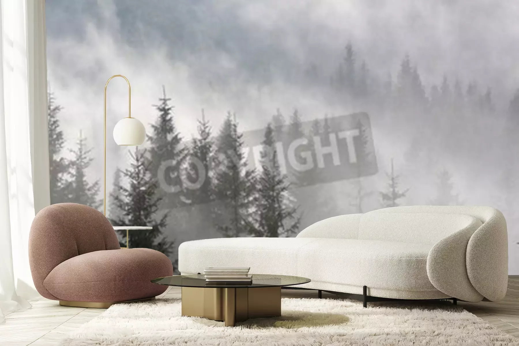 Fototapete Tannenbäume mit nebligen wald im hintergrund