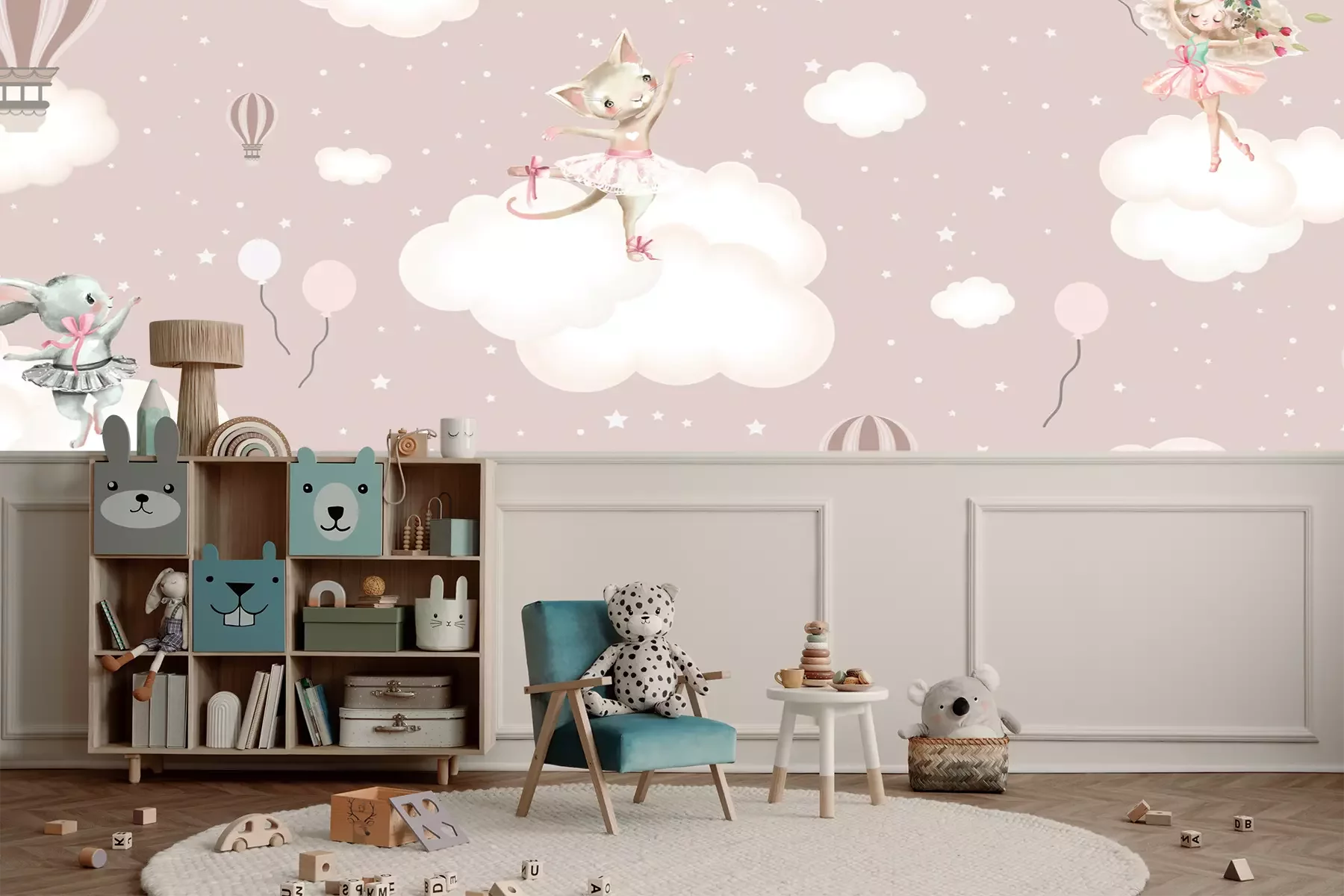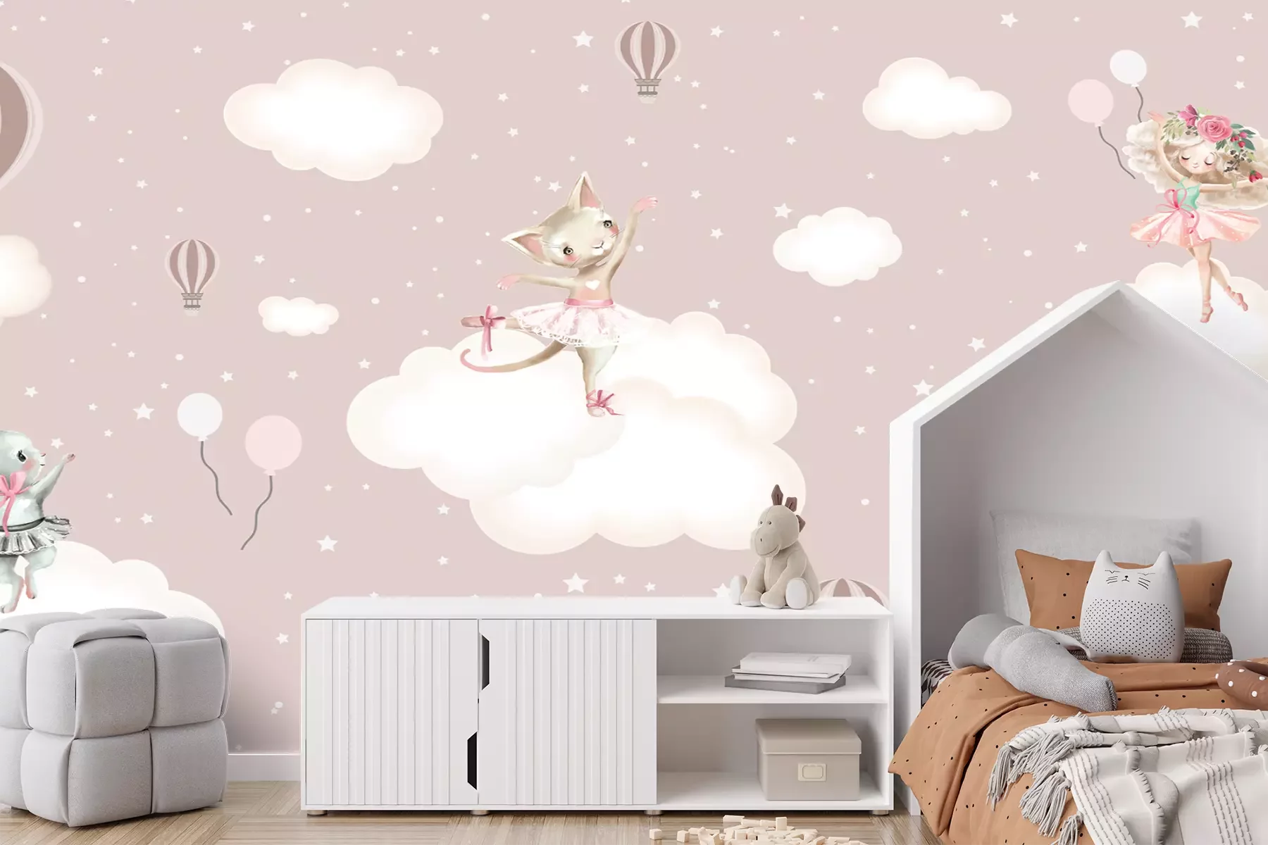 Flamingos und graue tropische BlätterHeute haben wir für Sie eine Dekoration, die perfekt zum Zimmer einer kleinen Prinzessin passt. Es handelt sich um eine pastellfarbene Fototapete mit einem Balletttänzerinnen-Motiv, das bei Mädchen sehr beliebt ist. Die märchenhafte Illustration ist in sanften Tönen zwischen Beige und Altrosa gehalten, was sie zu einer perfekten Ergänzung des Interieurs macht. Sie verleiht dem Raum eine gemütliche Atmosphäre, ohne die Einrichtung zu dominieren. Dies ist sehr wichtig, da Kinder heutzutage einer Vielzahl von Reizen ausgesetzt sind, die sich negativ auf ihr Wohlbefinden auswirken können. Daher ist es wichtig, dass das Zuhause entsprechend gestaltet ist. Es ist auch eine gute Lösung, wenn die Fototapete für Kinder ihre Leidenschaften oder Interessen widerspiegelt. Wenn ein Mädchen davon träumt, Balletttänzerin zu werden und einen Tanzkurs besucht, ist unser Vorschlag genau richtig. Das Muster zeigt Tänzerinnen, aber auf ungewöhnliche Weise. Die Primaballerina ist nicht nur ein Mädchen mit schönen Haaren, sondern auch ein Häschen und eine Katze. Es handelt sich also um eine wirklich fantasievolle Fototapete für Kinder! Tiere sind ein bewährtes Motiv, denn alle Kinder lieben sie, und in dieser Form sehen sie sehr niedlich aus. Da das Muster auch Wolken und Sterne am Himmel zeigt, ist dies eine gute Lösung, um die Wand zu dekorieren, an der das Kinderbett steht. Eine solche Fototapete für Kinder schafft die ideale Schlafumgebung. Kinder mögen es oft nicht, schlafen zu gehen, und eine entsprechende Umgebung kann sie dazu ermutigen. Dank der Farbgebung, die unsere pastellfarbene Fototapete auszeichnet, ist sie eine ideale Ergänzung für ein Boho-Interieur, das derzeit sehr beliebt ist. Sie harmoniert perfekt mit hellen Holzmöbeln, einem Tüllbaldachin über dem Bett und Lichterketten unter der Decke. Erwähnenswert ist auch die hohe Haltbarkeit unserer Fototapete für Kinder. Tiere auf den Wolken sehen jahrelang schön aus, da das Muster nicht nur lichtbeständig, sondern auch kratz- und stoßfest ist. Und wenn das Kind beim Spielen versehentlich Flecken darauf hinterlässt, lassen sich diese leicht entfernen, ohne die Bahnen zu beschädigen. Im Zimmer können auch andere Wanddekorationen aufgehängt werden, wie z.B. Poster mit märchenhaften Landschaften oder Balletttänzerinnen, um so eine stimmige und ansprechende Einrichtung zu schaffen.