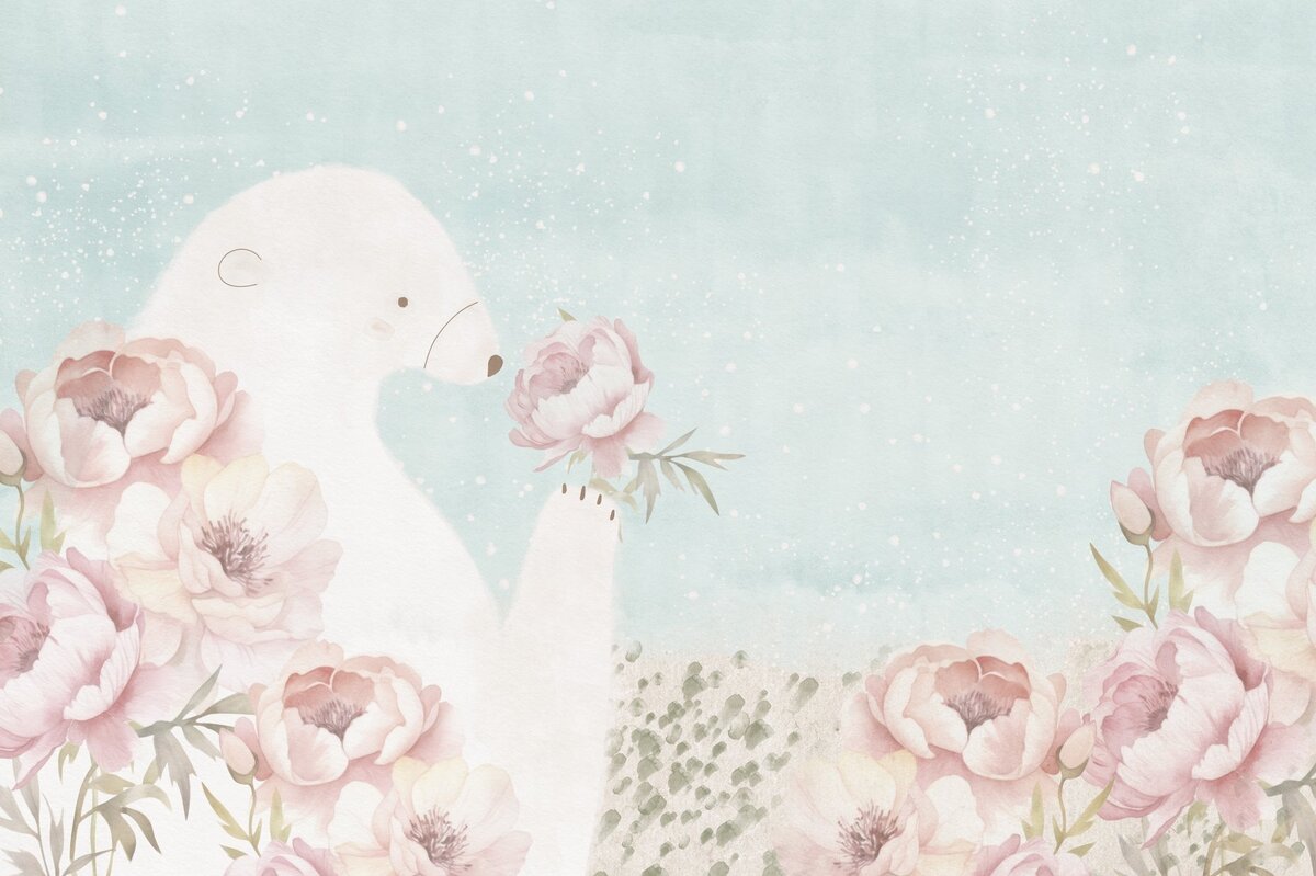 Fototapete: Teddybär und rosa Blumen auf blauem Aquarellhintergrund
