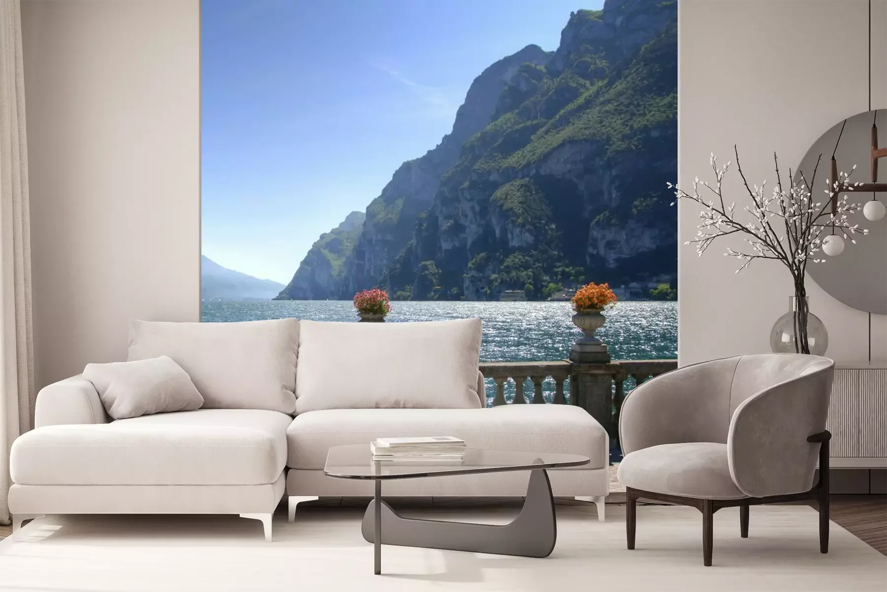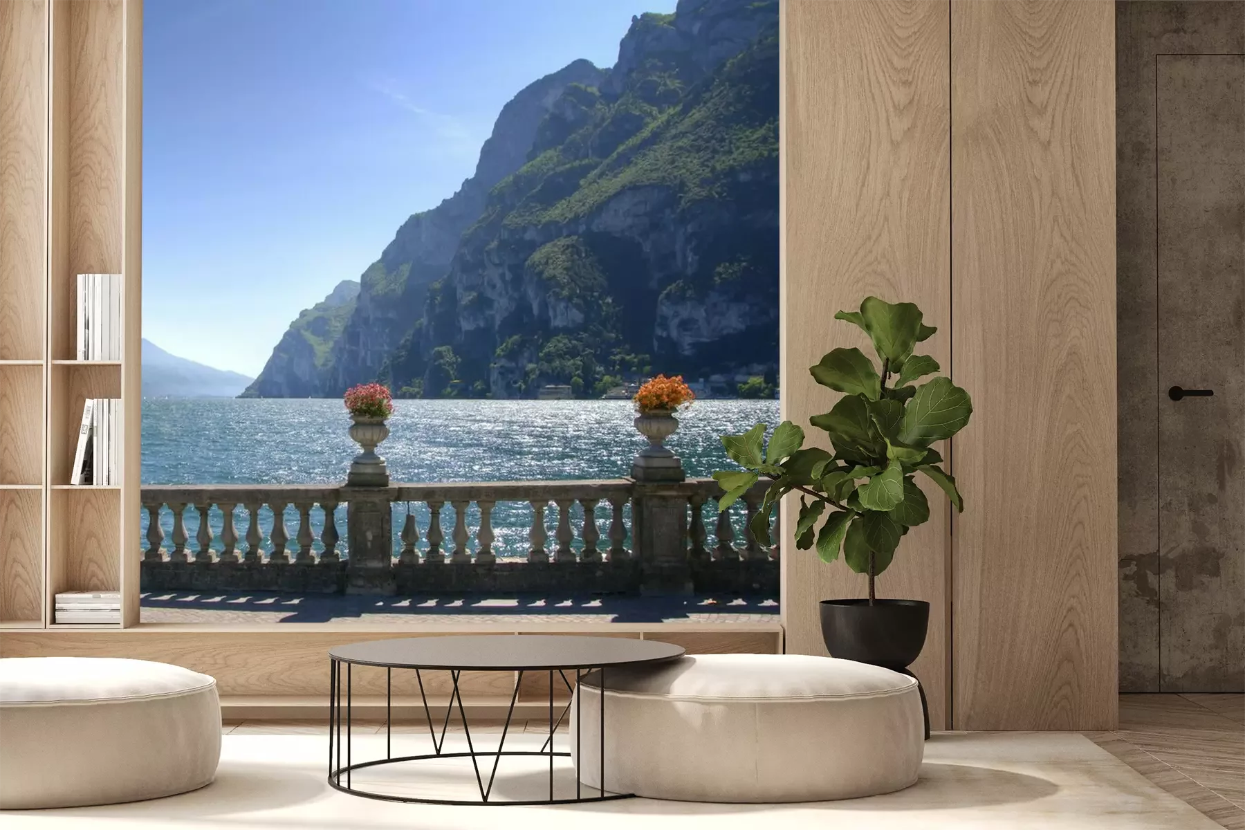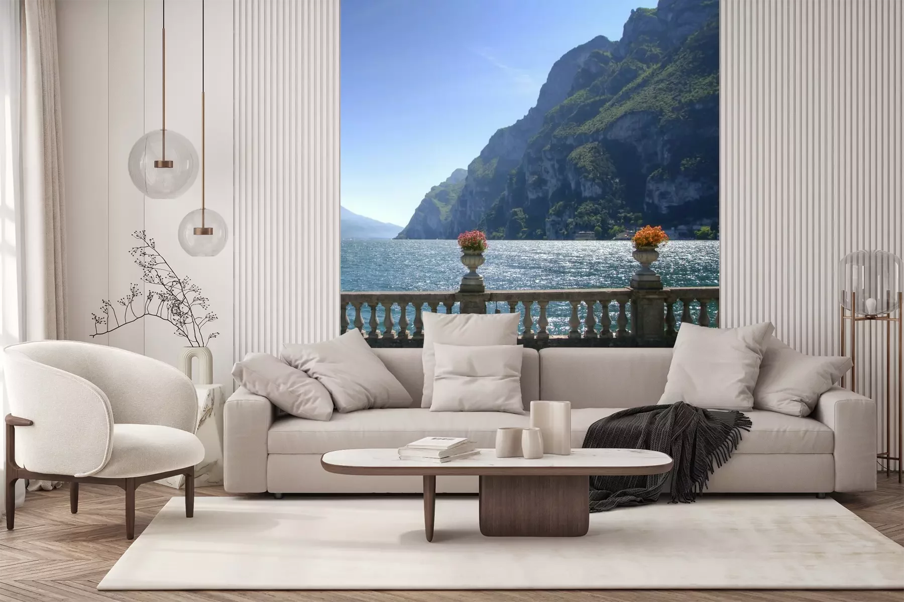 Fototapete Terrasse mit Aussicht auf das Meer und die Berge