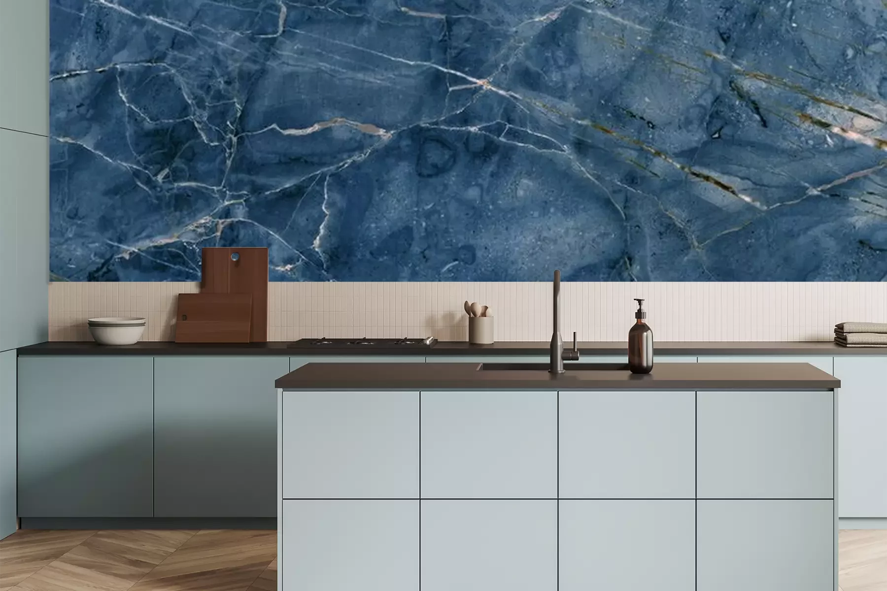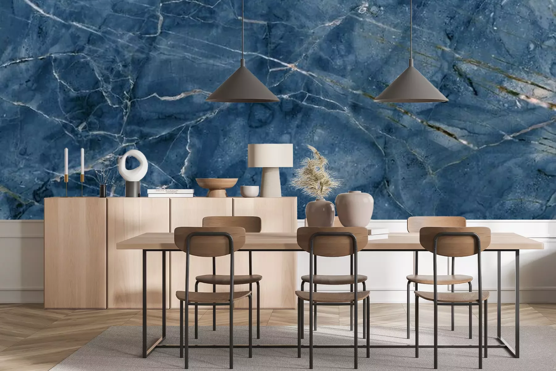 Das Material Premium+ besteht aus einer strukturierten Vinyl-Oberschicht und einem Trägermaterial (Vlies) mit einer Grammatur von 255 g/m², das kleine Unebenheiten der Wand zuverlässig kaschiert. Die feine Sandstruktur verleiht der Oberfläche eine luxuriöse Haptik, während das halbmatte Finish die Tiefe der Farben betont. Das Material ist dampfdurchlässig – so kann diese Fototapete auch in Küchen und Badezimmern eingesetzt werden. Die maximale Breite einer Tapetenbahn beträgt 100 cm. Bei größeren Abmessungen besteht die Fototapete aus mehreren gleich großen Bahnen. Der Kleber wird direkt auf die Wand aufgetragen, und die Fototapete wird auf Stoß angebracht, was für einen ästhetischen Effekt ohne sichtbare Fugen sorgt. Die Oberfläche ist pflegeleicht und kann bei Bedarf sanft mit einem feuchten Tuch abgewischt werden.