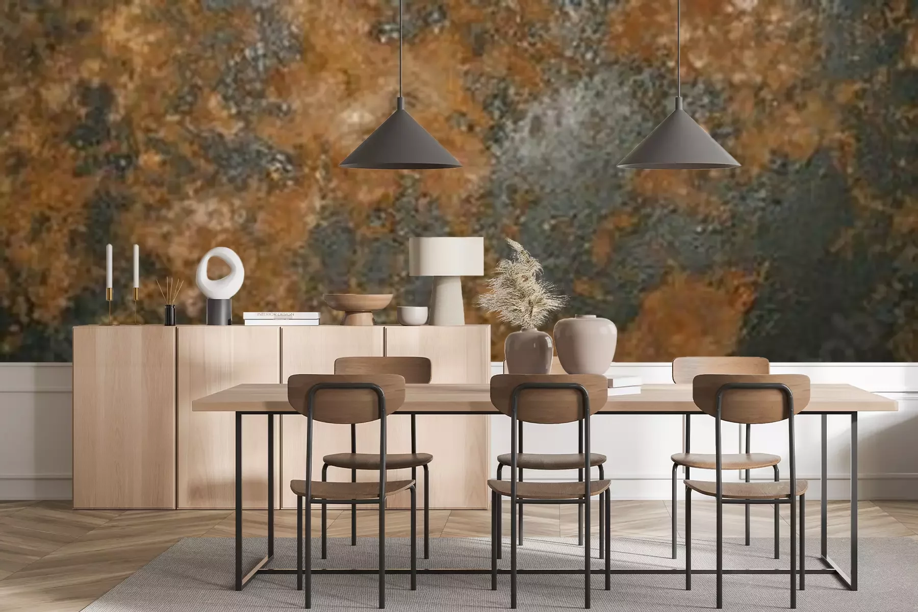 Das Material Premium+ besteht aus einer strukturierten Vinyl-Oberschicht und einem Trägermaterial (Vlies) mit einer Grammatur von 255 g/m², das kleine Unebenheiten der Wand zuverlässig kaschiert. Die feine Sandstruktur verleiht der Oberfläche eine luxuriöse Haptik, während das halbmatte Finish die Tiefe der Farben betont. Das Material ist dampfdurchlässig – so kann diese Fototapete auch in Küchen und Badezimmern eingesetzt werden. Die maximale Breite einer Tapetenbahn beträgt 100 cm. Bei größeren Abmessungen besteht die Fototapete aus mehreren gleich großen Bahnen. Der Kleber wird direkt auf die Wand aufgetragen, und die Fototapete wird auf Stoß angebracht, was für einen ästhetischen Effekt ohne sichtbare Fugen sorgt. Die Oberfläche ist pflegeleicht und kann bei Bedarf sanft mit einem feuchten Tuch abgewischt werden.