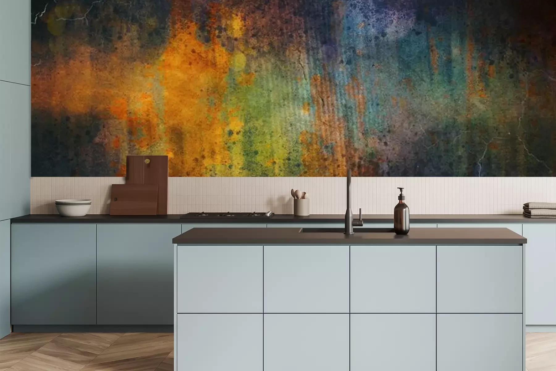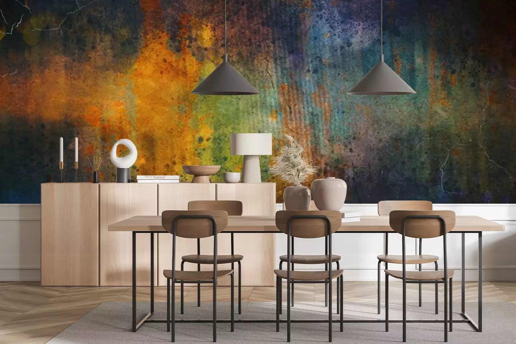 Das Material Premium+ besteht aus einer strukturierten Vinyl-Oberschicht und einem Trägermaterial (Vlies) mit einer Grammatur von 255 g/m², das kleine Unebenheiten der Wand zuverlässig kaschiert. Die feine Sandstruktur verleiht der Oberfläche eine luxuriöse Haptik, während das halbmatte Finish die Tiefe der Farben betont. Das Material ist dampfdurchlässig – so kann diese Fototapete auch in Küchen und Badezimmern eingesetzt werden. Die maximale Breite einer Tapetenbahn beträgt 100 cm. Bei größeren Abmessungen besteht die Fototapete aus mehreren gleich großen Bahnen. Der Kleber wird direkt auf die Wand aufgetragen, und die Fototapete wird auf Stoß angebracht, was für einen ästhetischen Effekt ohne sichtbare Fugen sorgt. Die Oberfläche ist pflegeleicht und kann bei Bedarf sanft mit einem feuchten Tuch abgewischt werden.