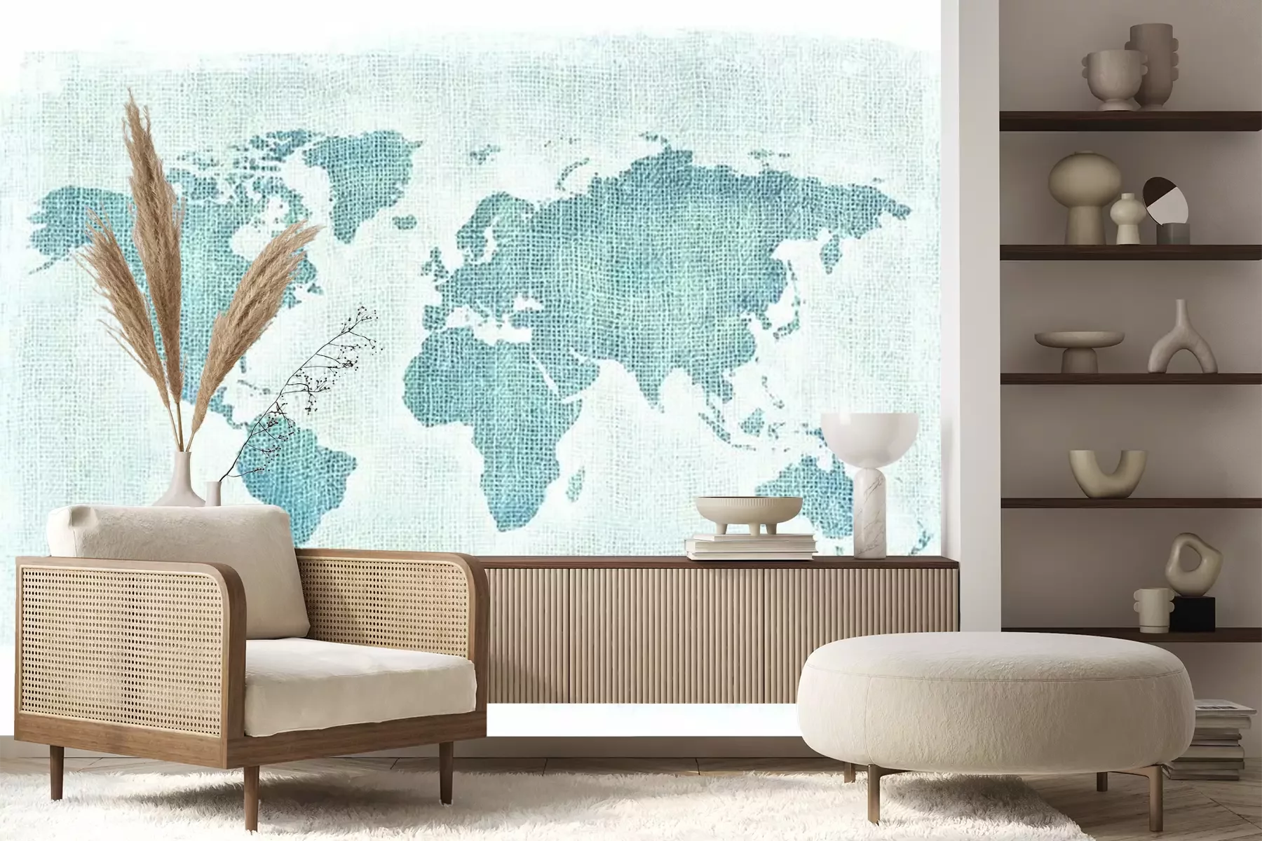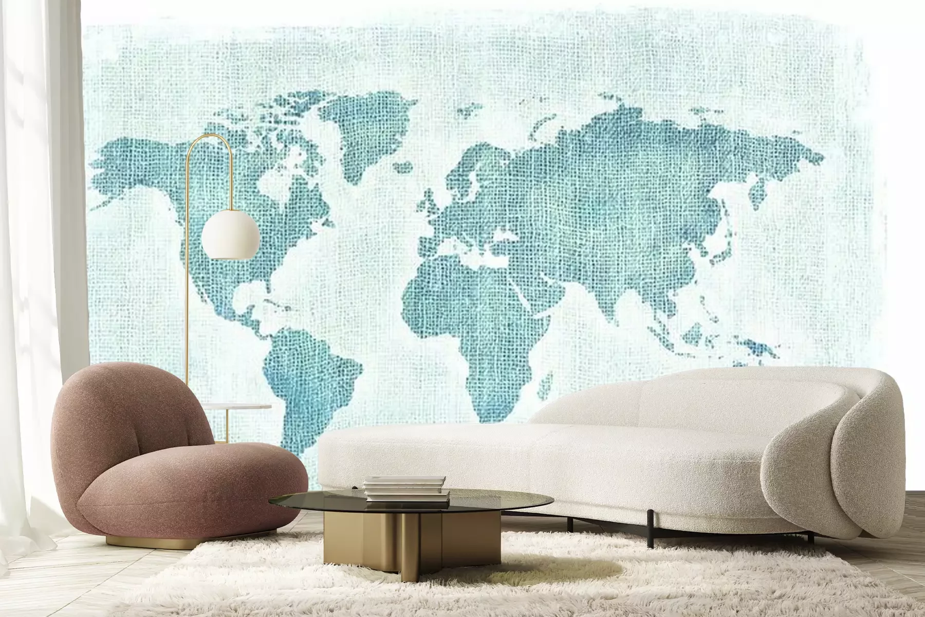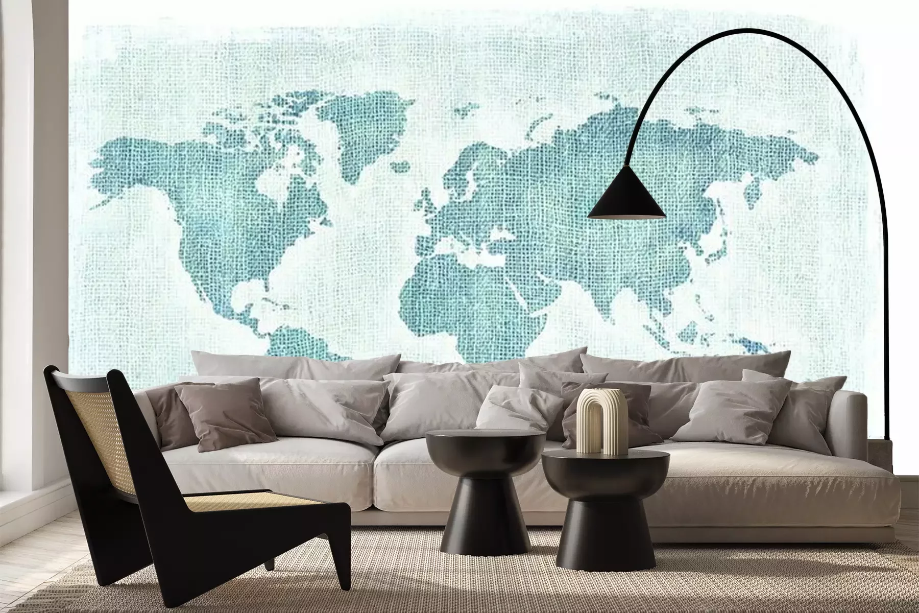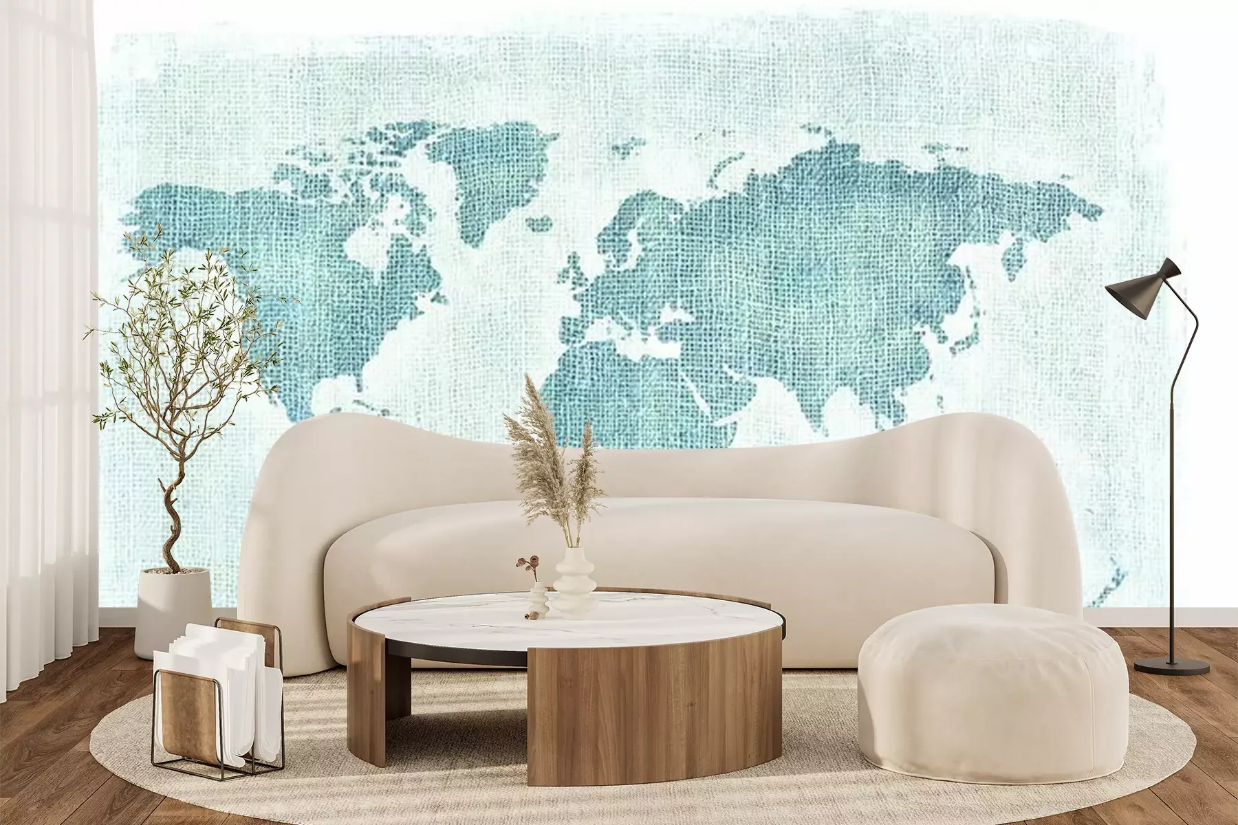 Fototapete Textured illustration of map of the world with burlap linen background. White edges. Vintage style with stained edges.