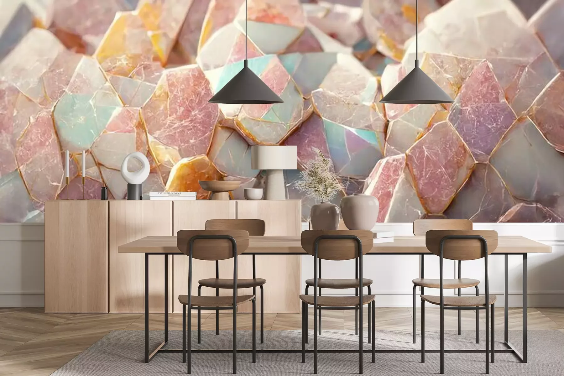 Das Material Premium+ besteht aus einer strukturierten Vinyl-Oberschicht und einem Trägermaterial (Vlies) mit einer Grammatur von 255 g/m², das kleine Unebenheiten der Wand zuverlässig kaschiert. Die feine Sandstruktur verleiht der Oberfläche eine luxuriöse Haptik, während das halbmatte Finish die Tiefe der Farben betont. Das Material ist dampfdurchlässig – so kann diese Fototapete auch in Küchen und Badezimmern eingesetzt werden. Die maximale Breite einer Tapetenbahn beträgt 100 cm. Bei größeren Abmessungen besteht die Fototapete aus mehreren gleich großen Bahnen. Der Kleber wird direkt auf die Wand aufgetragen, und die Fototapete wird auf Stoß angebracht, was für einen ästhetischen Effekt ohne sichtbare Fugen sorgt. Die Oberfläche ist pflegeleicht und kann bei Bedarf sanft mit einem feuchten Tuch abgewischt werden.