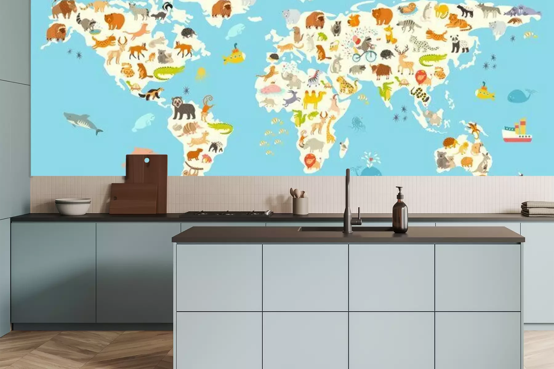 Bunte Weltkarte mit Tieren für KinderFototapete