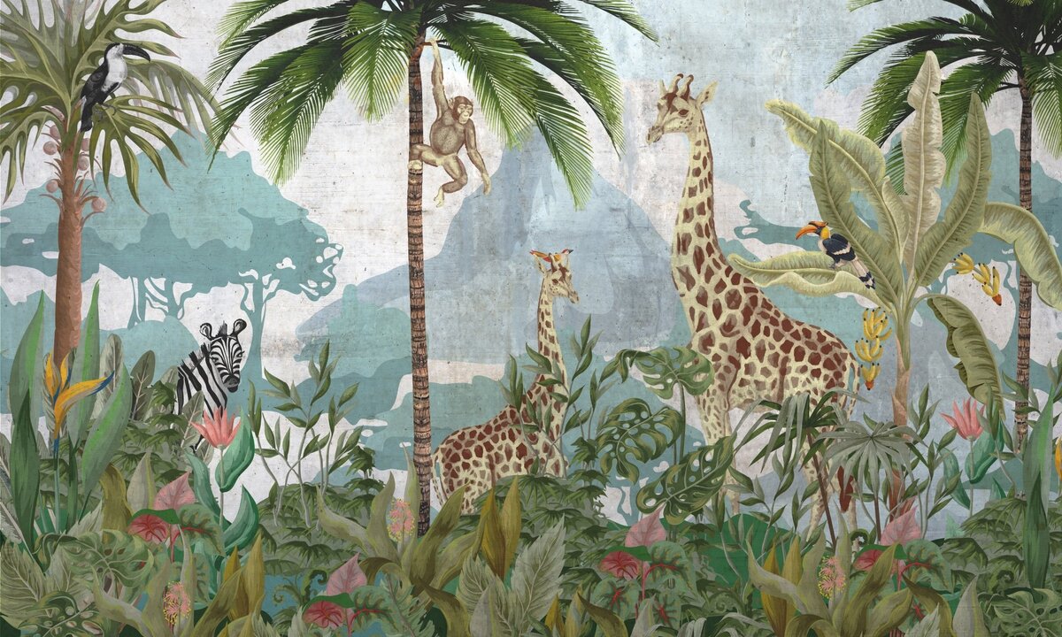 Fototapete: Tiere im tropischen Dschungel mit exotischen Pflanzen