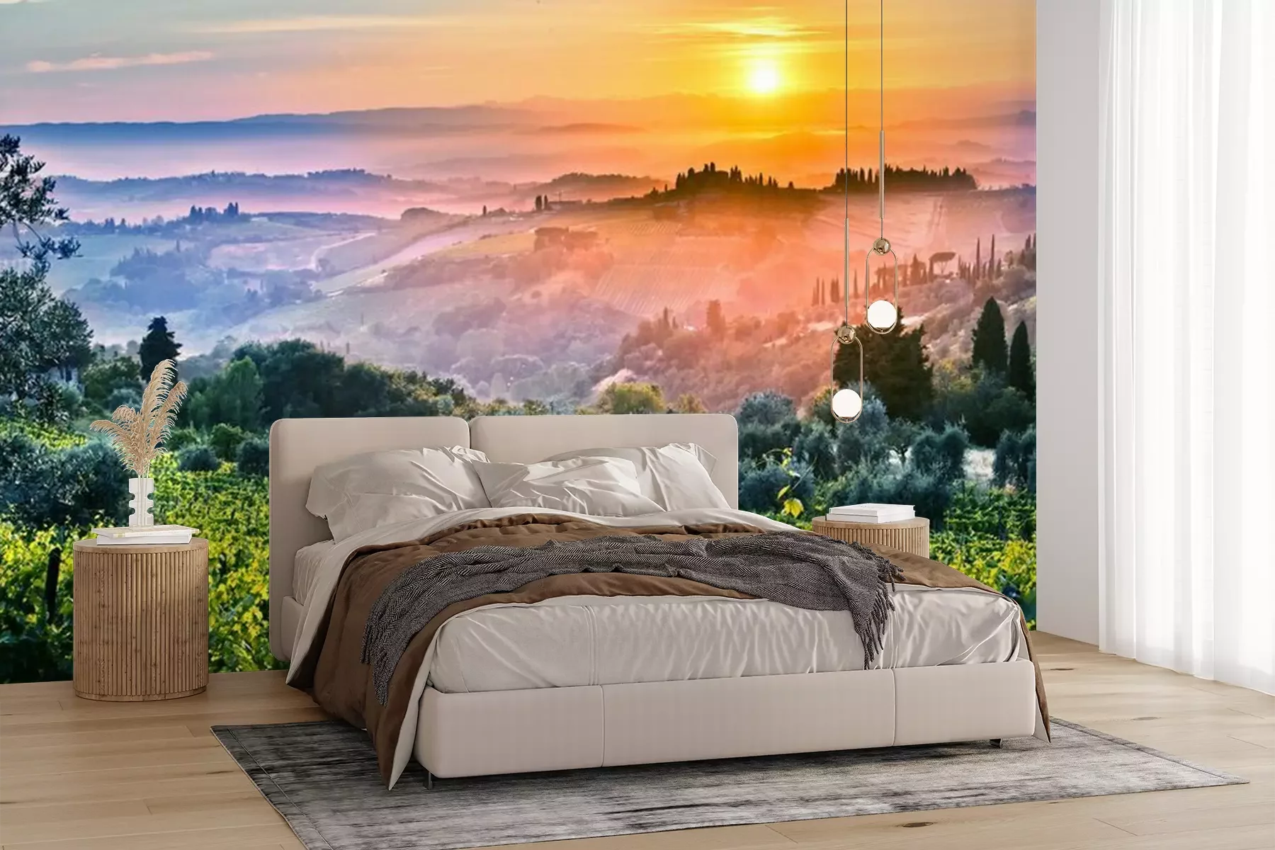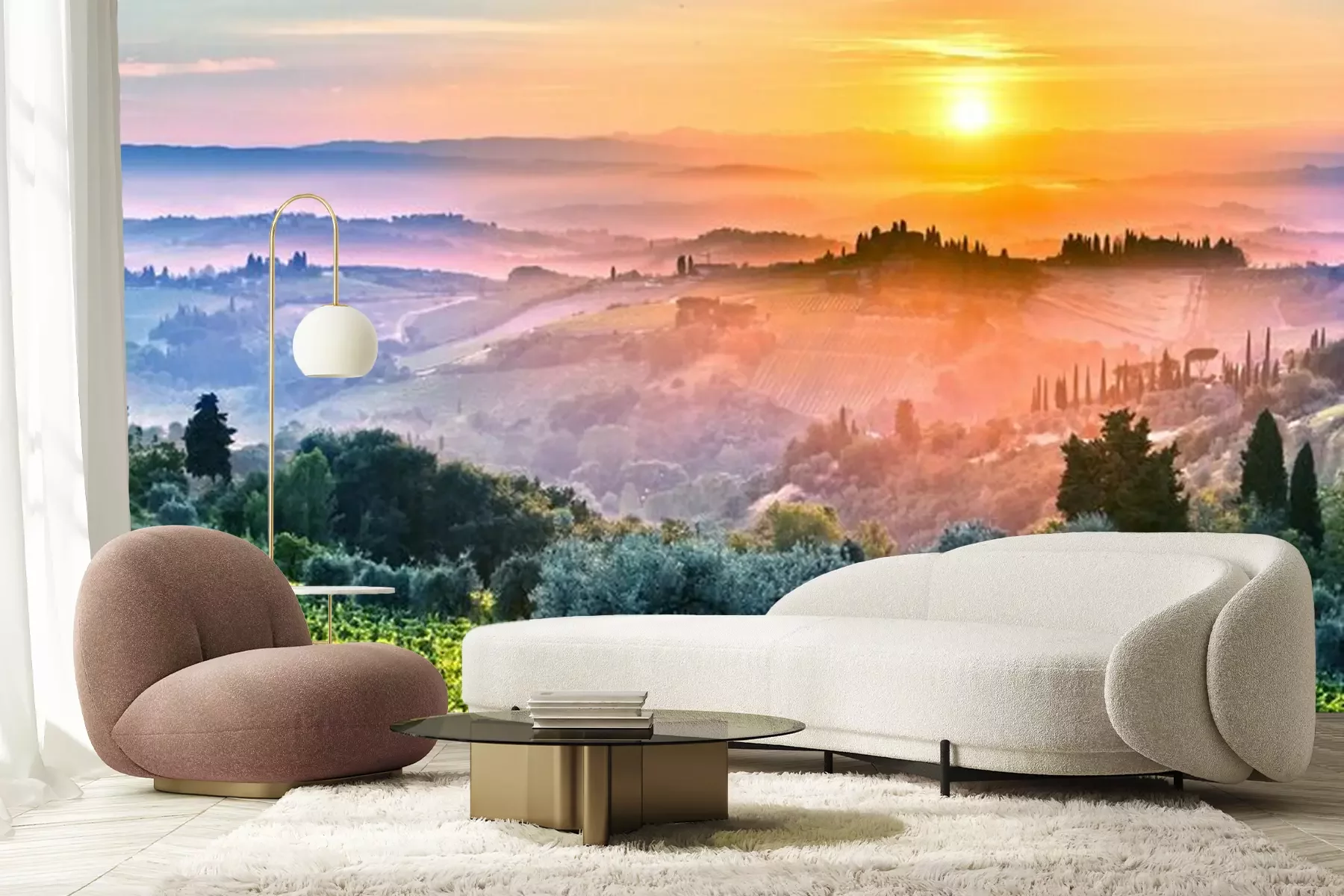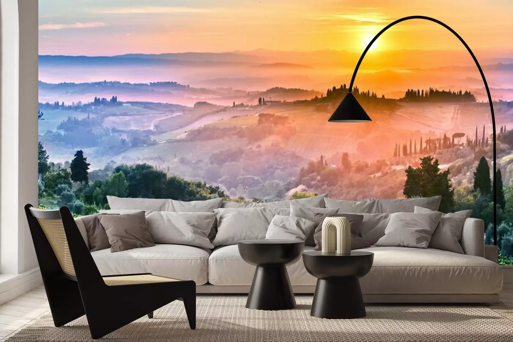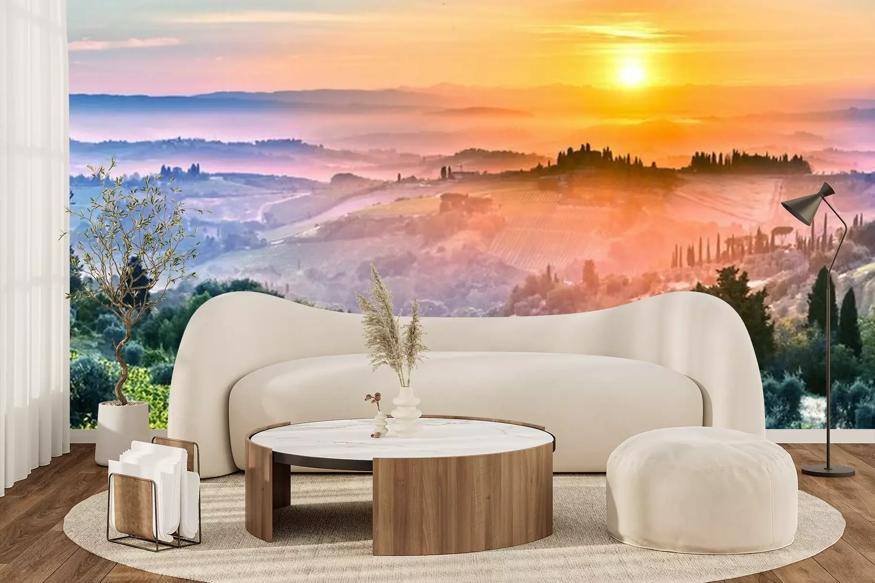 Fototapete Toskana bei Sonnenaufgang am nebligen Tag