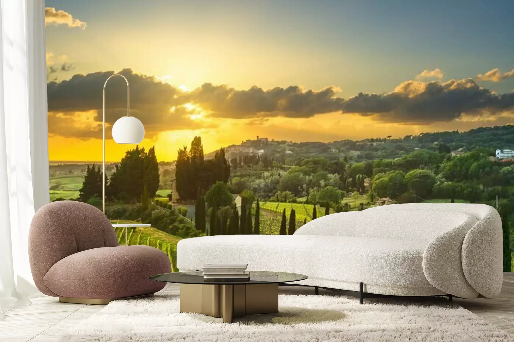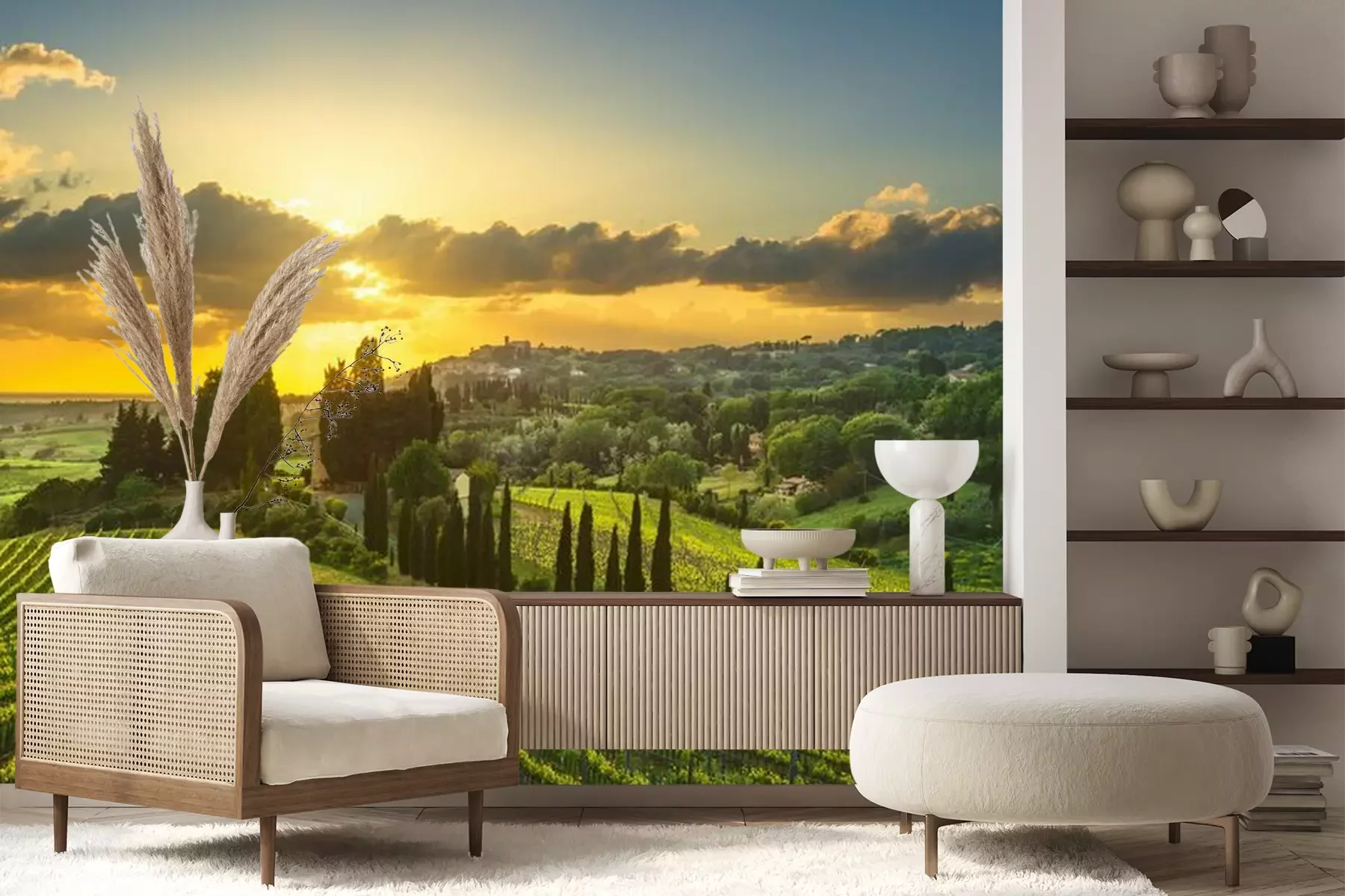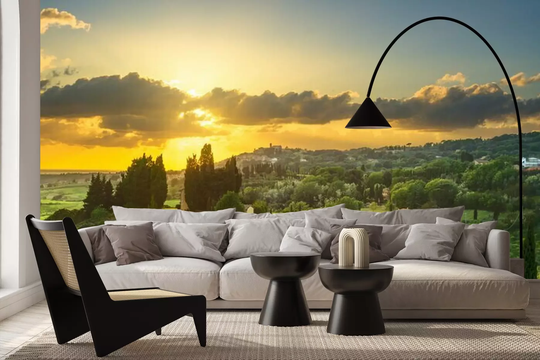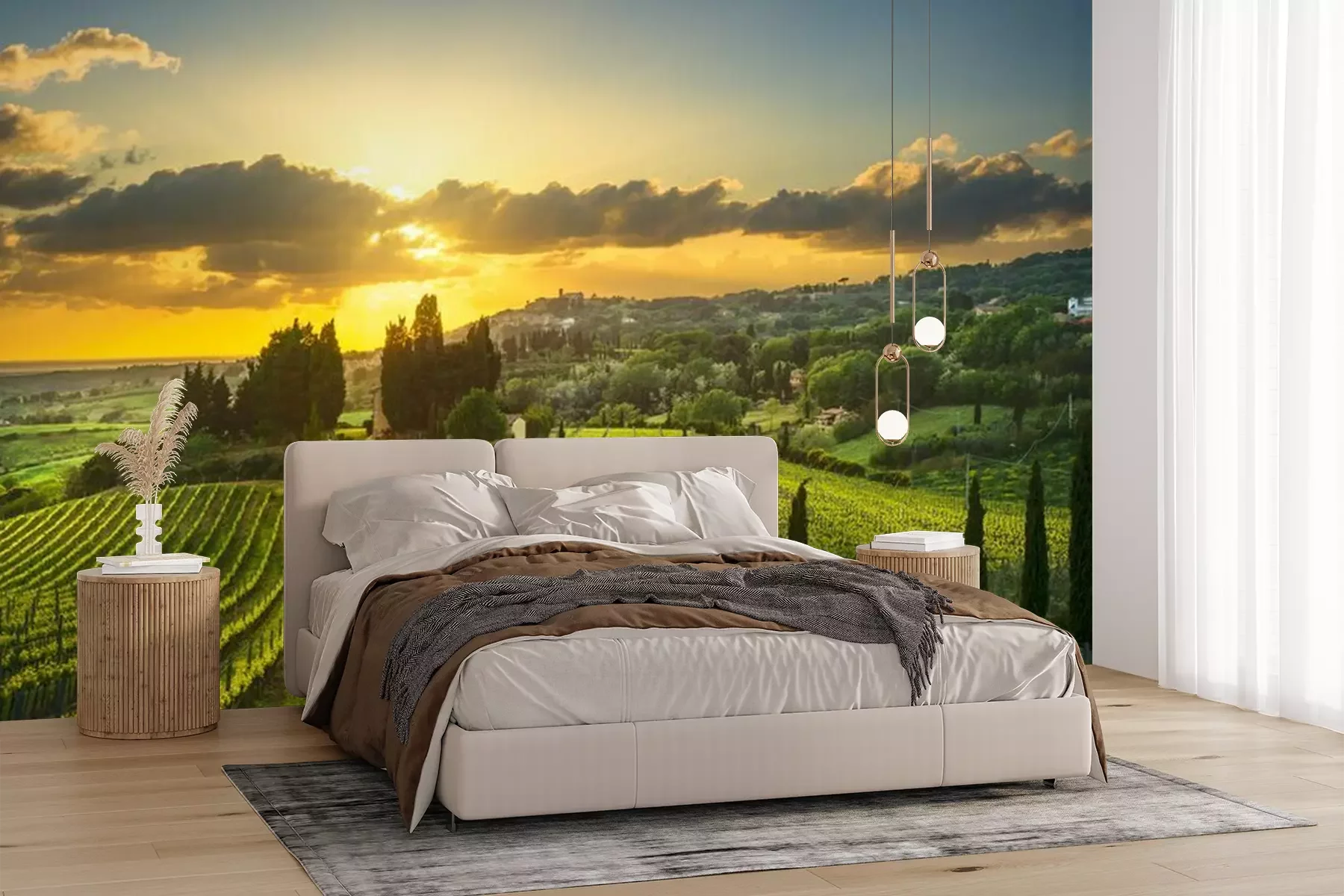 Fototapete Toskana bei Sonnenaufgang mit Wolken