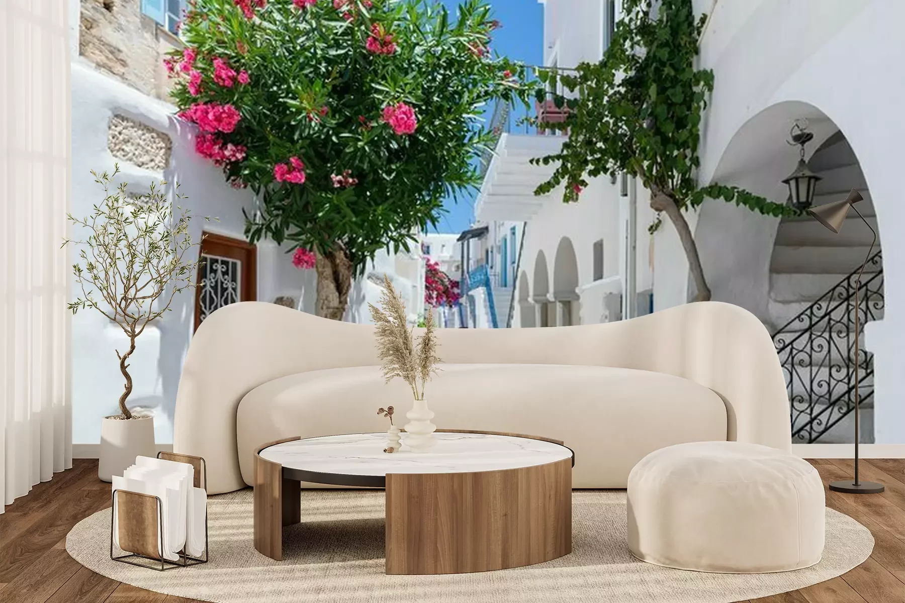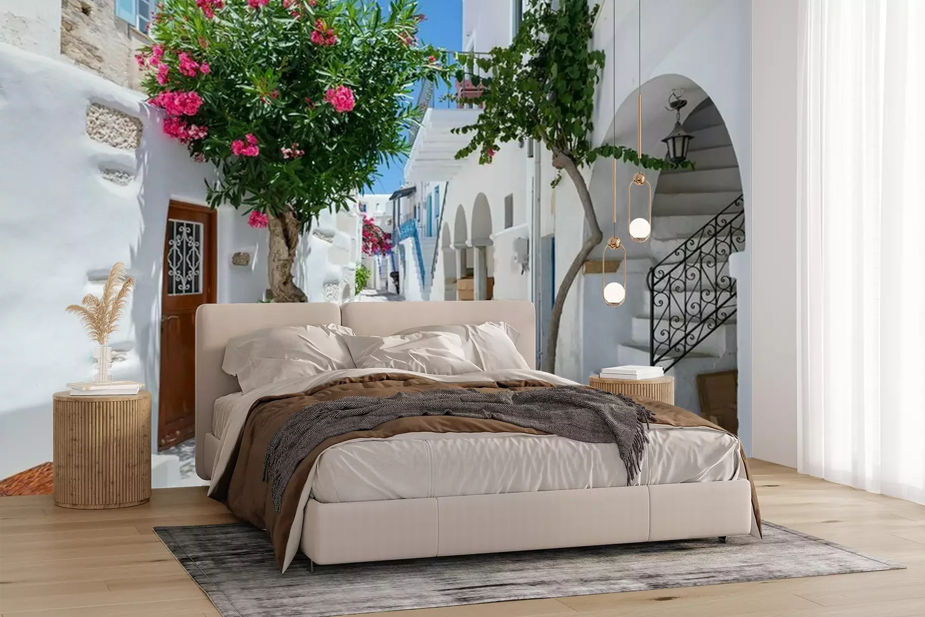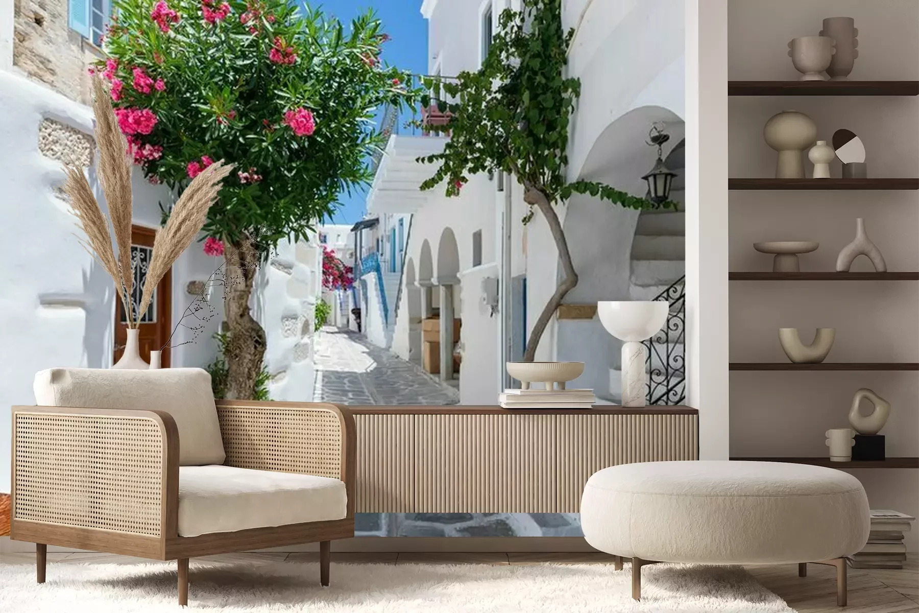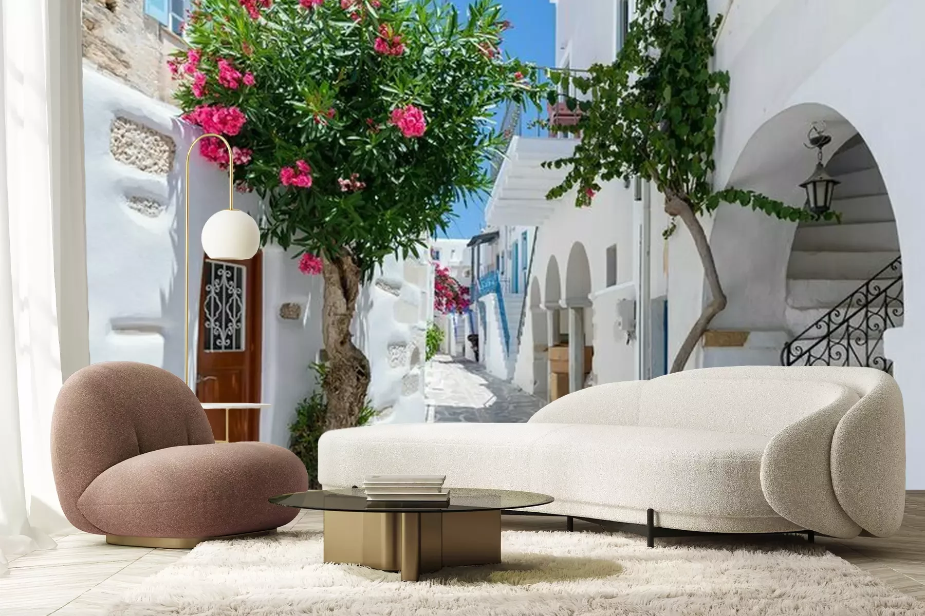 Fototapete Traditionelle weiße Gasse mit bunten Oleander Blumen und farbigen Türen auf den Kykladen in Parikia, Paros, im Sommer, Griechenland
