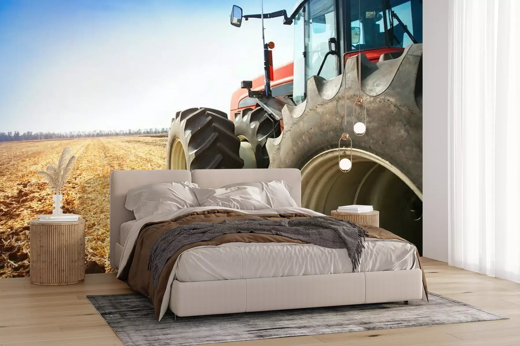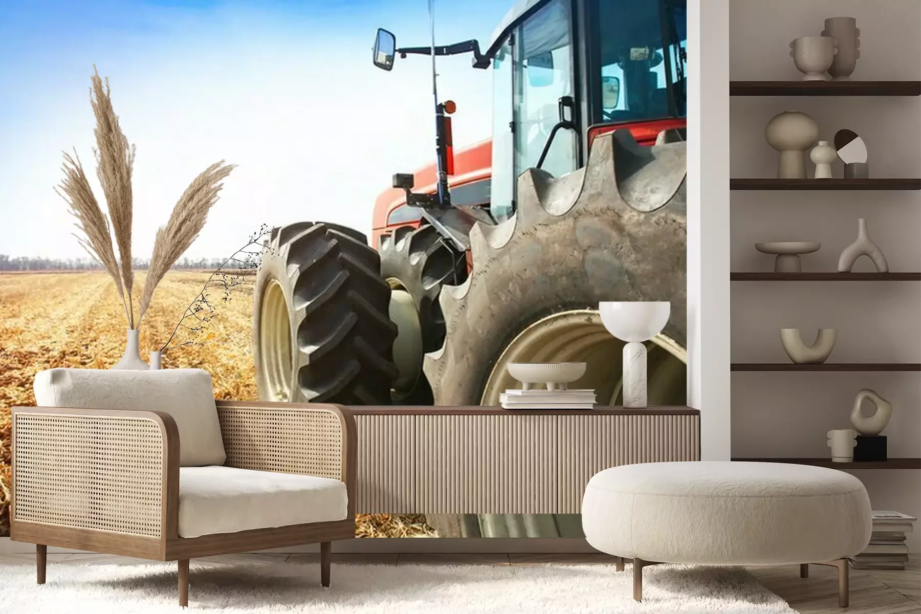 Fototapete Traktor auf dem Feld von hinten