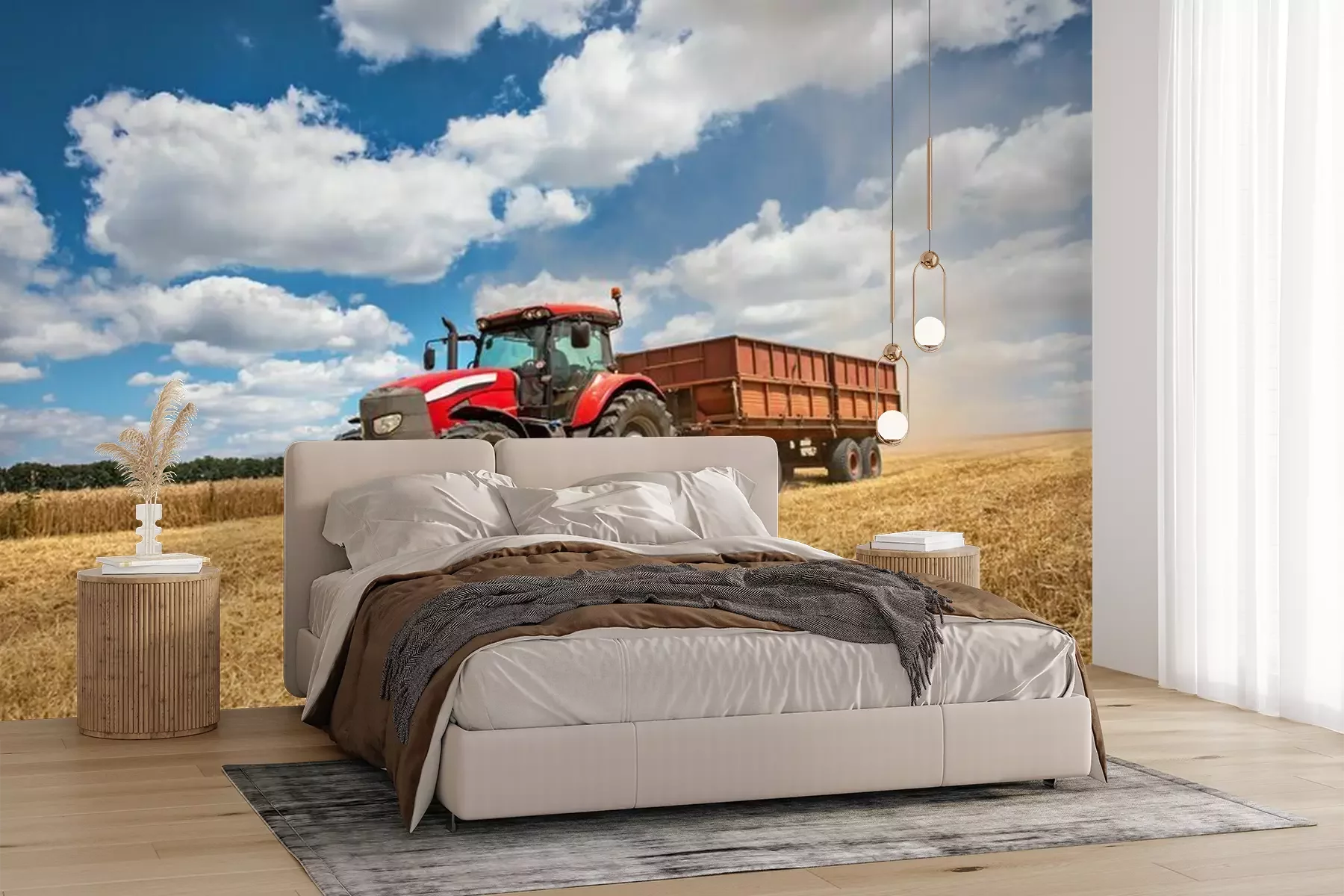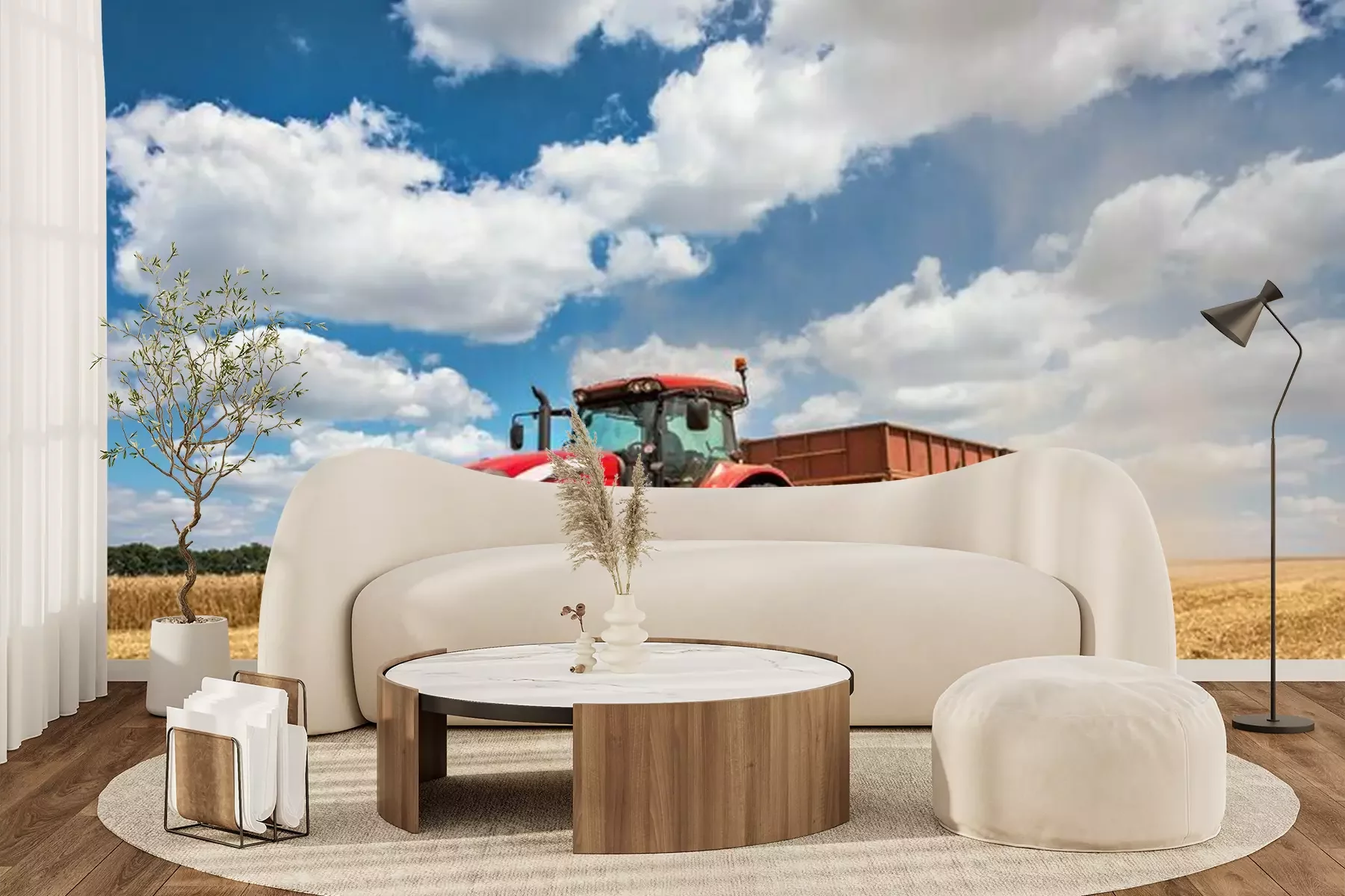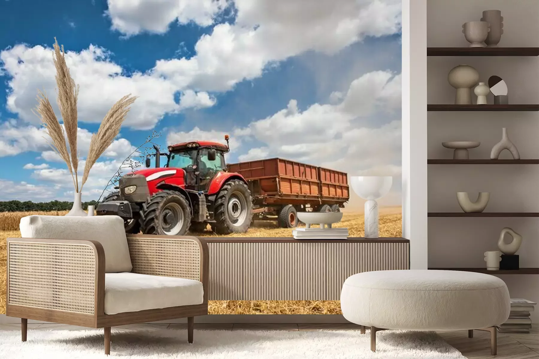 Fototapete Traktor mit Anhänger auf dem Feld