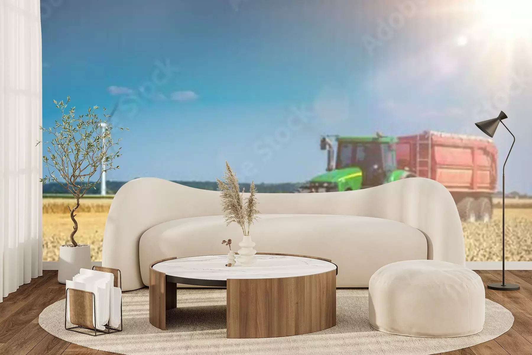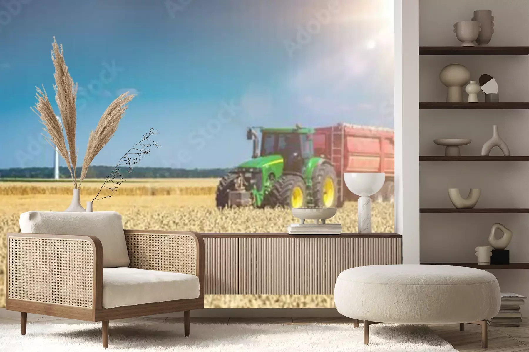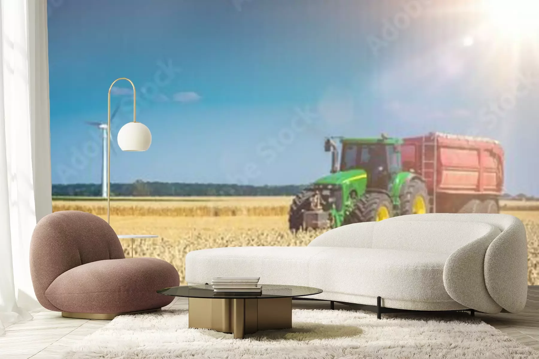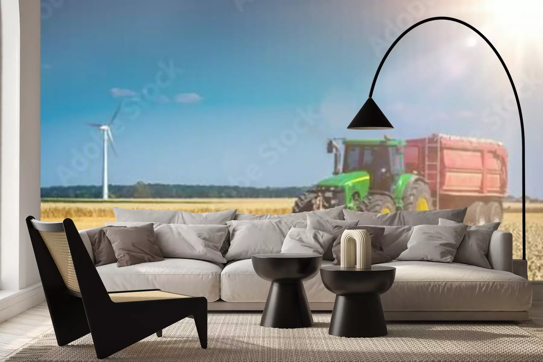 Fototapete Traktor mit einer Windmühle im Hintergrund