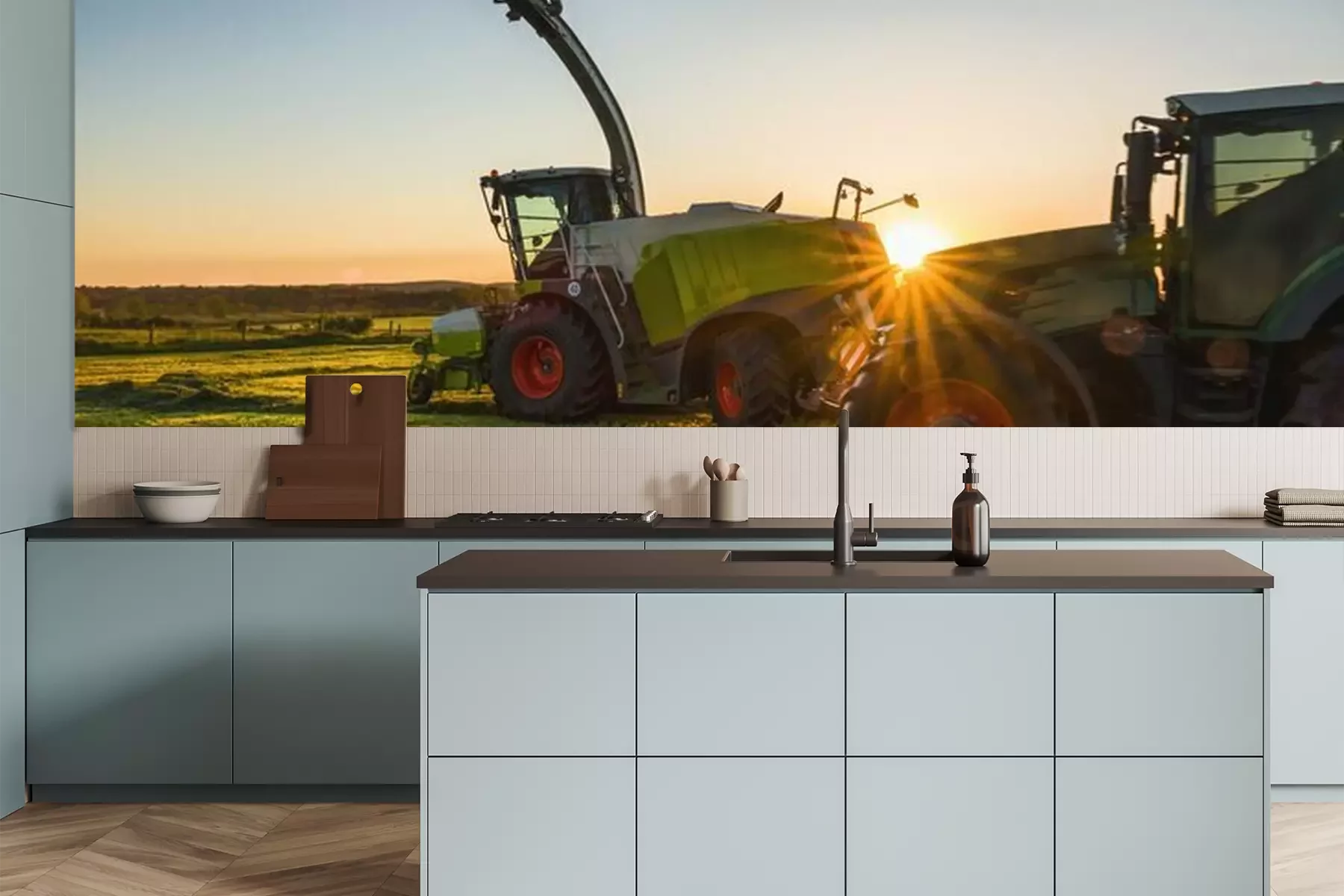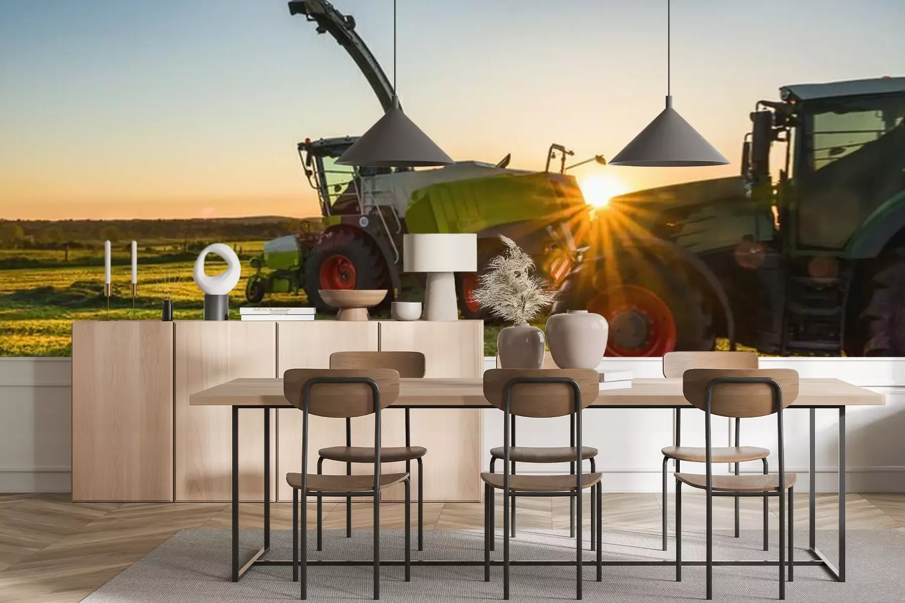 Fototapete Traktor und Erntemaschine bei Sonnenuntergang