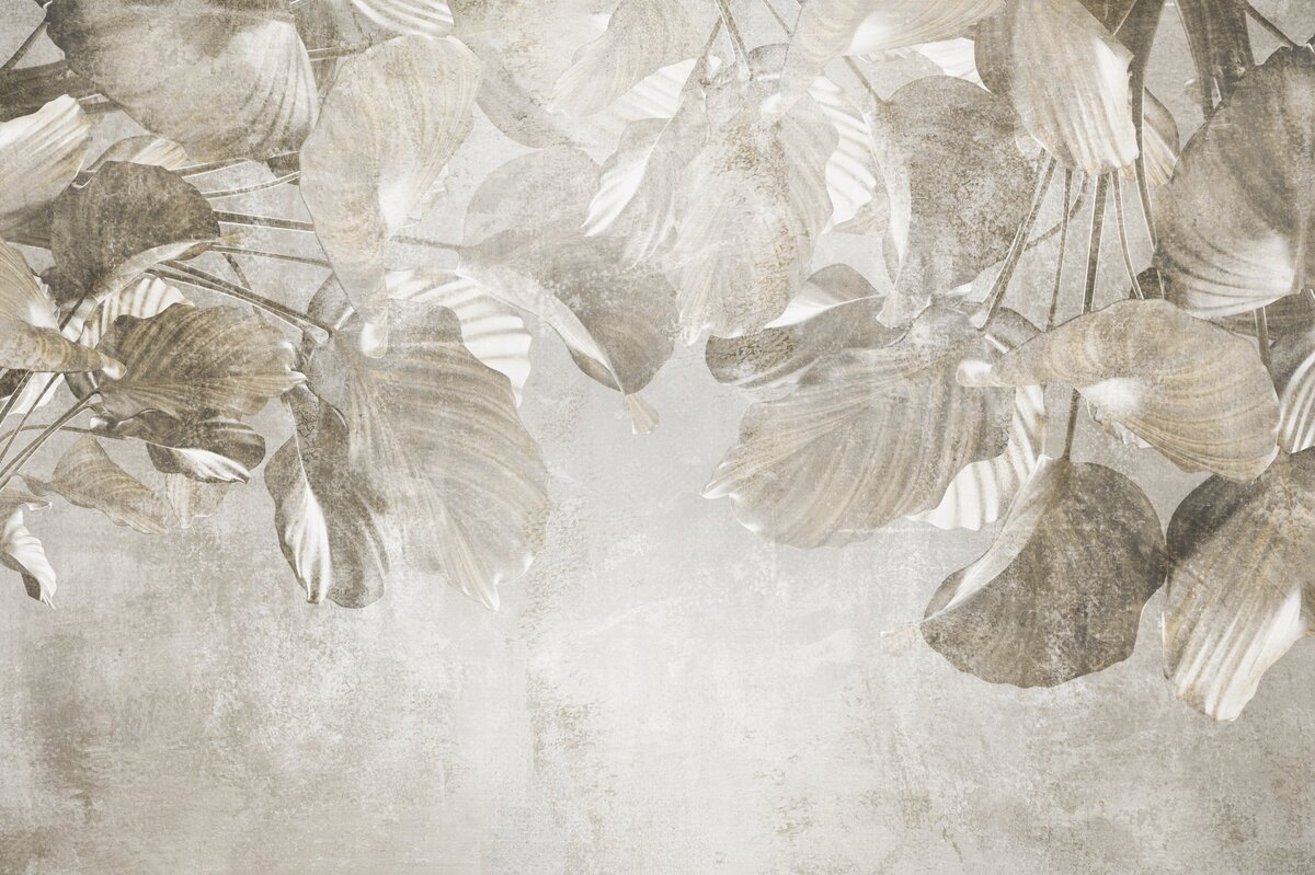 Fototapete: Tropische Blätter auf Beton in Grautönen