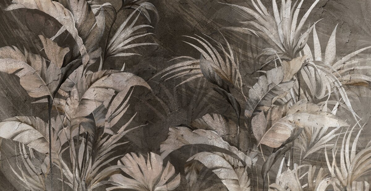 Fototapete: Tropische Blätter vor Betonhintergrund im industriellen Stil