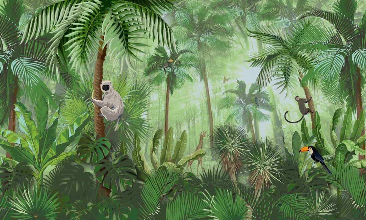 Fototapete: Tropische grüne Vegetation im Dschungel mit Tieren
