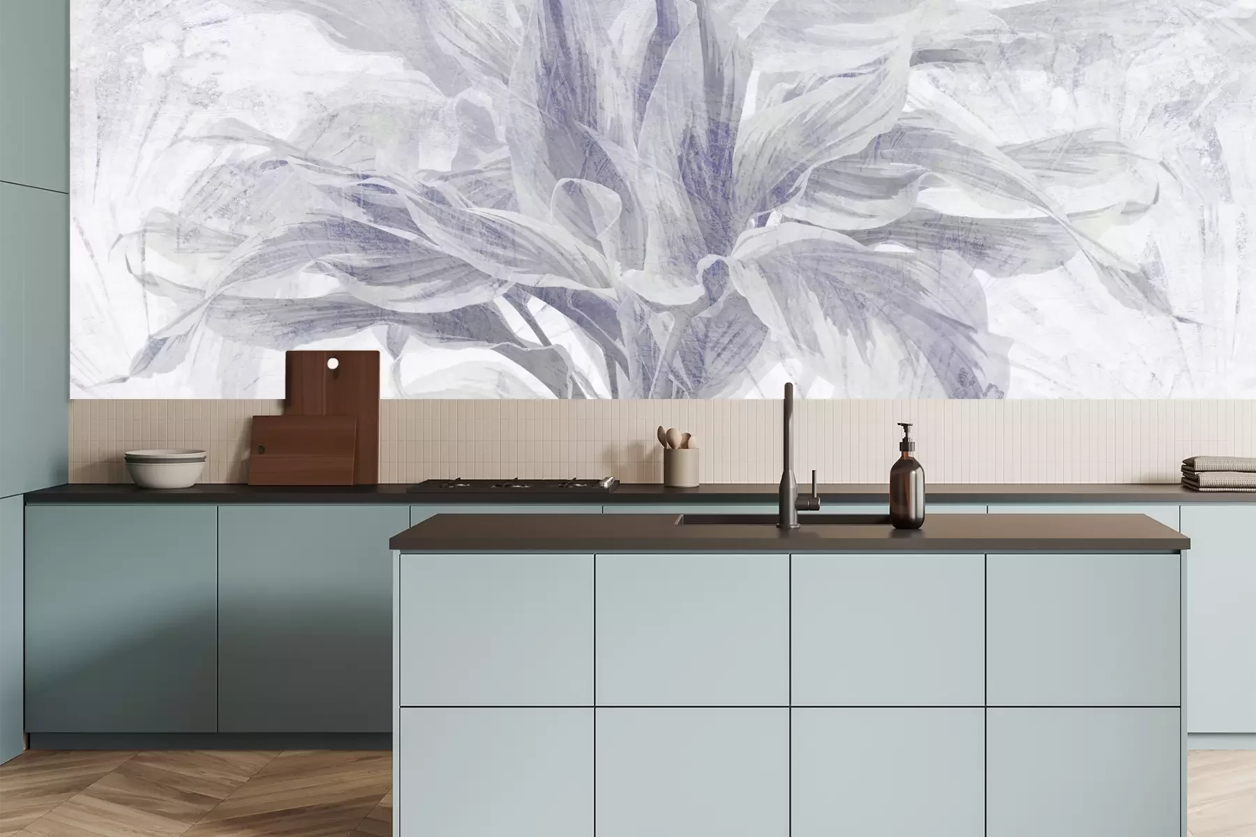Das Material Premium+ besteht aus einer strukturierten Vinyl-Oberschicht und einem Trägermaterial (Vlies) mit einer Grammatur von 255 g/m², das kleine Unebenheiten der Wand zuverlässig kaschiert. Die feine Sandstruktur verleiht der Oberfläche eine luxuriöse Haptik, während das halbmatte Finish die Tiefe der Farben betont. Das Material ist dampfdurchlässig – so kann diese Fototapete auch in Küchen und Badezimmern eingesetzt werden. Die maximale Breite einer Tapetenbahn beträgt 100 cm. Bei größeren Abmessungen besteht die Fototapete aus mehreren gleich großen Bahnen. Der Kleber wird direkt auf die Wand aufgetragen, und die Fototapete wird auf Stoß angebracht, was für einen ästhetischen Effekt ohne sichtbare Fugen sorgt. Die Oberfläche ist pflegeleicht und kann bei Bedarf sanft mit einem feuchten Tuch abgewischt werden.