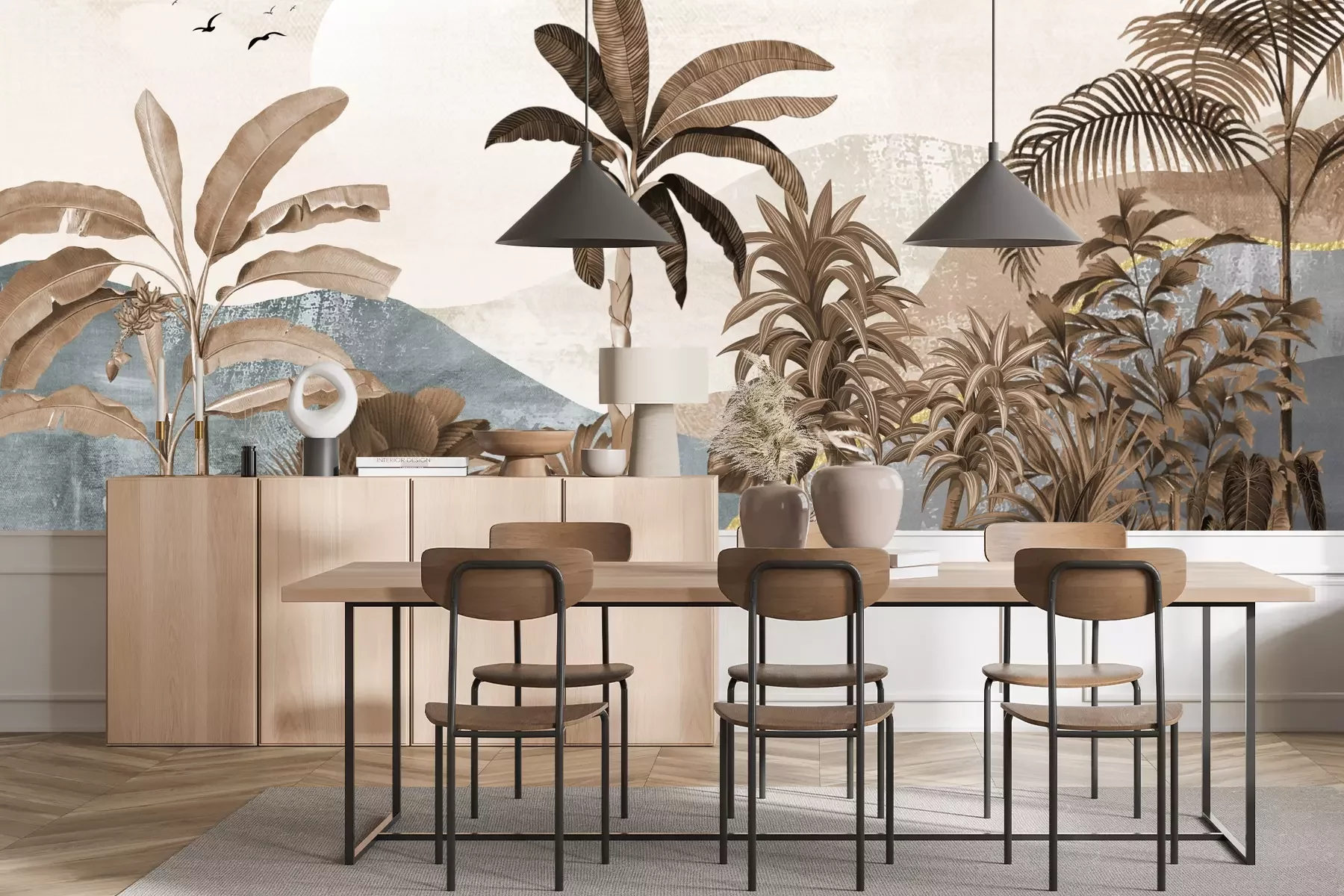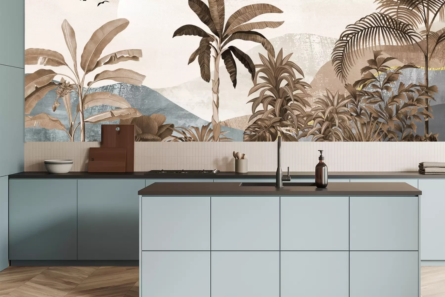 Das Material Premium+ besteht aus einer strukturierten Vinyl-Oberschicht und einem Trägermaterial (Vlies) mit einer Grammatur von 255 g/m², das kleine Unebenheiten der Wand zuverlässig kaschiert. Die feine Sandstruktur verleiht der Oberfläche eine luxuriöse Haptik, während das halbmatte Finish die Tiefe der Farben betont. Das Material ist dampfdurchlässig – so kann diese Fototapete auch in Küchen und Badezimmern eingesetzt werden. Die maximale Breite einer Tapetenbahn beträgt 100 cm. Bei größeren Abmessungen besteht die Fototapete aus mehreren gleich großen Bahnen. Der Kleber wird direkt auf die Wand aufgetragen, und die Fototapete wird auf Stoß angebracht, was für einen ästhetischen Effekt ohne sichtbare Fugen sorgt. Die Oberfläche ist pflegeleicht und kann bei Bedarf sanft mit einem feuchten Tuch abgewischt werden.